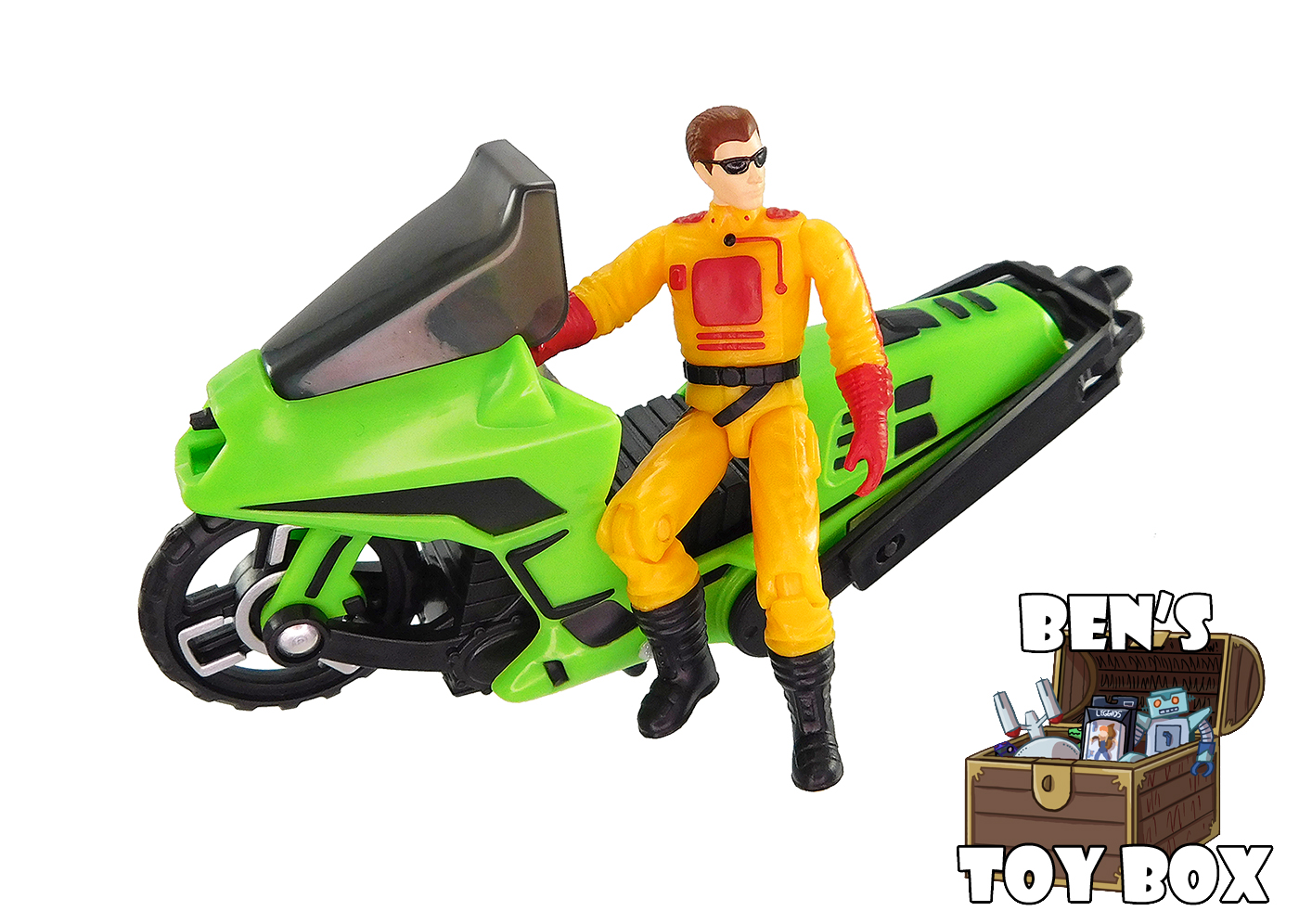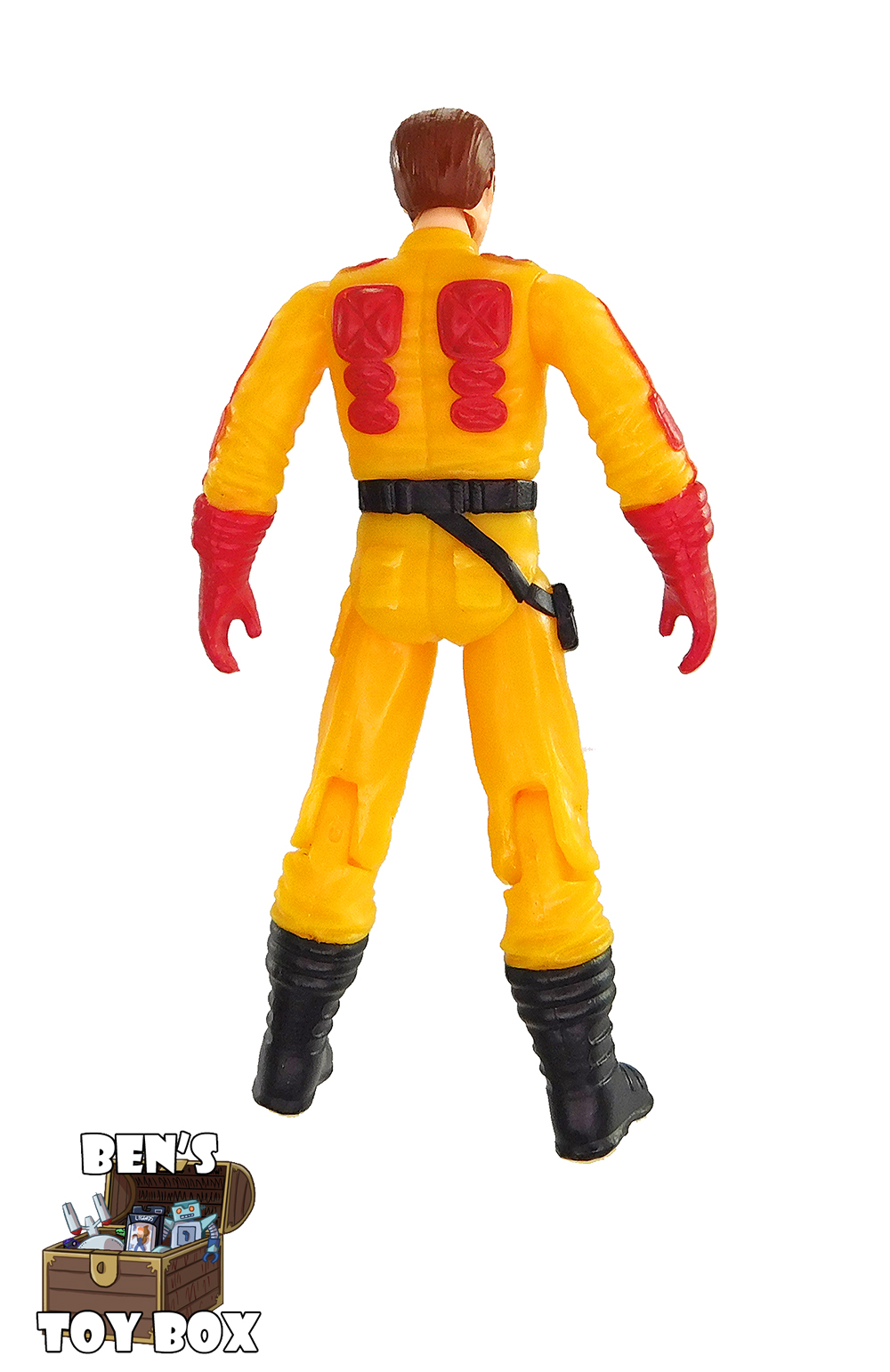 This figure is made of yellow plastic. Red is used to paint parts such as his gloves while black is used on his sunglasses, belt and boots. His head has a flesh tone on the face with brown on the hair.