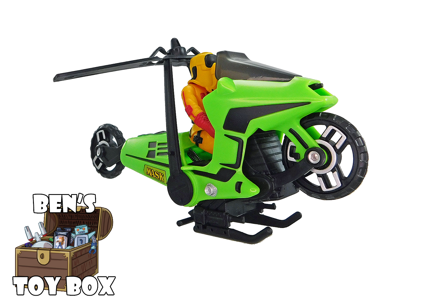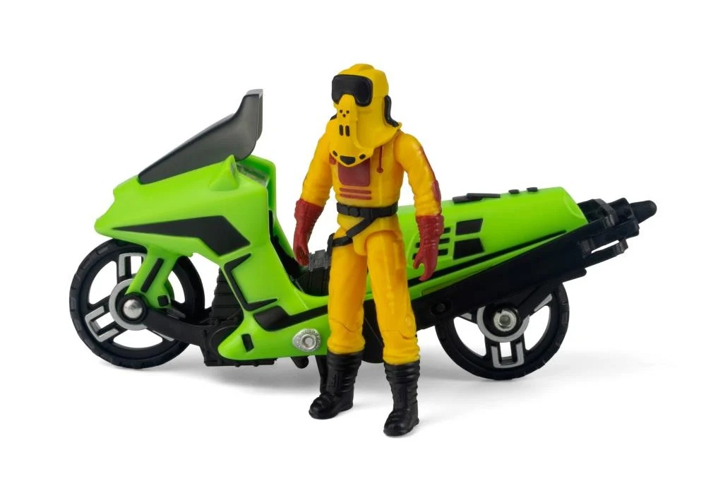 The ultimate covert rider returns! Originally released in 1985, Condor is back—reimagined by The Loyal Subjects with enhanced detailing and nostalgic flair. This green two-wheeler flips into an aerial assault machine in just a few quick steps, bringing vintage action to a new generation of fans. The Loyal Subjects’ M.A.S.K. Condor converts from Covert Assault Cycle to Attack Copter, complete with spinning rotor blades and sleek design. Featuring Brad Turner with his removable mask, this set includes premium upgrades like realistic rubber tires, detailed engine sculpting, and dynamic accessories such as laser bursts and smoke trails.