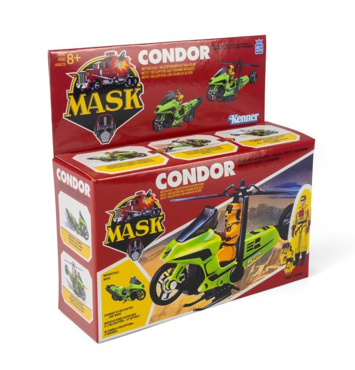 In an effort to stay true to the retro nature of M.A.S.K., The Loyal Subjects have attempted to recreate the original Condor's box as best they can given modern day restrictions. Like the original packaging it is a small, rectangular box with a flap on top. The M.A.S.K. logo is on the top flap and on the front of the box. The name "Condor" is printed in big, bold letters on the flap and the box. The artwork is directly taken from the original packaging and the layout of the photos and artwork are basically the same as the original box. Even the colors are the same with a bold red background, white borders and lettering in various colors including yellow and black.