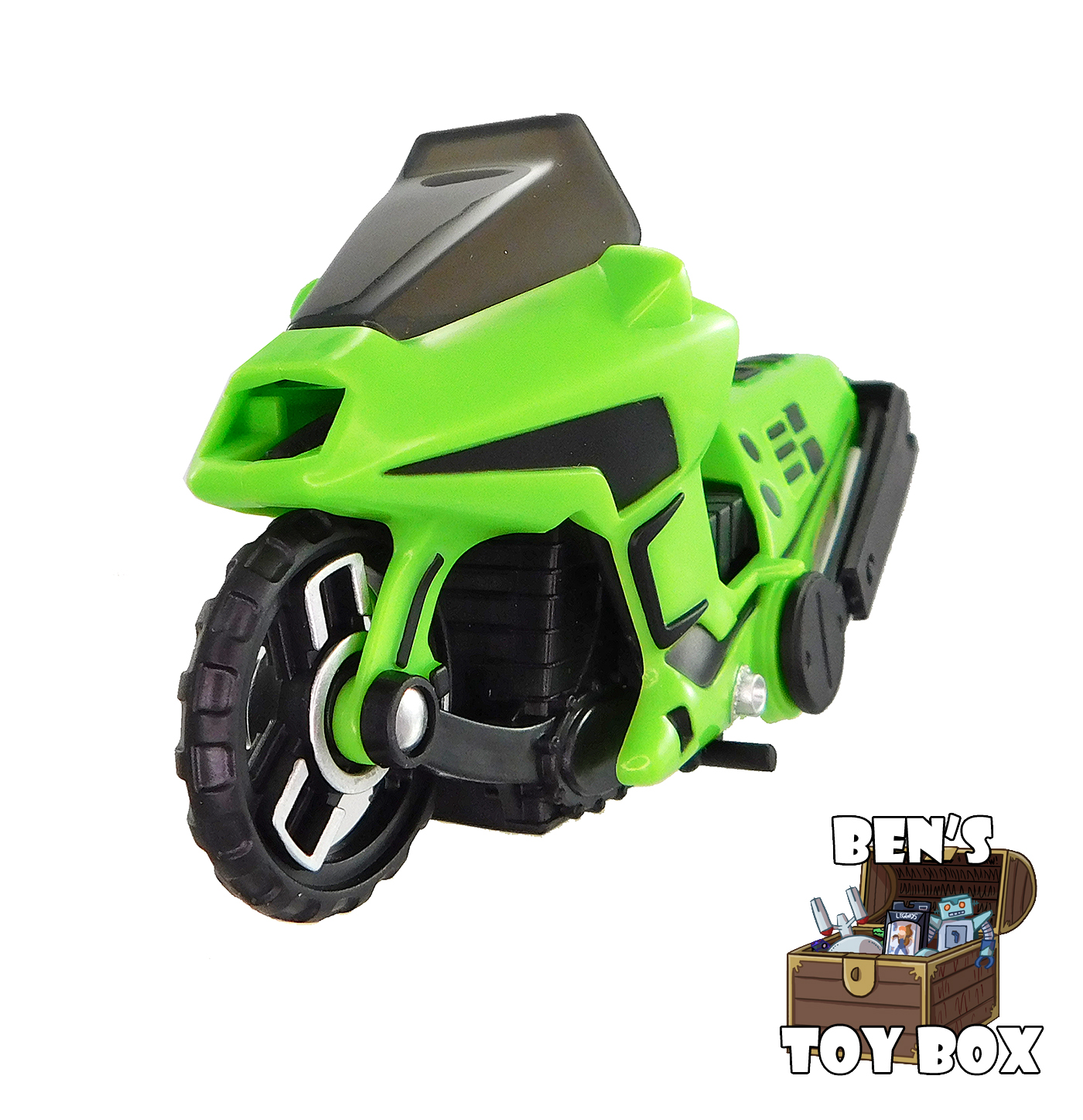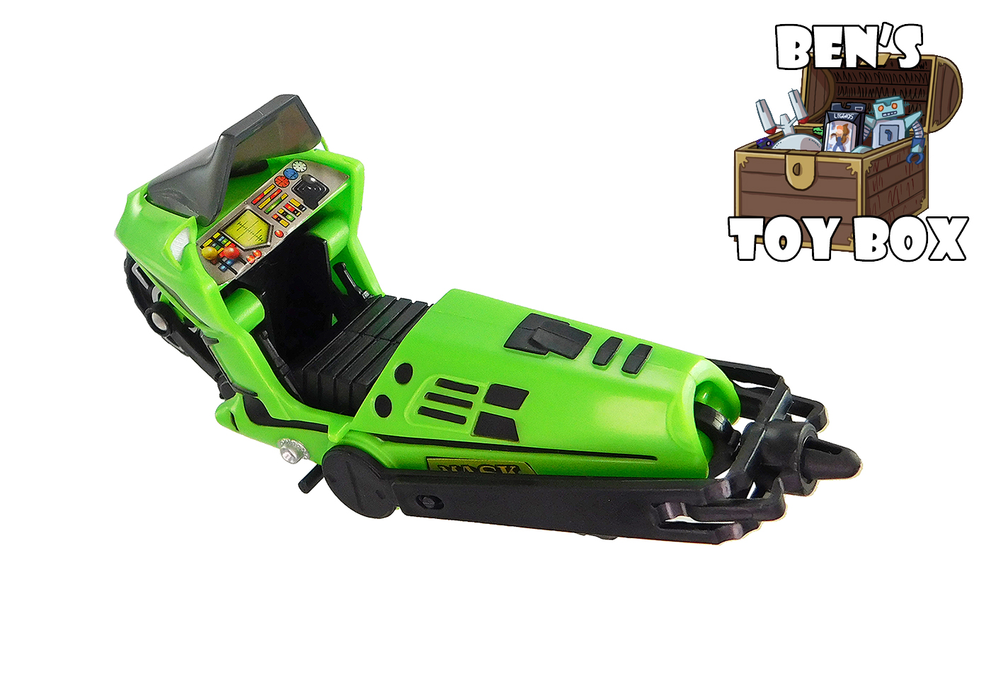This vehicle is made of neon green and black plastic. Green makes up most of the motorcycle's main body with black used for smaller parts like the seat and the wheels. The windshield is a translucent, smokey grey plastic. Paint details are mostly black, using the same pattern as the original including an "L" shaped detail on the sides of the front end and smaller details on the back. A sticker showing a control panel is applied to the dashboard behind the windshield. Like the original vehicle, the sides of the wheels have some vacuum metallized silver, which looks great! All that said, there are a couple differences between the original Condor and this release. Both side view mirrors have been painted with silver to represent the mirrors. Meanwhile a circle detail on either side has also been painted silver whereas they were unpainted on the original. I am glad to see that if the designers had to change something, it was giving this vehicle more detail, not less!