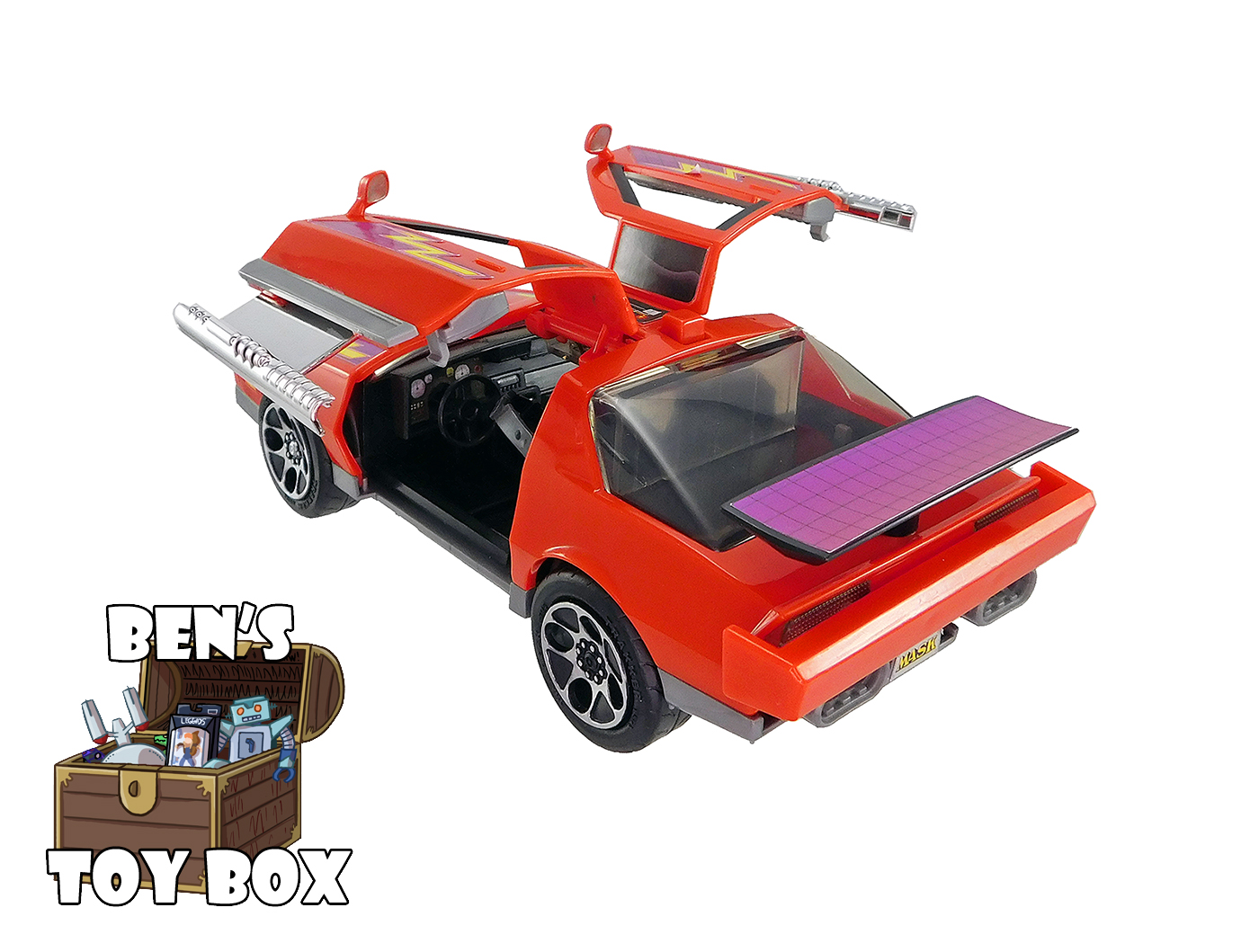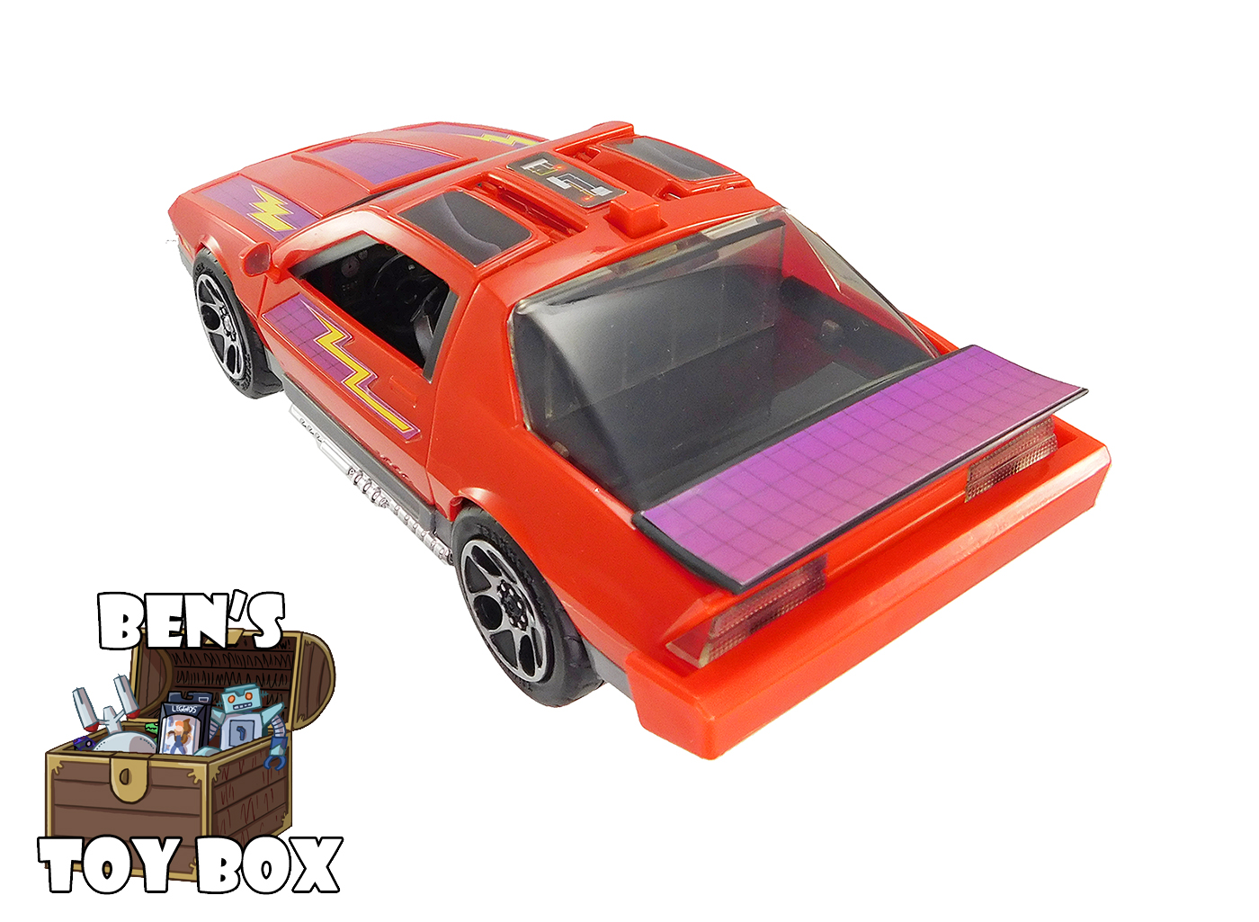 On the top of the vehicle you will see a red button. Press that and a couple things will happen at the same time. The doors will swing open, forming "gull wings" while the spoiler will pop up. The red bar on the rear will move up and the "jet engines" in the back will extend out. Gently pull out the ends of the wings to extend the weapons. The bombs can be stored on the bottom of the vehicle. Finally, slide in the Disc Launcher underneath the front of the car.
