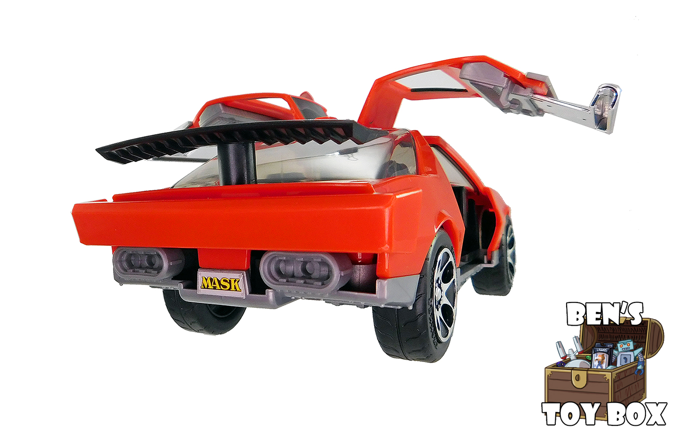 The "Jet Fighter" mode is really more of a "flying car" mode but it is perhaps the vehicle most often associated with the M.A.S.K. toy line as a whole. The "gull wings" do look cool, especially with the weapons extended out on the sides. The "jet engines" in the back do look like futuristic exhaust pipes but it works. I also dig the way the spoiler is raised up, looking almost like it is helping the car fly somehow (hey, this is 80's cartoon scifi, just roll with it).