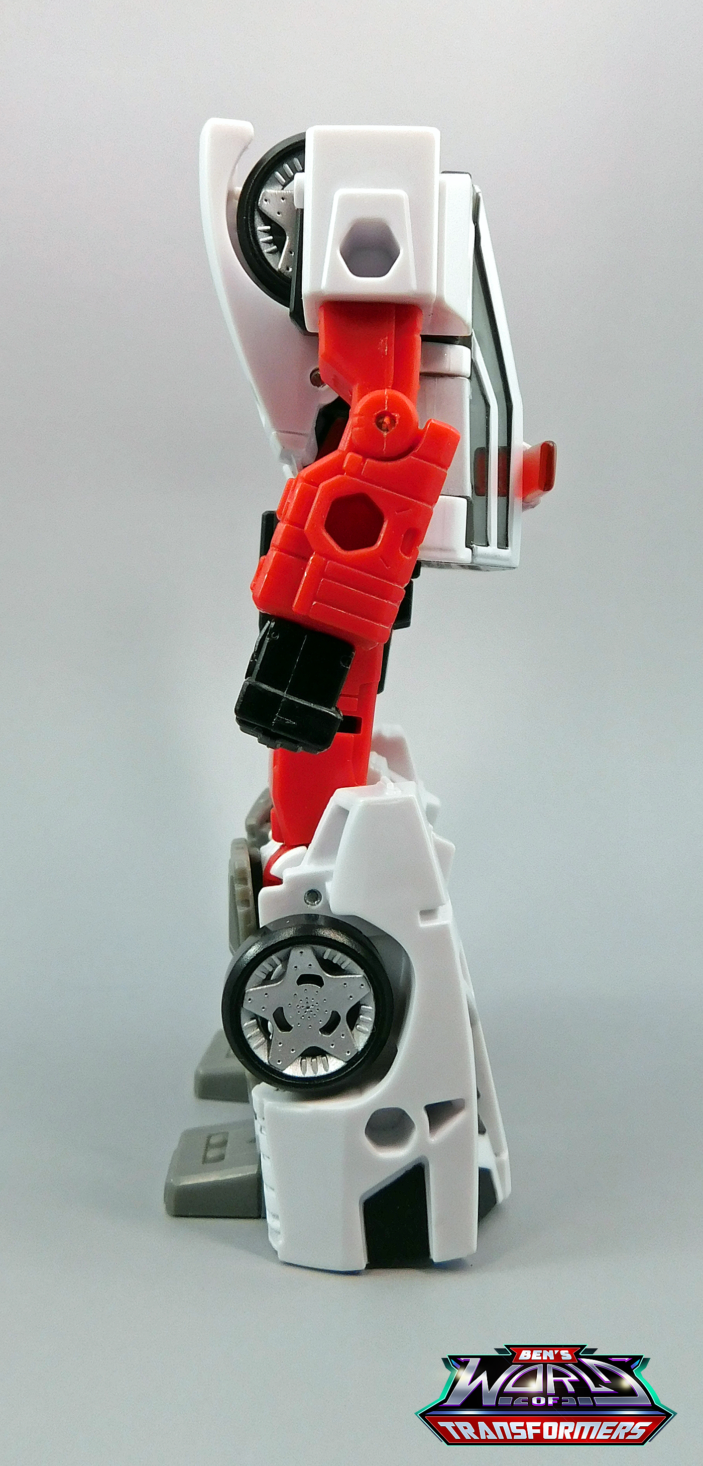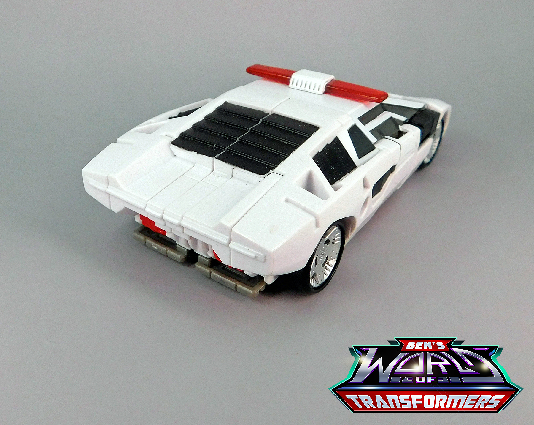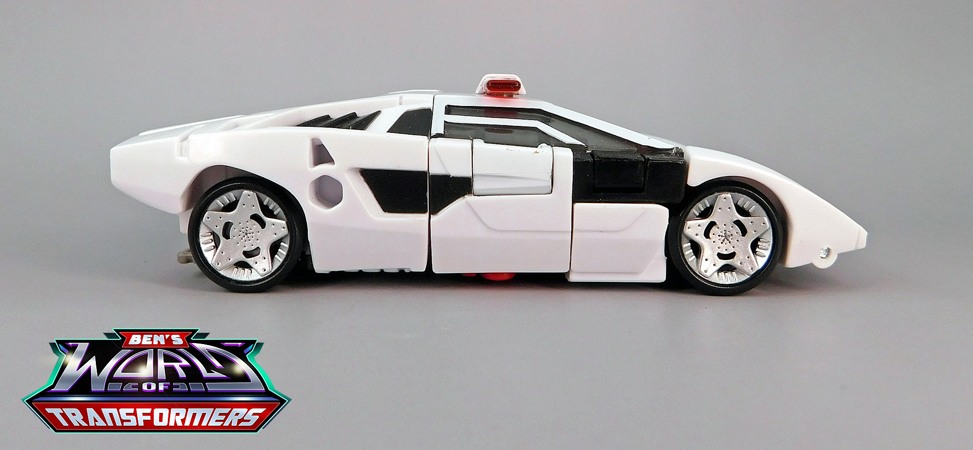 This vehicle mode could have easily been rather boring since the primary color is white. However, some of the black plastic parts from the robot mode peek through here and help break up the white. There are also parts like the vents on the sides painted black that further offer up some color variety. Add to that the red on the lightbar and hood and you have a really striking looking vehicle.