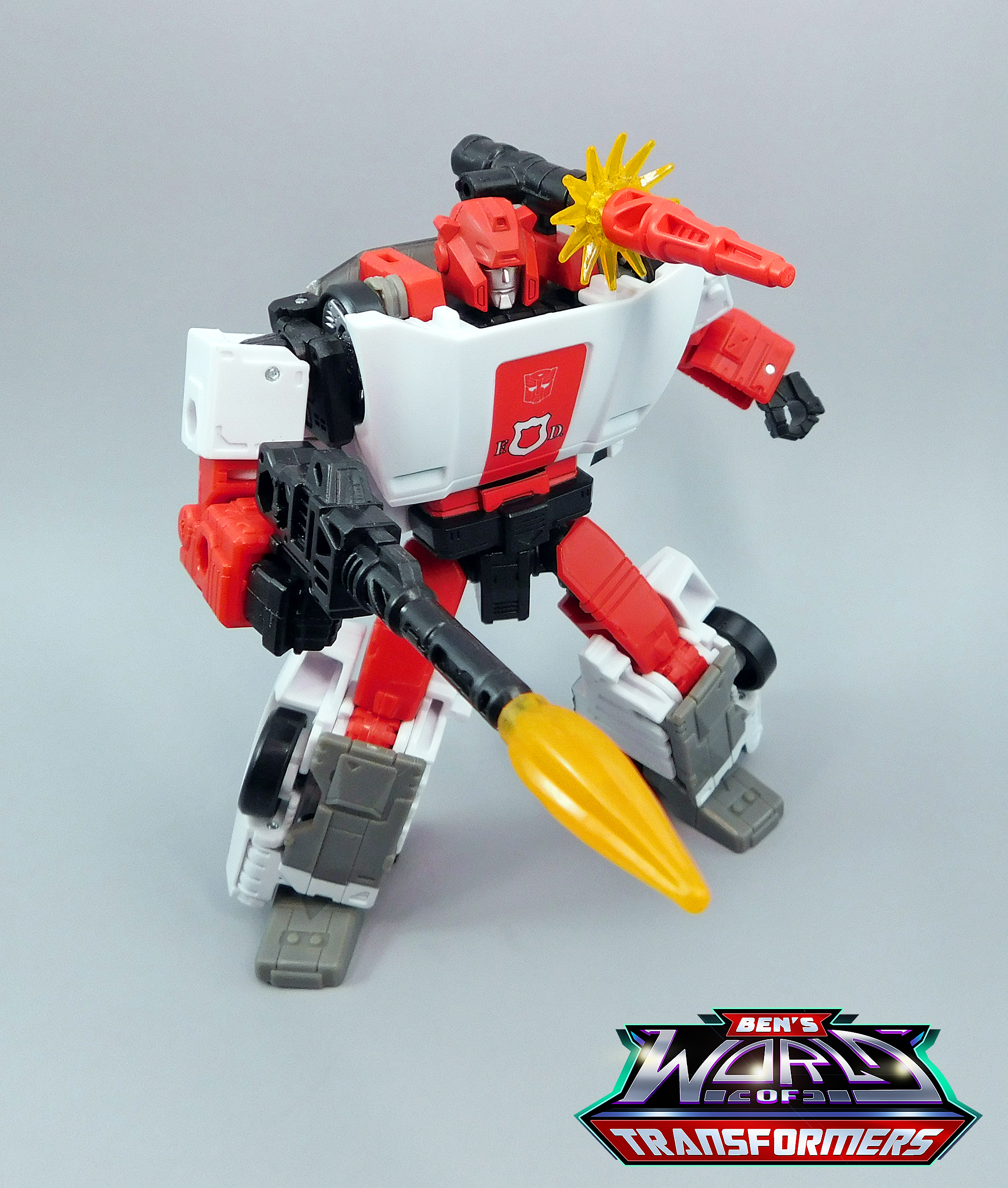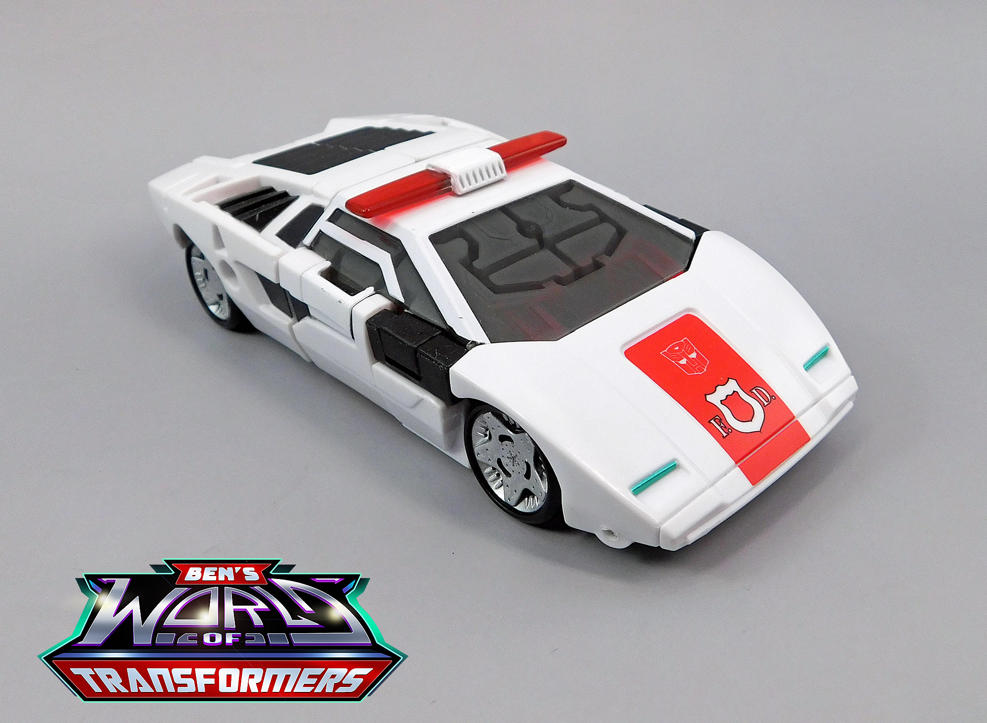This G1-inspired toy converts into Earth emergency vehicle mode in 17 steps. Comes with a lightbar that attaches to the vehicle mode, shoulder mounted rocket launcher, and particle beam blaster accessories. Combine the particle beam blaster and lightbar to form an axe weapon accessory!