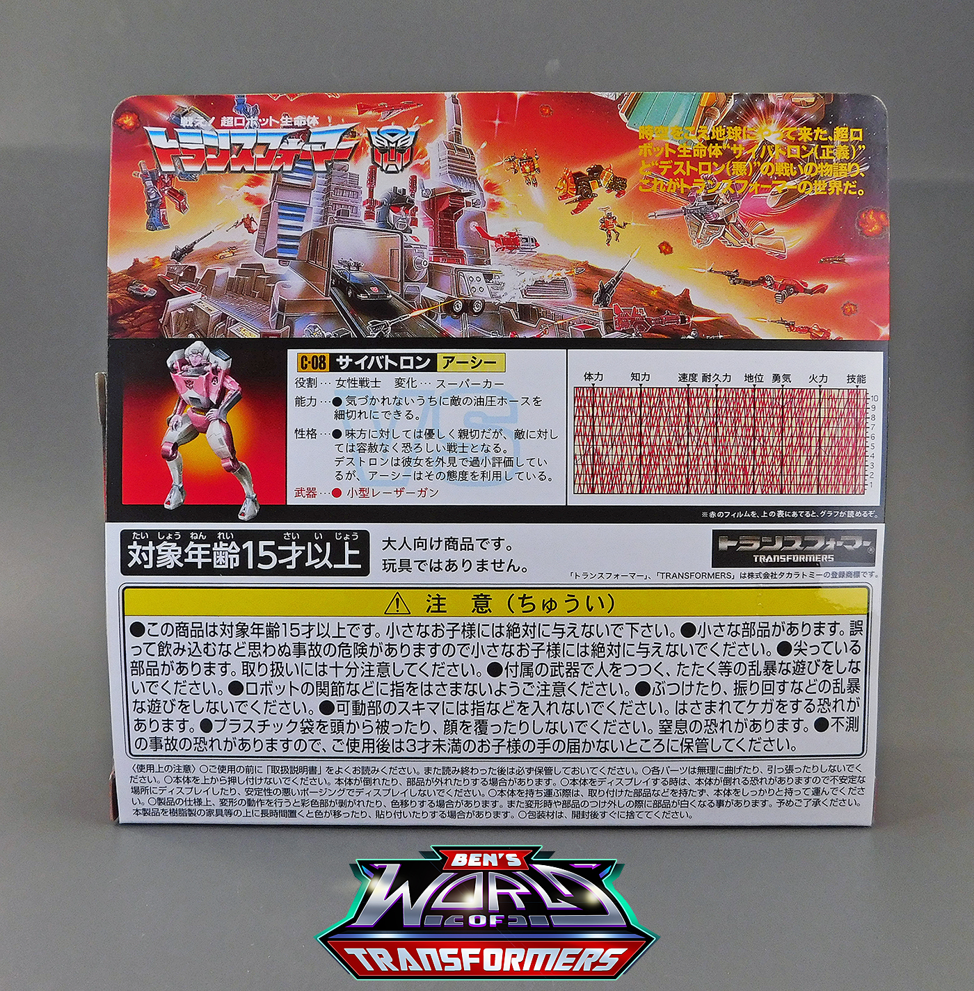 The back of the box features the 1986 battle scene art with Metroplex in city mode and Trypticon hovering menacingly above him. Below that are tech specs in classic G1 fashion with the artwork to the left, the text in the middle and stats to the right. Arcee includes a translucent red plastic piece to put on top of the stats to "decode" them. Under that is various legal information.