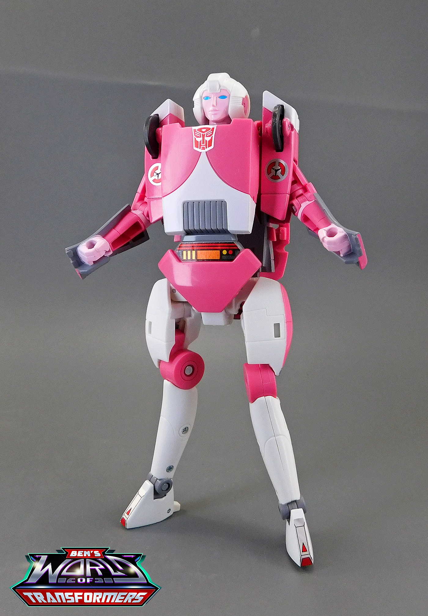 C-07 Arcee's colors were based on the prototype from 1986 but this figure uses the cartoon as its inspiration. The pink, white and grey colors carry over from the vehicle mode but it is not a perfect one to one match. For instance, her arms are all pink plastic with lighter pink paint on the elbows and fists, but on the animation model they actually have white sections. Still, key details like the white pattern on her torso, blue eyes, pink face and the colors on the legs are fairly cartoon accurate. During the G1 era, the standards for "cartoon color accuracy" were very different than today, and I'd say by that standard Arcee exceeds expectations. This mode shows off five stickers that you don't see in vehicle mode. The waist area has a sticker with black, red and orange details that look like some kind of control panel. The arms have round stickers on them that are seemingly borrowed from G1 Blitzwing. Her feet have silver and red stickers with arrow and rectangle details on them.