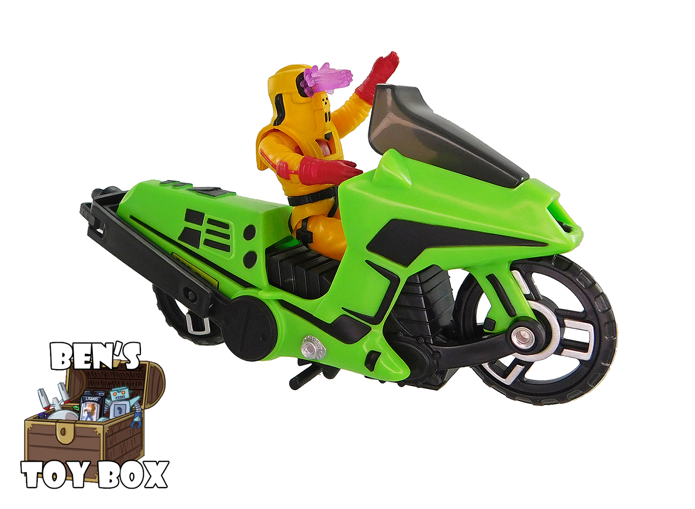 This vehicle is made of neon green and black plastic. Green makes up most of the motorcycle's main body with black used for smaller parts like the seat and the wheels. The windshield is a translucent, smokey grey plastic. Paint details are mostly black, using the same pattern as the original including an "L" shaped detail on the sides of the front end and smaller details on the back. A sticker showing a control panel is applied to the dashboard behind the windshield. Like the original vehicle, the sides of the wheels have some vacuum metallized silver, which looks great! All that said, there are a couple differences between the original Condor and this release. Both side view mirrors have been painted with silver to represent the mirrors. Meanwhile a circle detail on either side has also been painted silver whereas they were unpainted on the original. I am glad to see that if the designers had to change something, it was giving this vehicle more detail, not less!