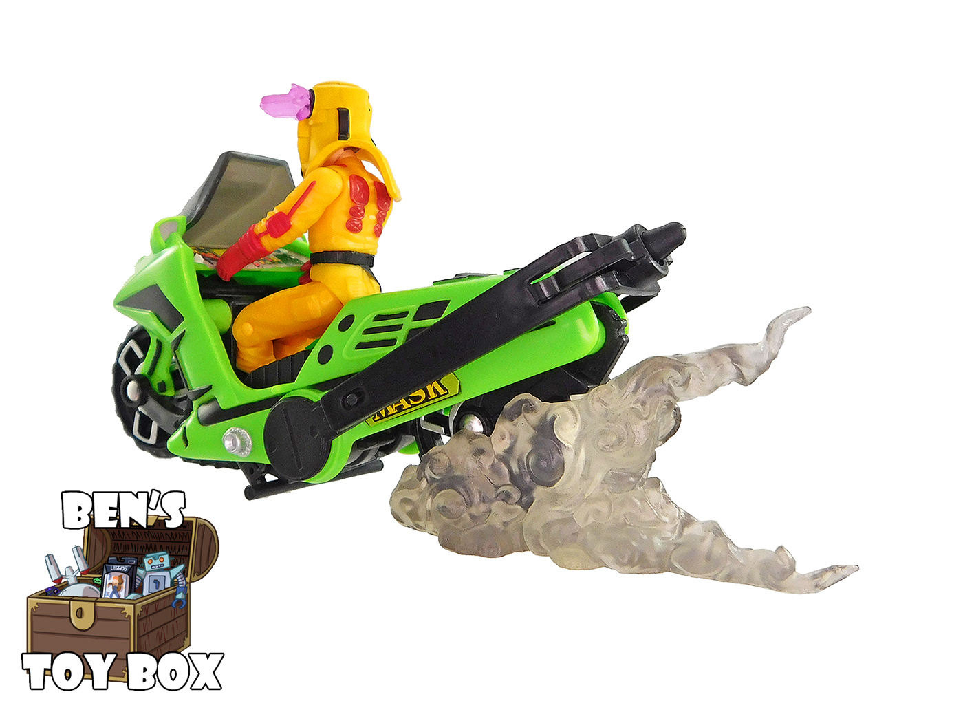 Brad Turner can sit in the seat, but not with his legs on either side as you may expect but instead his feet wind up under the control panel. You have to fidget with them a little to get him to actually sit properly in the seat but it can be done. The motorcycle rolls on both wheels. Thanks to its width, the motorcycle can stand upright on its own without flopping to one side. That said, if you want to add a bit of dramatic effect, the motorcycle includes a large "smoke" blast effect in translucent grey that can be attached to the rear wheel to act as a base. I think this was a brilliant way to add some value to the set while giving the vehicle a fun display option!