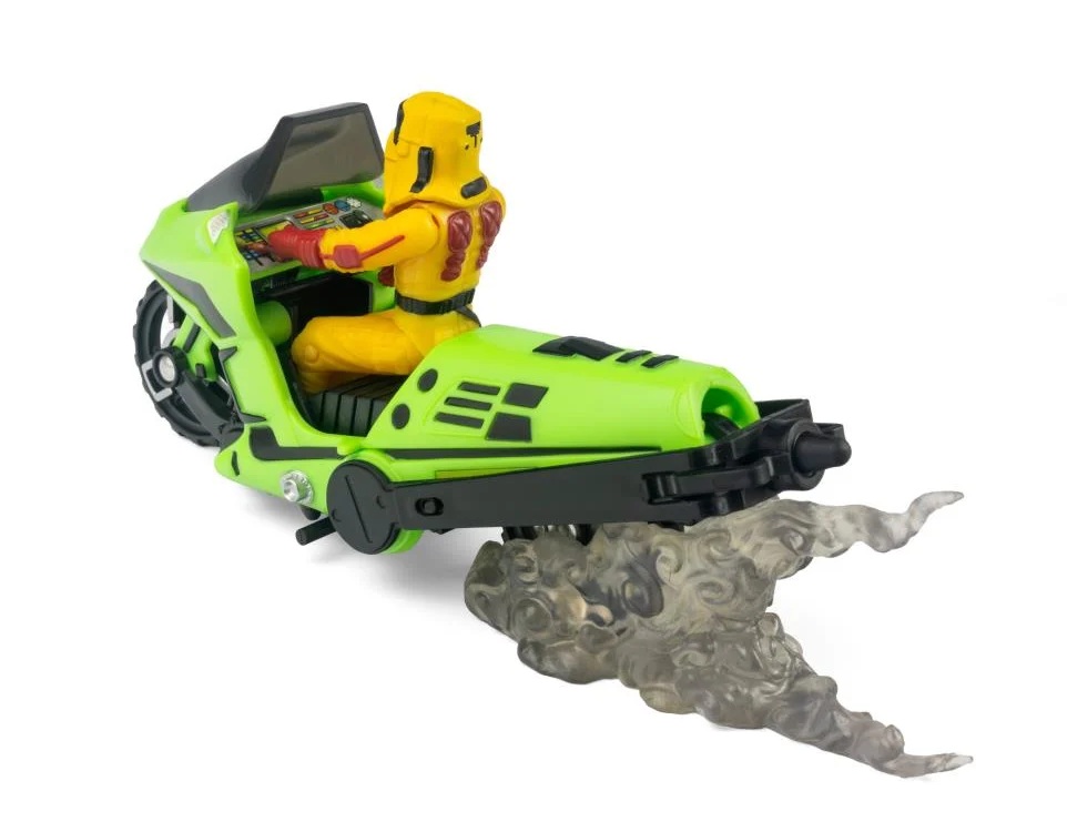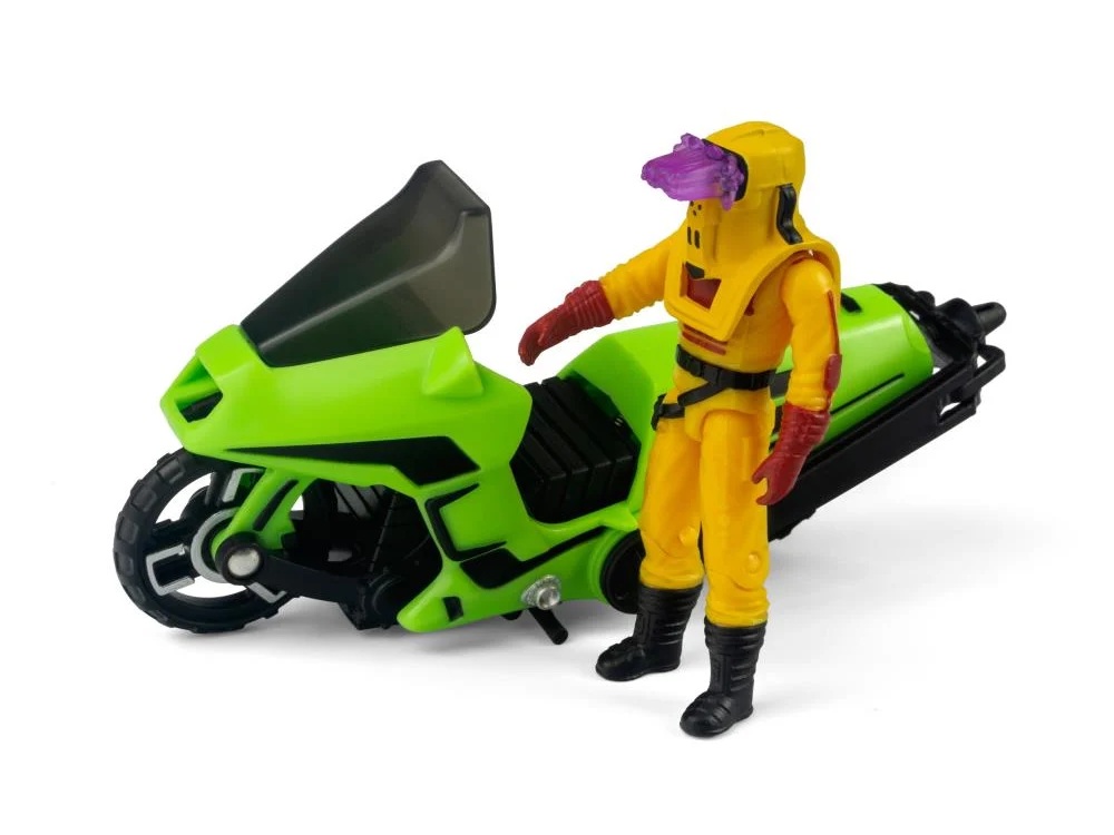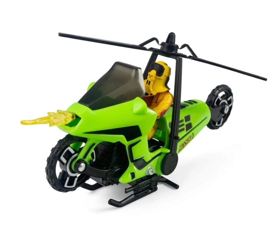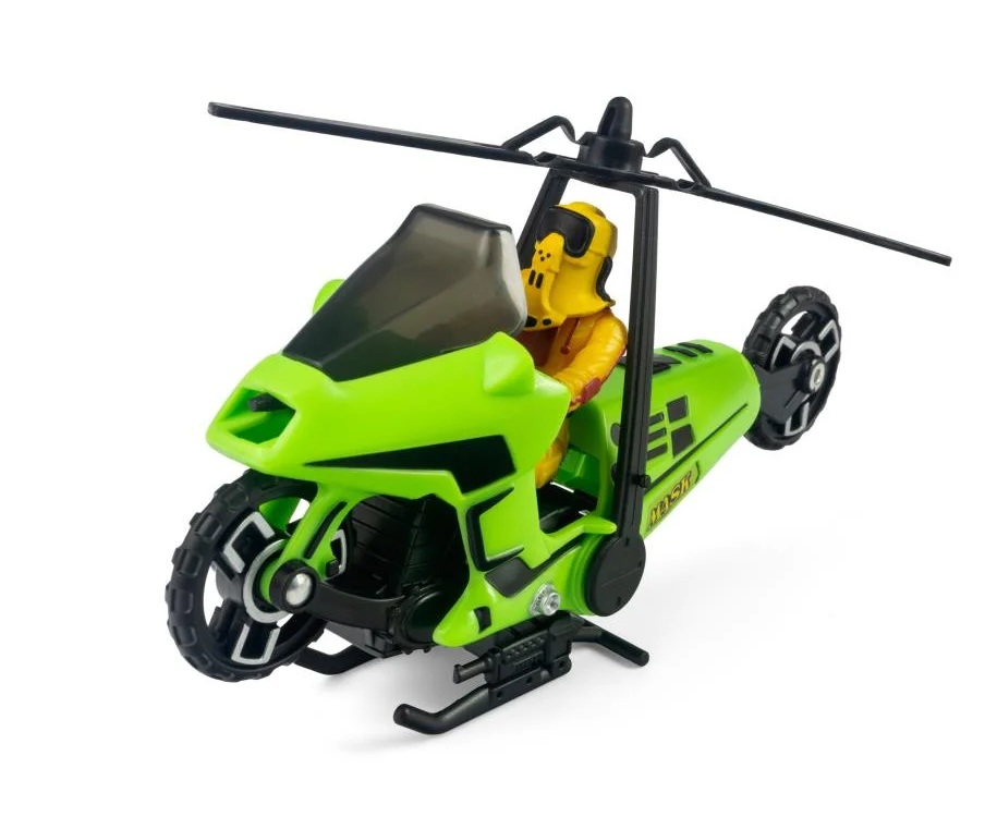 The ultimate covert rider returns! Originally released in 1985, Condor is back—reimagined by The Loyal Subjects with enhanced detailing and nostalgic flair. This green two-wheeler flips into an aerial assault machine in just a few quick steps, bringing vintage action to a new generation of fans. The Loyal Subjects’ M.A.S.K. Condor converts from Covert Assault Cycle to Attack Copter, complete with spinning rotor blades and sleek design. Featuring Brad Turner with his removable mask, this set includes premium upgrades like realistic rubber tires, detailed engine sculpting, and dynamic accessories such as laser bursts and smoke trails.