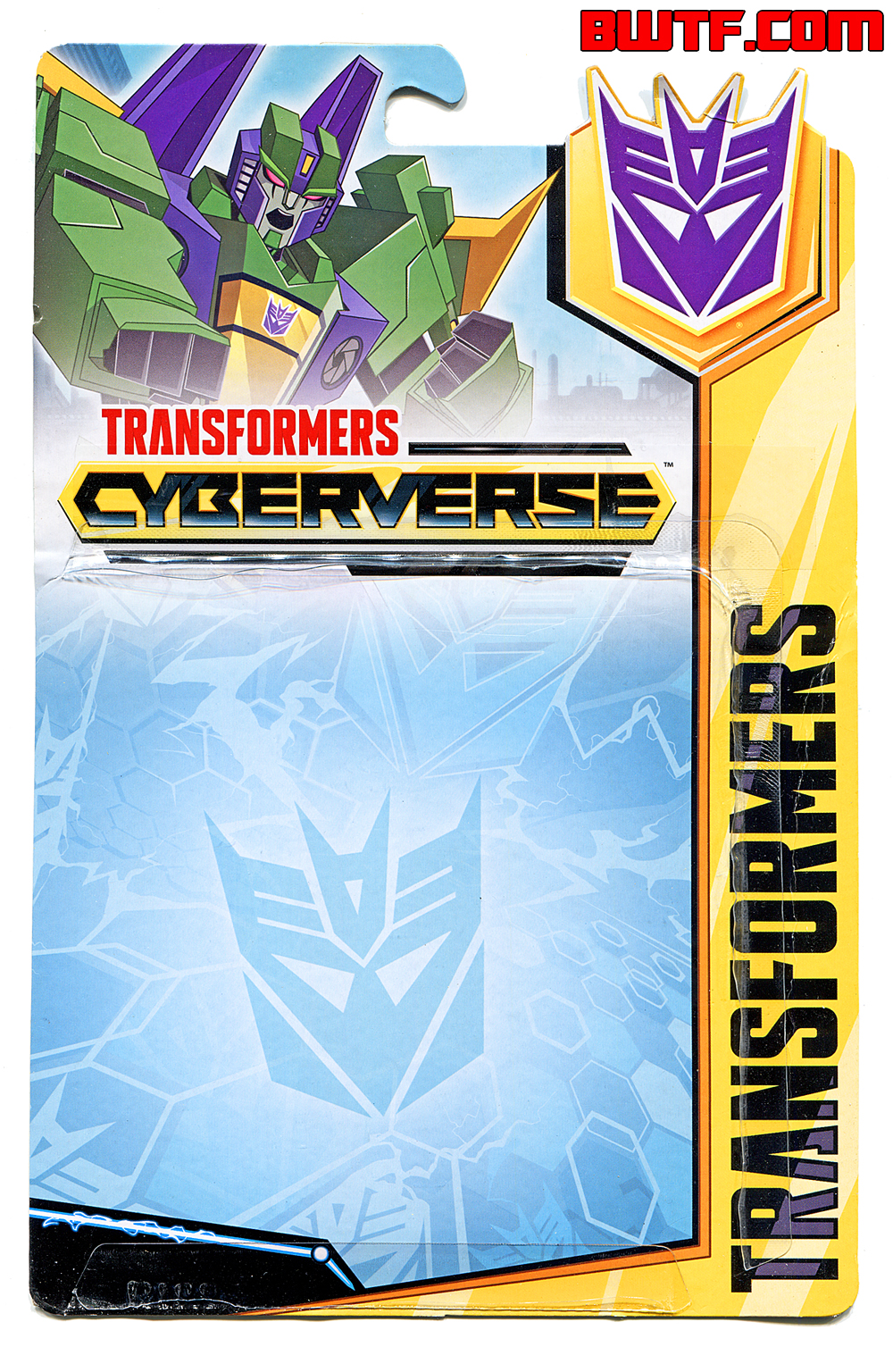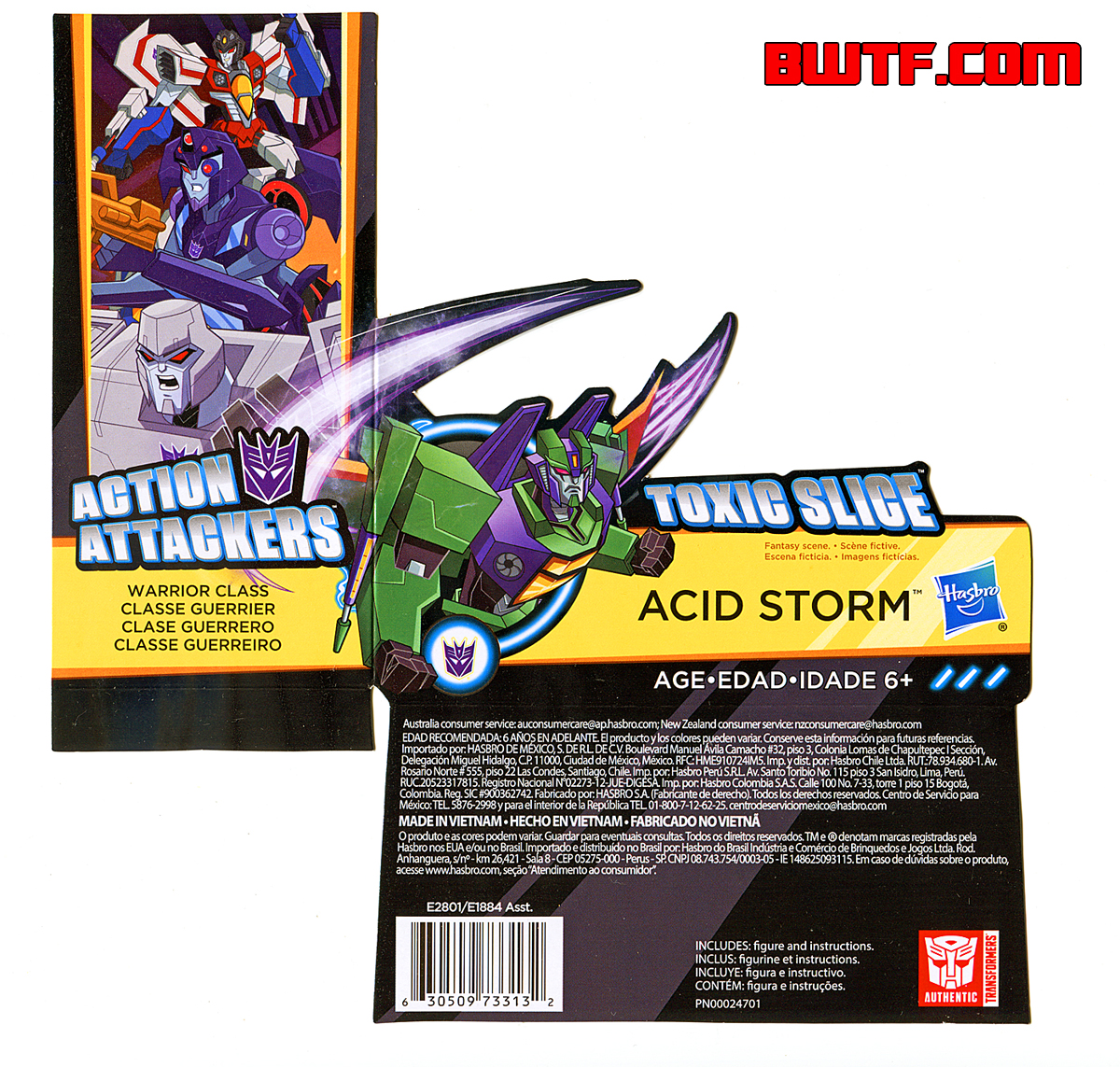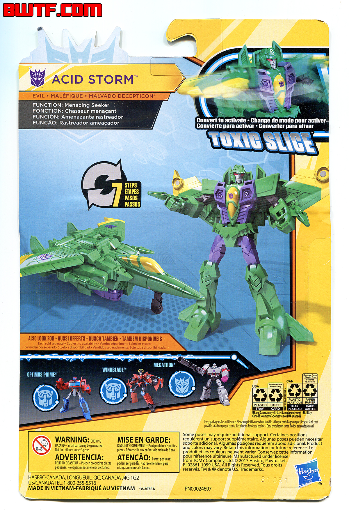 Warrior Class "Cyberverse" figures are packaged on bubble cards. The cards have a new design which takes cues from more recent Transformers packaging. There is still a vertical "Transformers" logo on the right side, above it is a symbol (Autobot or Decepticon based on the character) and the character art is at the top of the packaging with the "Cyberverse" logo under it. Perhaps the most distinctive part of the packaging design are the colors, which utilize yellow and light blue helping them stand out against the black and red colors used for "Generations" packaging on shelves. The back of the packaging features the figure with its action feature called out. In Acid Storm's case he has a "Toxic Slice" feature. The packaging also calls out his cosells (Optimus Prime, Windblade and Megatron) and his transformation is listed as having 7 steps.