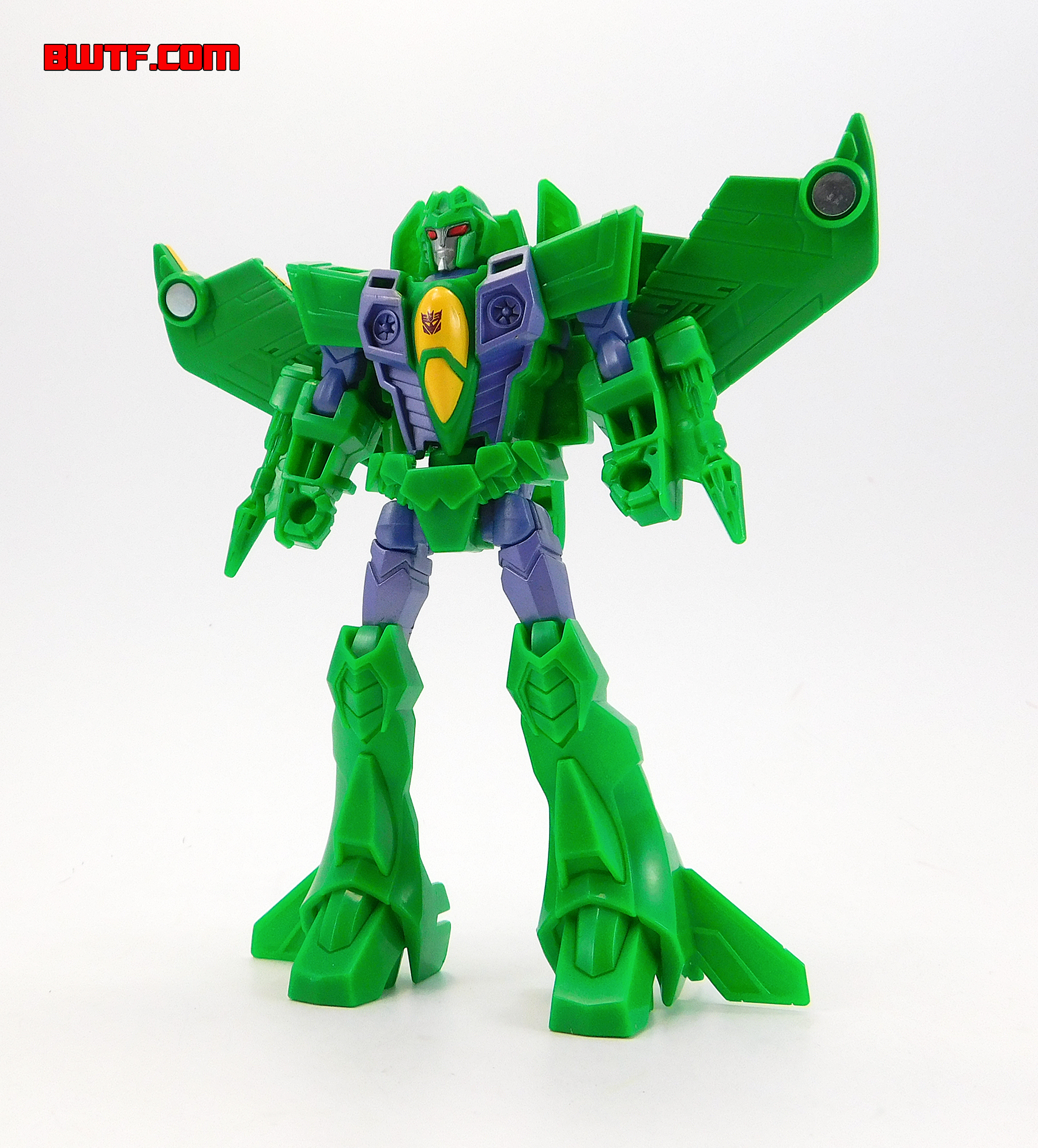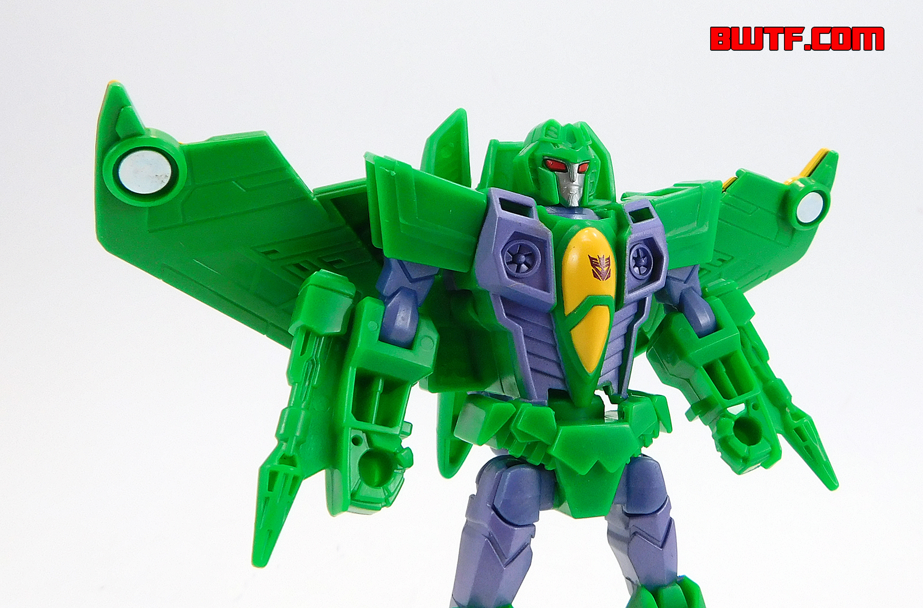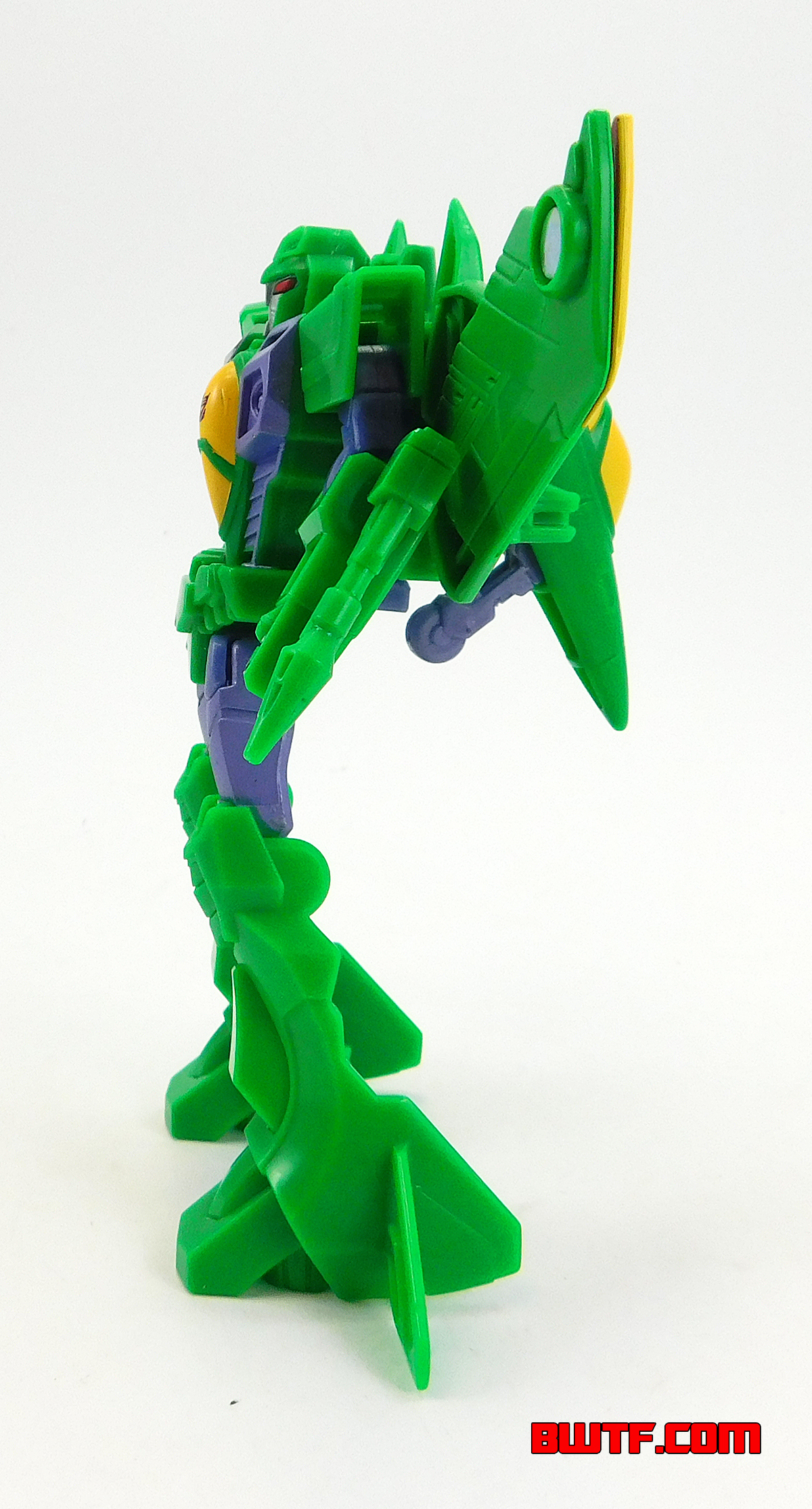 Acid Storm is mostly cast in green and metallic lavender plastic. The green really dominates the figure with the lavender parts making up smaller bits like the elbows. Lavender paint is used on the torso and thighs. The face is painted silver and the eyes are red. The cockpit on his chest is painted yellow with a small Decepticon symbol on top. The inside of the panels that swing out from the ends of the wings are painted in a very "Energon" pink. This differs quite a bit from the animation model. There, the helmet section of the head is black and there is no lavender on the model. Also, the animation model has red lines along the top of the wings. These colors appear to be more based on the early Hasbro bio which had more green on the head and purple coloring on the chest and thighs. Regardless of animation accuracy, like Starscream there is enough left unpainted on this figure that it looks kind of unfinished, especially on the lower legs.