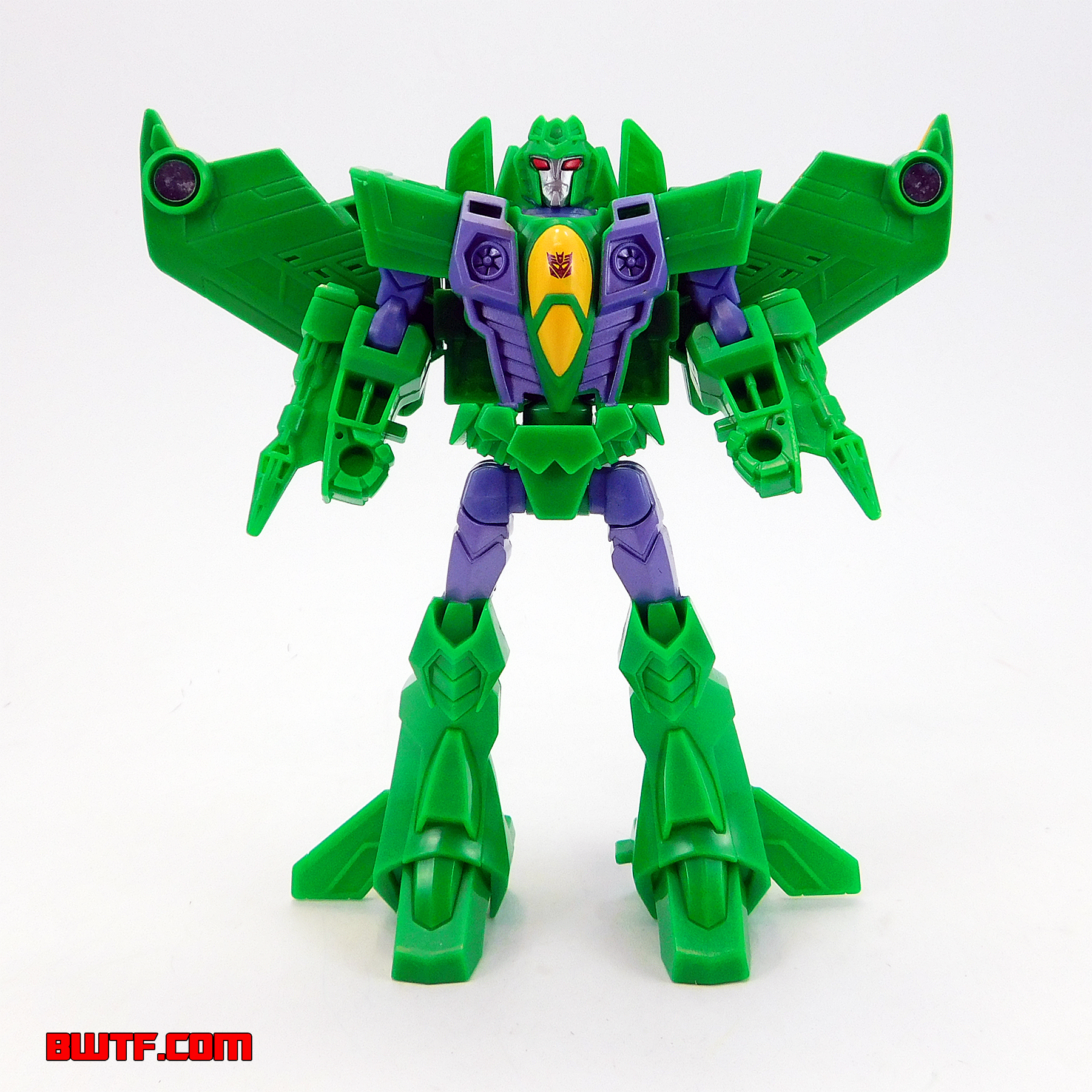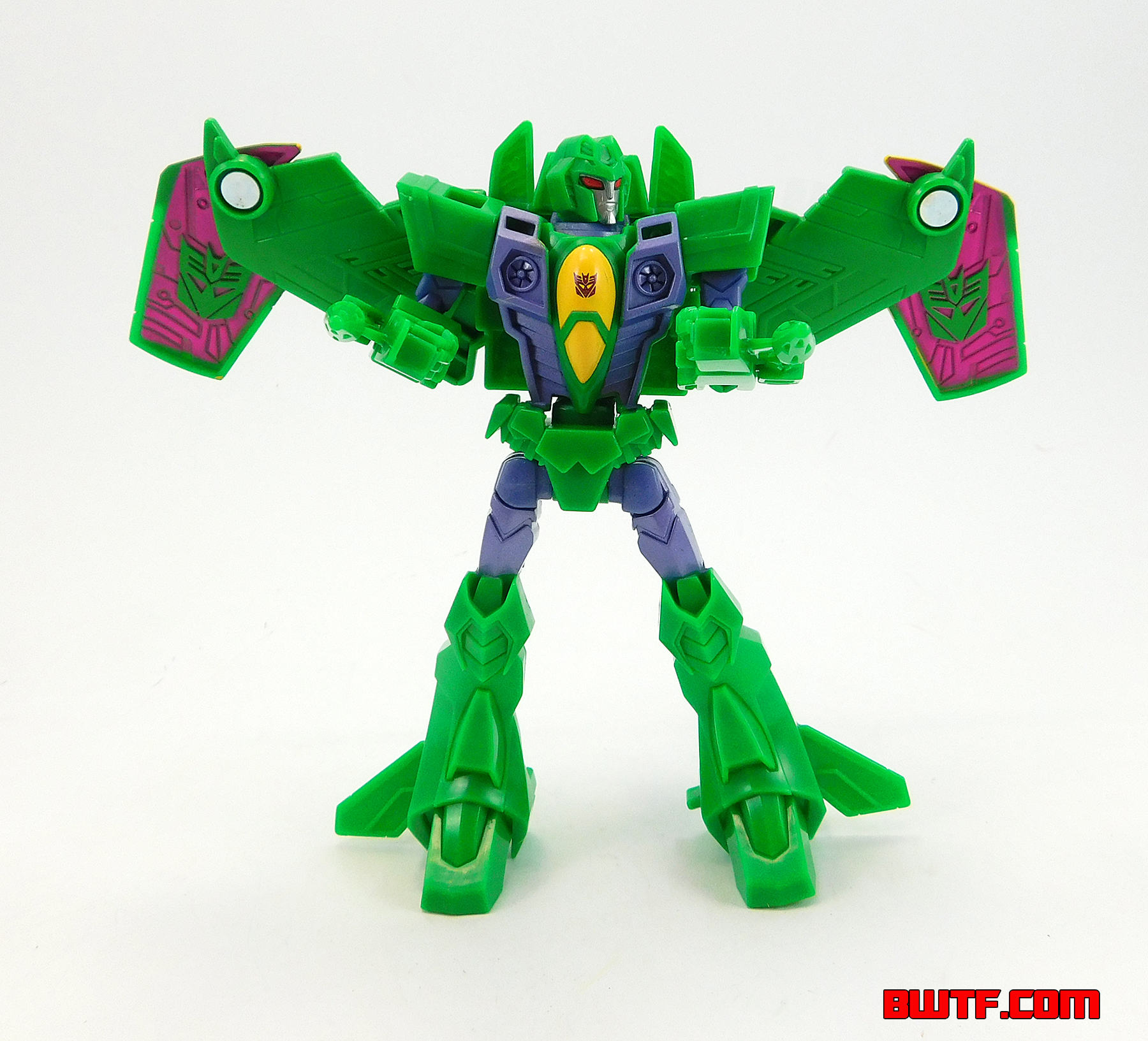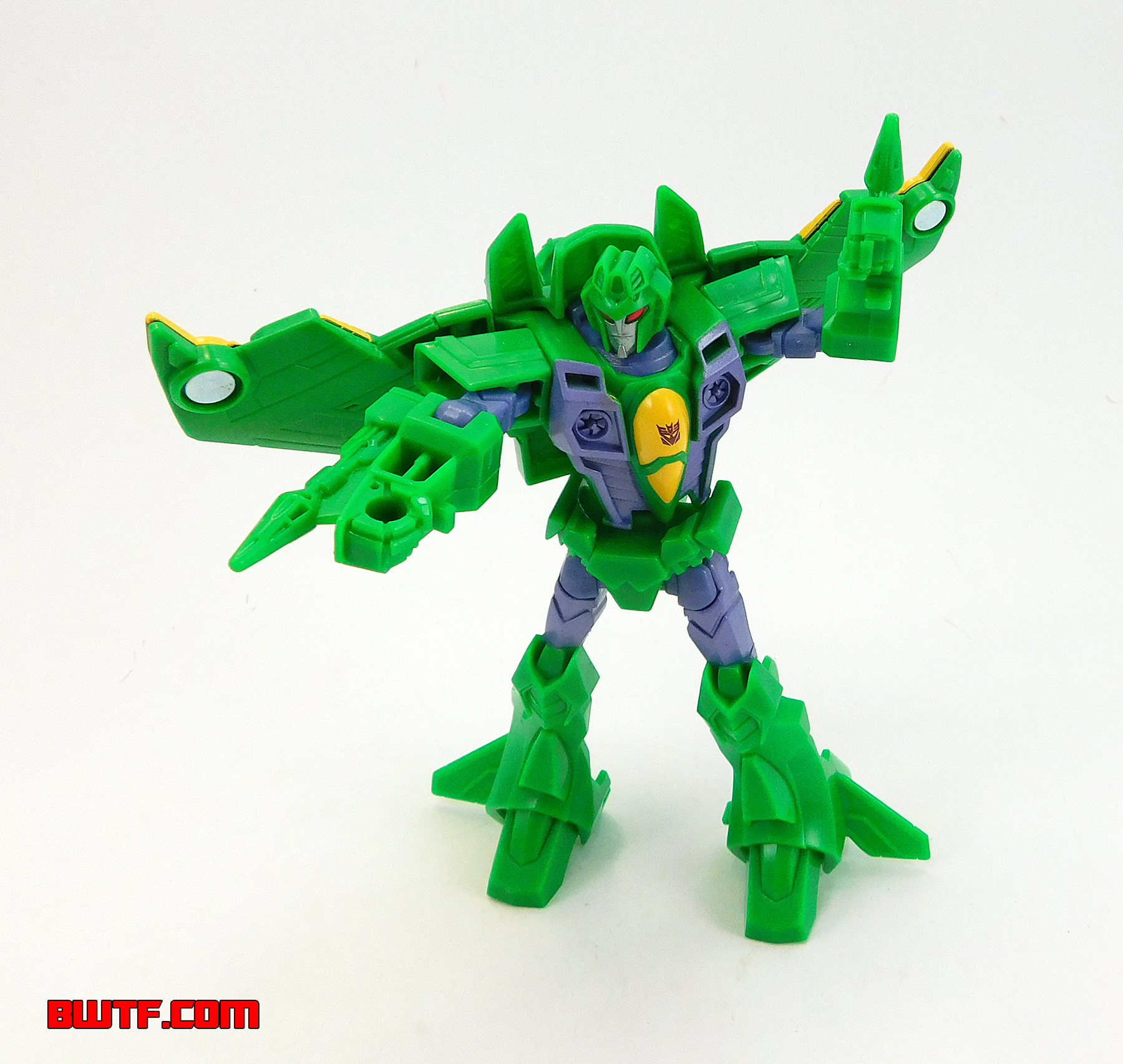 Acid Storm is mostly cast in green and metallic lavender plastic. The green really dominates the figure with the lavender parts making up smaller bits like the elbows. Lavender paint is used on the torso and thighs. The face is painted silver and the eyes are red. The cockpit on his chest is painted yellow with a small Decepticon symbol on top. The inside of the panels that swing out from the ends of the wings are painted in a very "Energon" pink. This differs quite a bit from the animation model. There, the helmet section of the head is black and there is no lavender on the model. Also, the animation model has red lines along the top of the wings. These colors appear to be more based on the early Hasbro bio which had more green on the head and purple coloring on the chest and thighs. Regardless of animation accuracy, like Starscream there is enough left unpainted on this figure that it looks kind of unfinished, especially on the lower legs.
