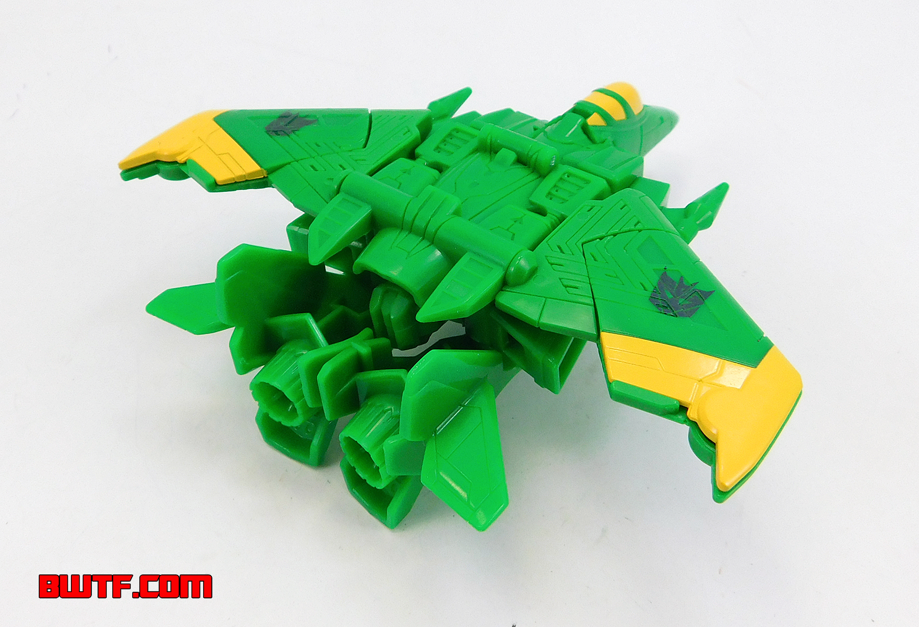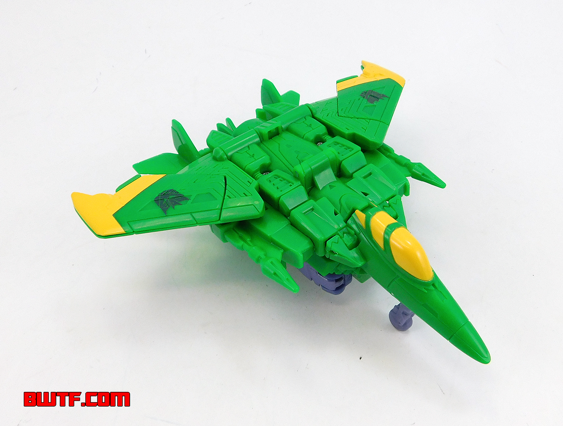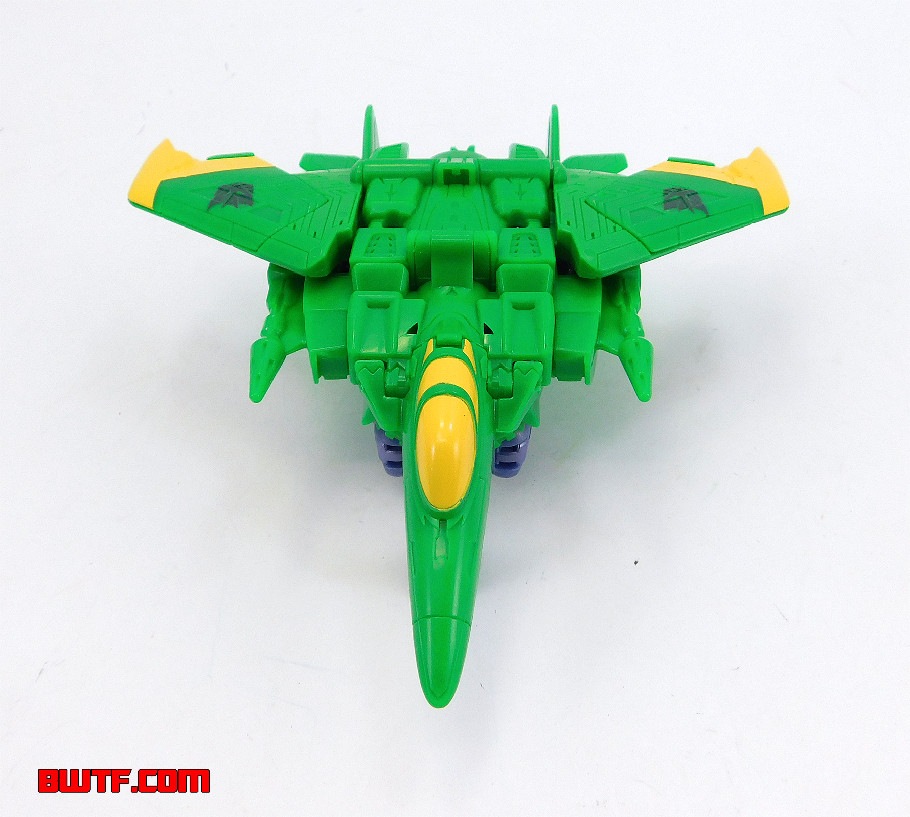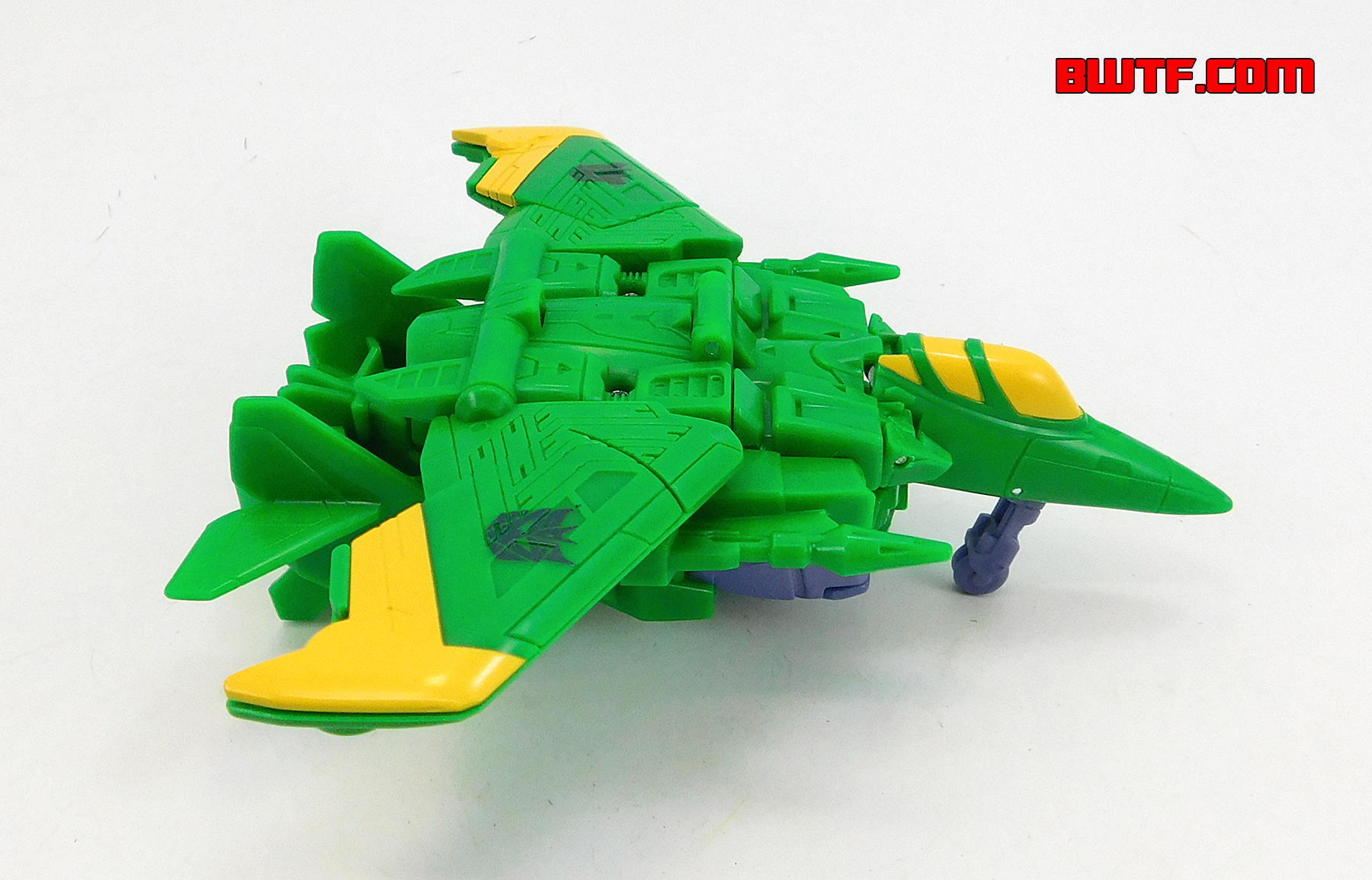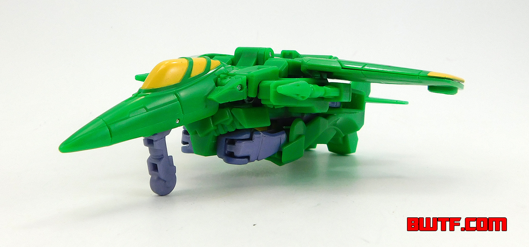 As mentioned above, the original artwork for Acid Storm differs from the final animation model, but this mode reinforces the idea that this figure was based on the original artwork. This mode is almost all green with the landing gear cast in lavender. The cockpit windows and parts of the wings are painted yellow and there are Decepticon symbols on the wings and...that's it. Sadly all the green kind of washes out the sculpted detail in this form so it winds up looking rather plain.