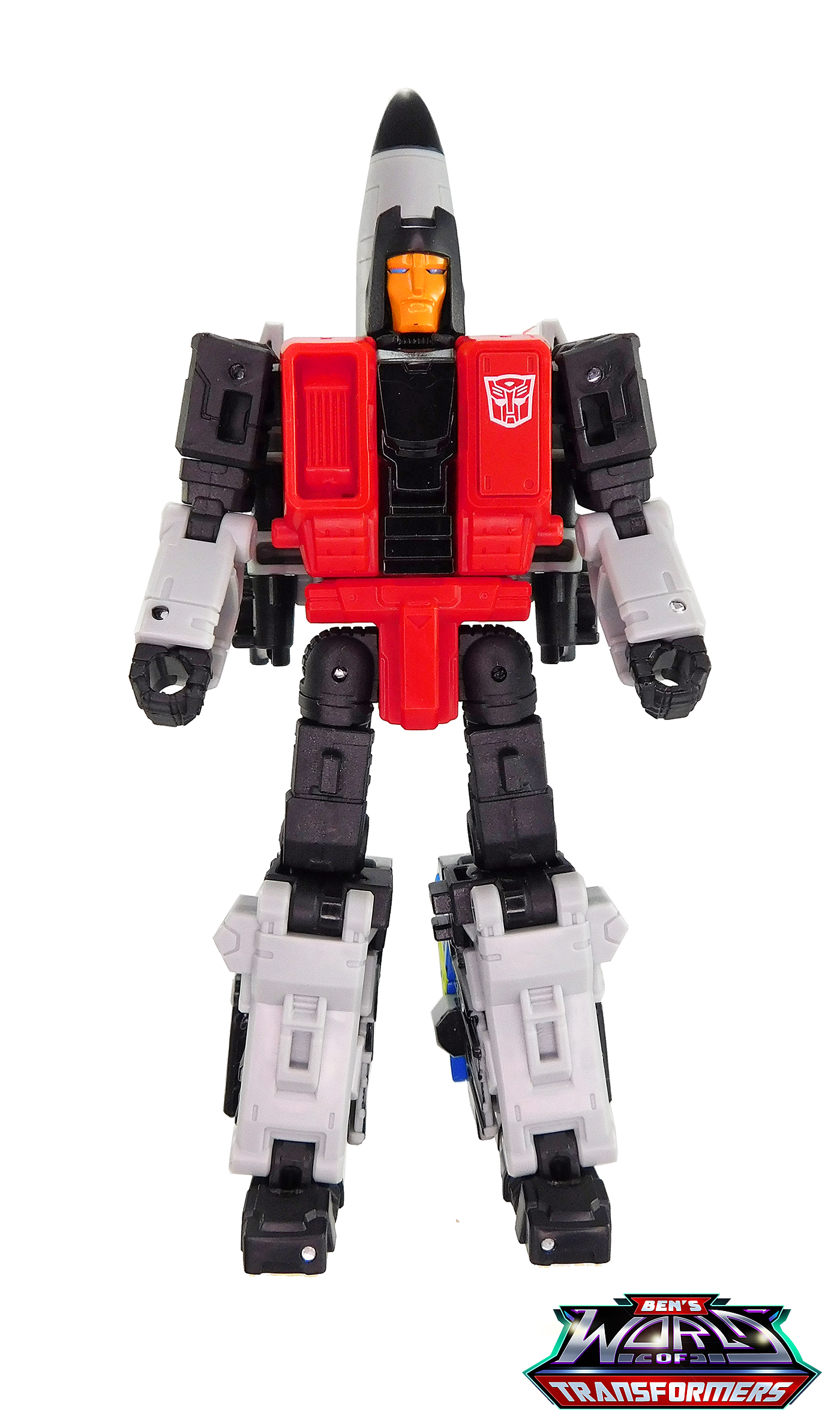 Skydive is made up of grey, black and red plastic. The face is painted orange with blue eyes. An Autobot symbol is printed onto the left side of his chest, something he had in the cartoon series. He doesn't have a ton of deco in this mode, but it does match the cartoon and looks great.