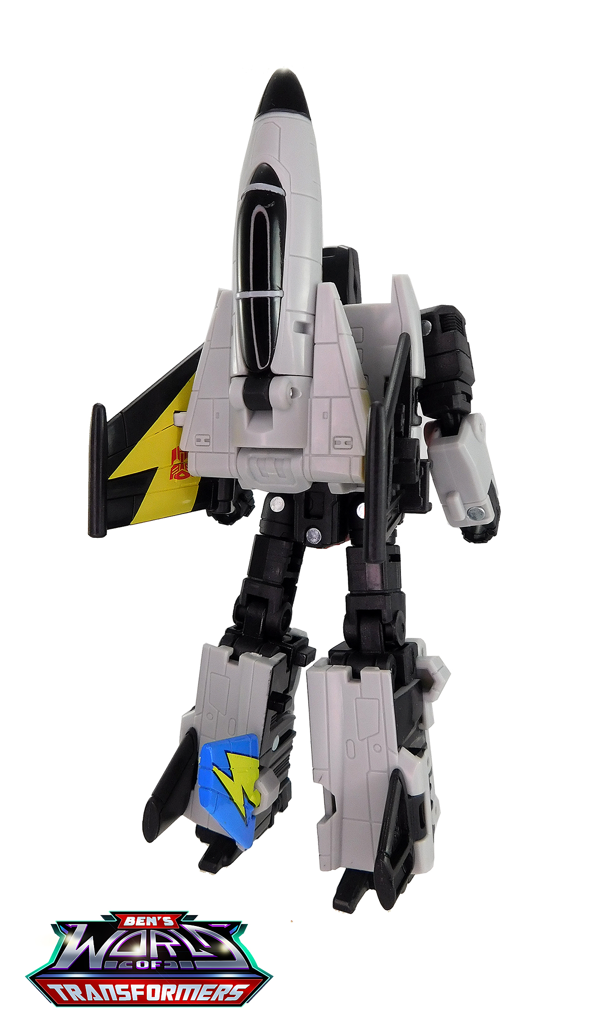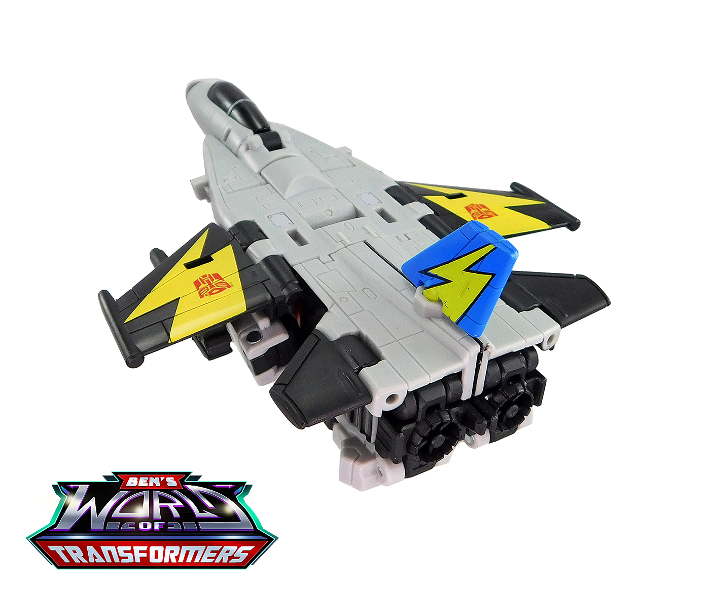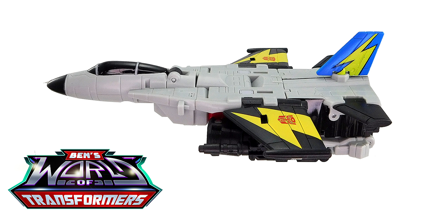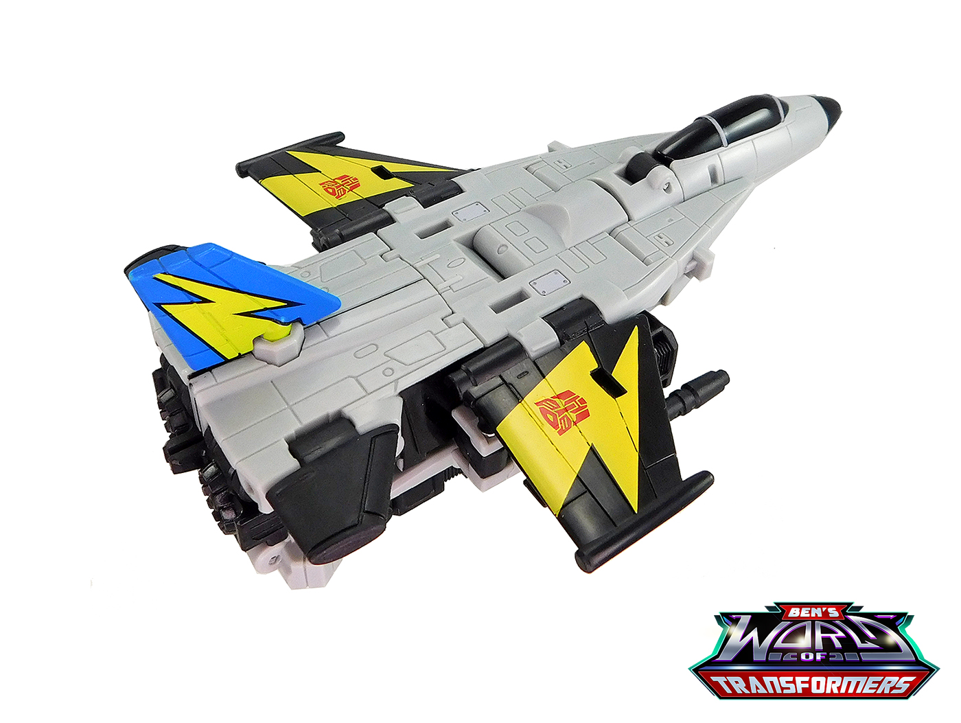 This mode mostly shows off the grey and black plastic. Black paint is used on the cockpit cover. The wings feature yellow lightning bolts with Autobot symbols on top, a detail inspired by the G1 toy and cartoon model. The vertical fin in back adds a splash of blue and yellow color, a callback to the G1 toy and cartoon model.