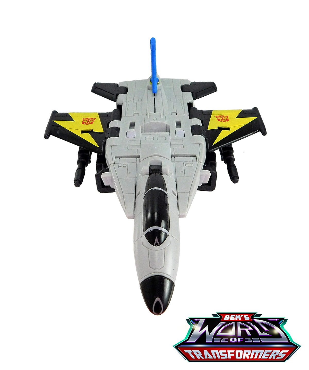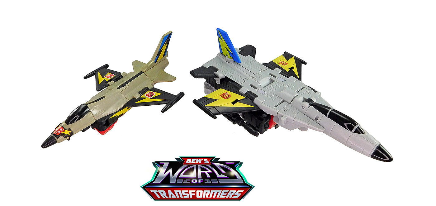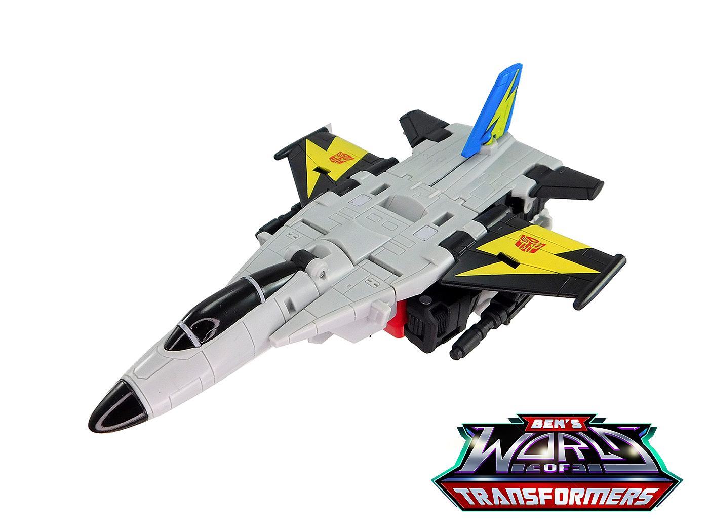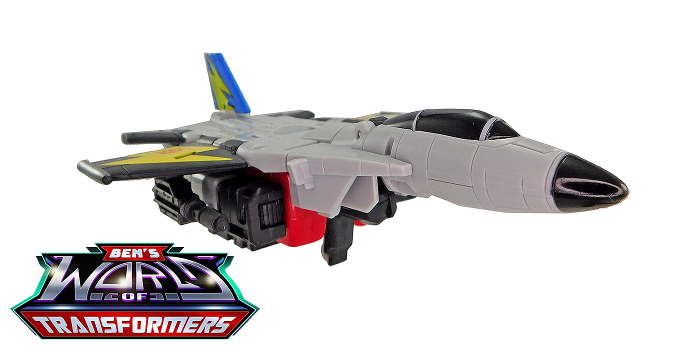 This mode mostly shows off the grey and black plastic. Black paint is used on the cockpit cover. The wings feature yellow lightning bolts with Autobot symbols on top, a detail inspired by the G1 toy and cartoon model. The vertical fin in back adds a splash of blue and yellow color, a callback to the G1 toy and cartoon model.