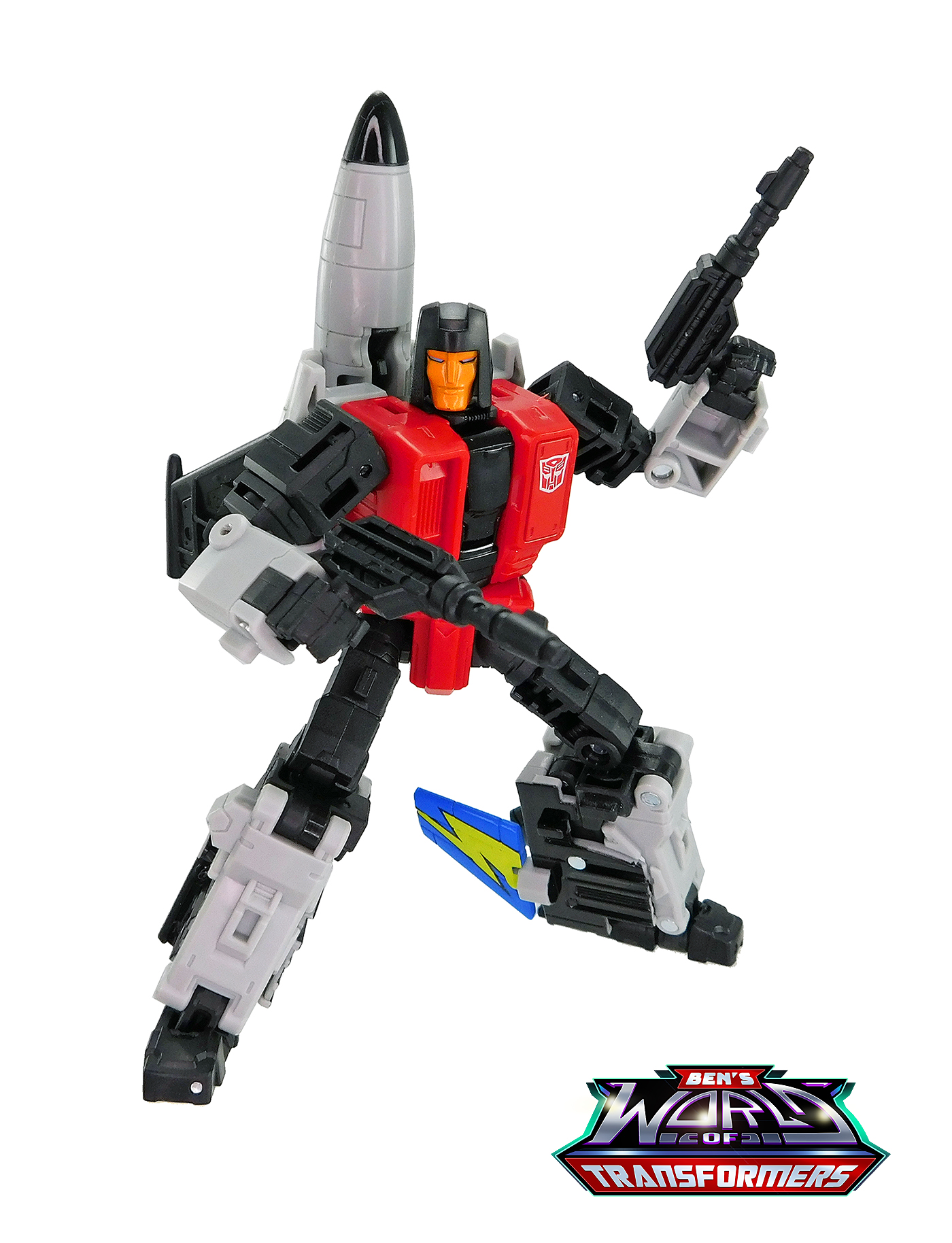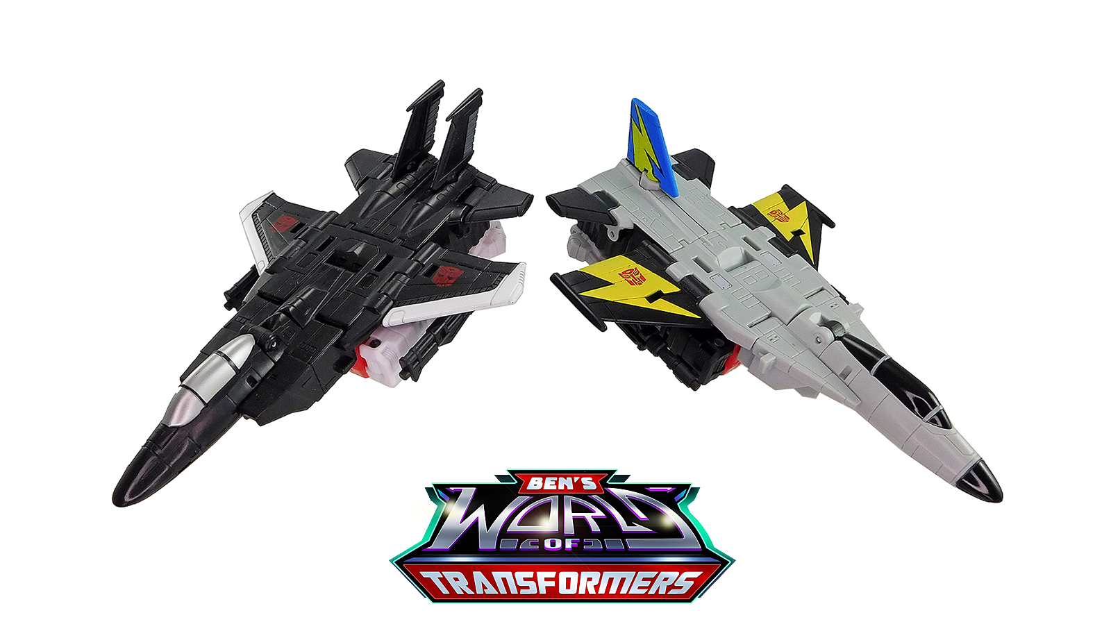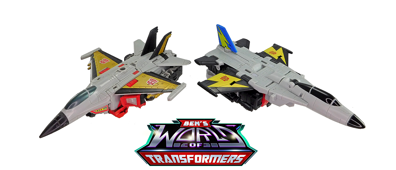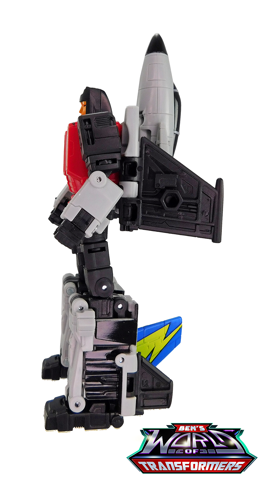 This mode mostly shows off the grey and black plastic. Black paint is used on the cockpit cover. The wings feature yellow lightning bolts with Autobot symbols on top, a detail inspired by the G1 toy and cartoon model. The vertical fin in back adds a splash of blue and yellow color, a callback to the G1 toy and cartoon model.