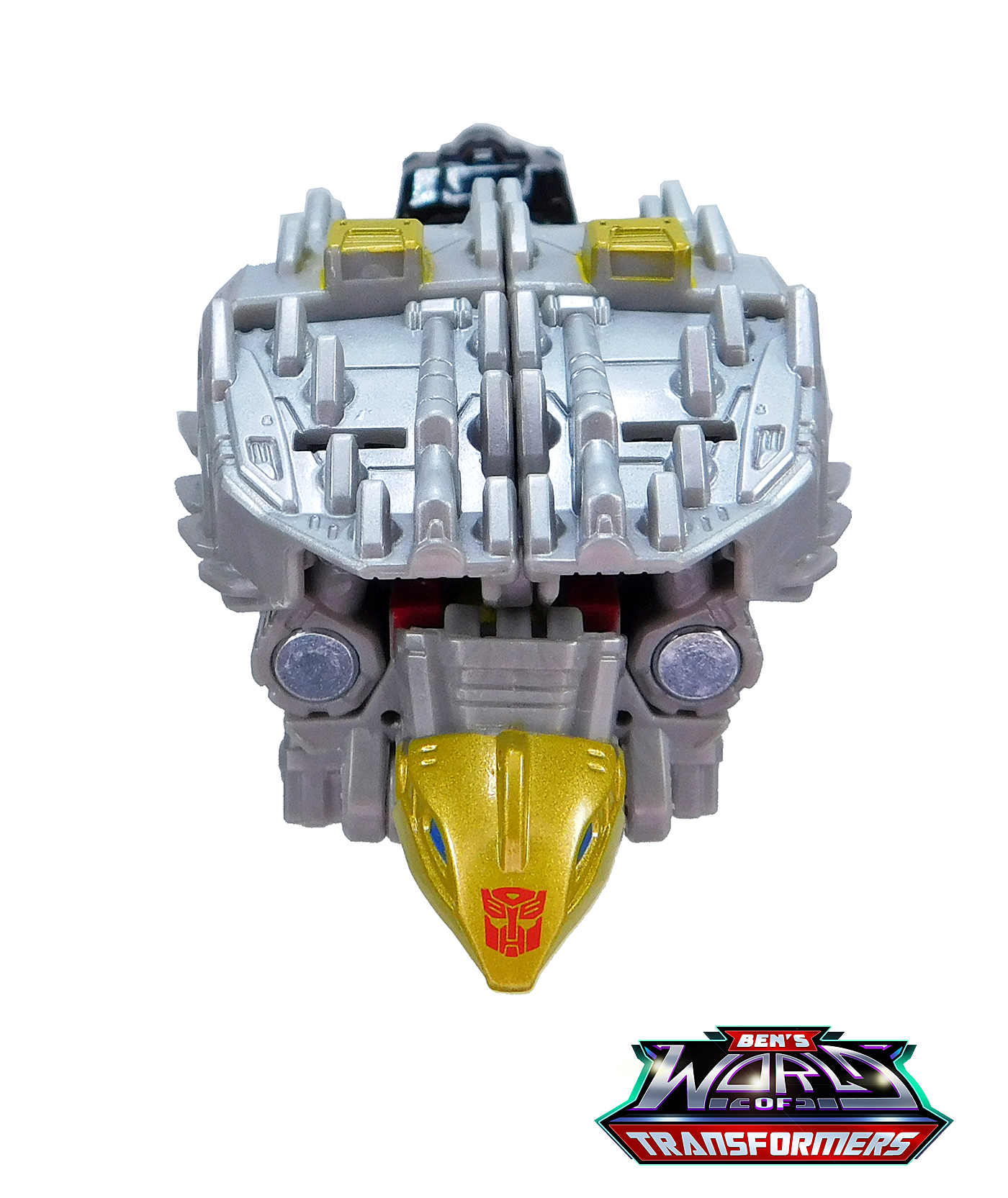 This mode shows off gold paint on the top of the beast mode and the head. A red Autobot symbol is painted on top of his snout and his eyes are painted blue. Like the robot mode, this form looks like a traditional Dinobot in color and in form.