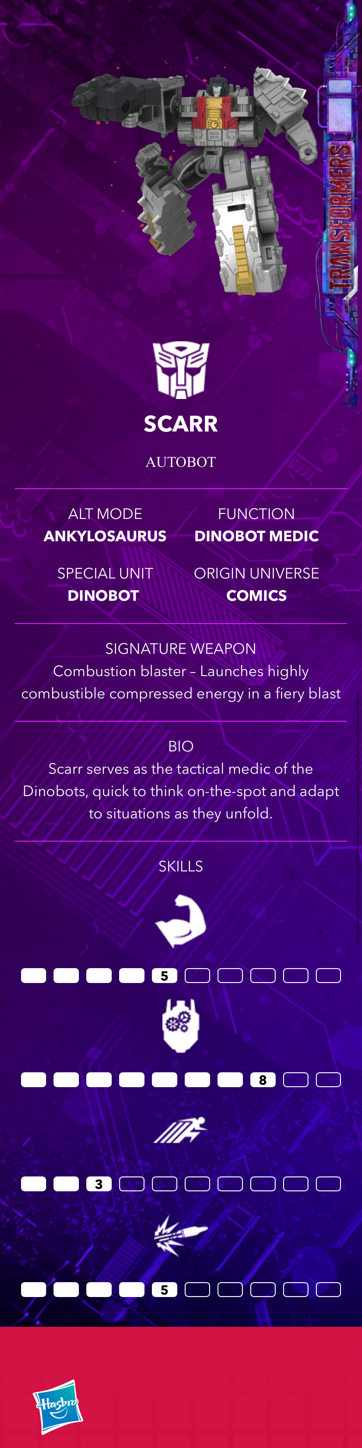 At the beginning of 2023 Hasbro began releasing a series of Core Class Dinobot figures including Dinobot Slug. The team will ultimately consist of six Dinobots who will combine into a new interpretation of the Combiner Volcanicus. Traditionally the Dinobots consist of five team members, so the sixth is a (kind of) new addition to the team: Scarr. This character was first introduced in the IDW Publishing comic books as “Skar”, a member of the Dynobots. He was also killed in that storyline so whether this represents a different version of the character or a character from the past is up to interpretation.