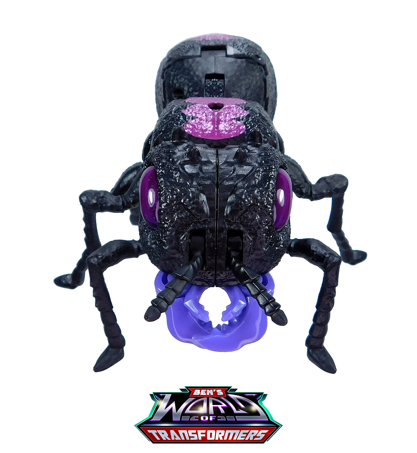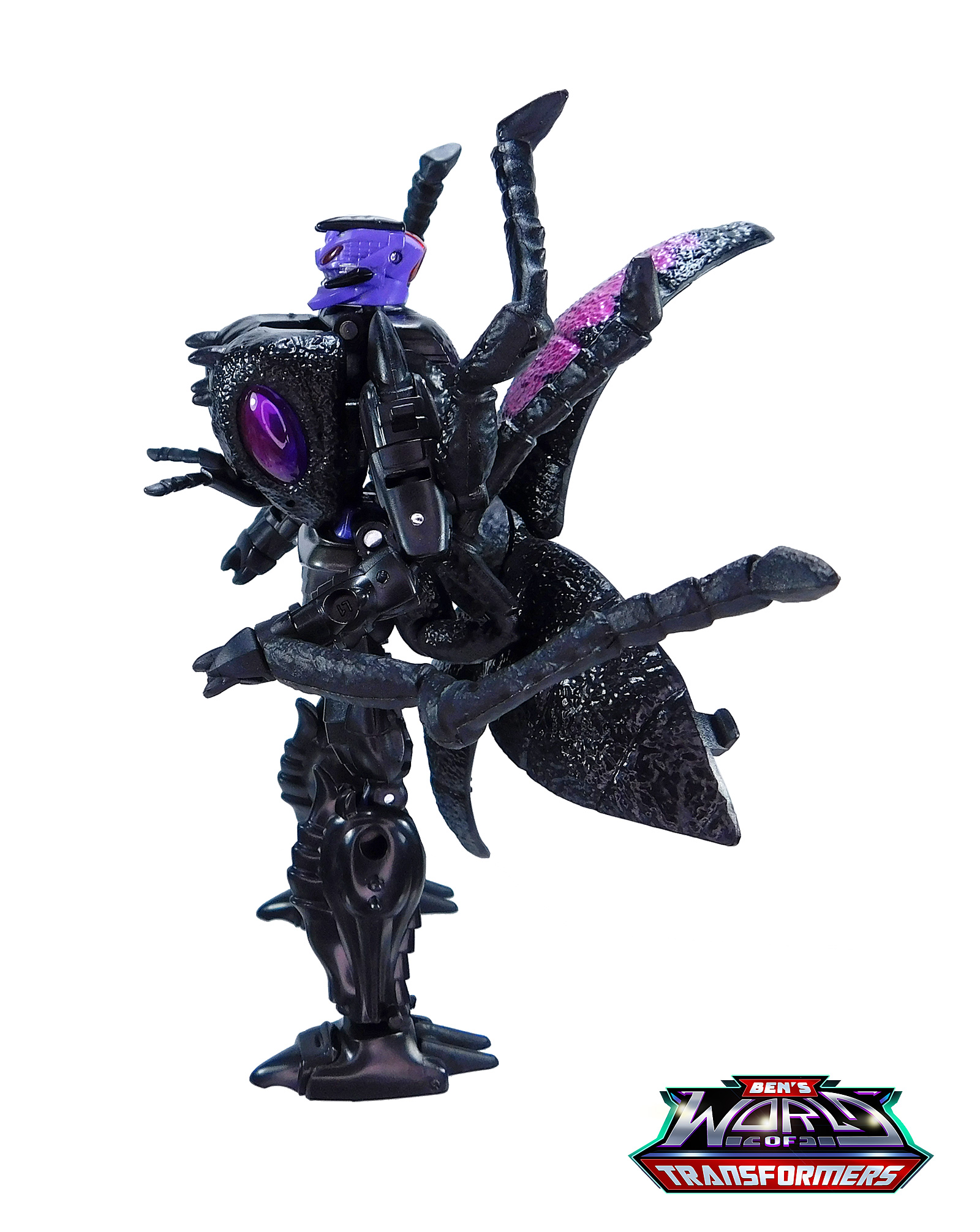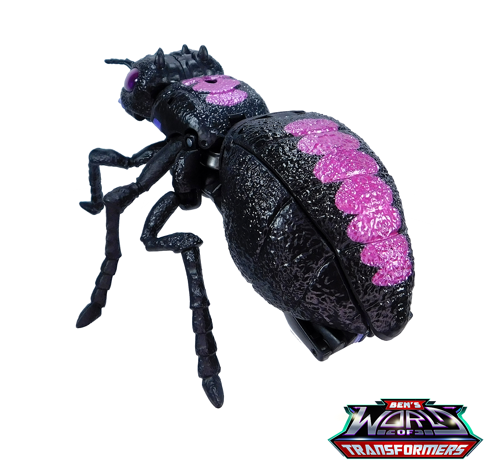 Antagony's beast mode features all the same colors as the robot mode. Most of the body is black with some translucent parts such as the eyes. The mandibles are lavender plastic. A beautiful curved pattern runs down the middle and rear section of the figure. This is painted in metallic purple. The deco on this figure is both simple yet striking at the same time.