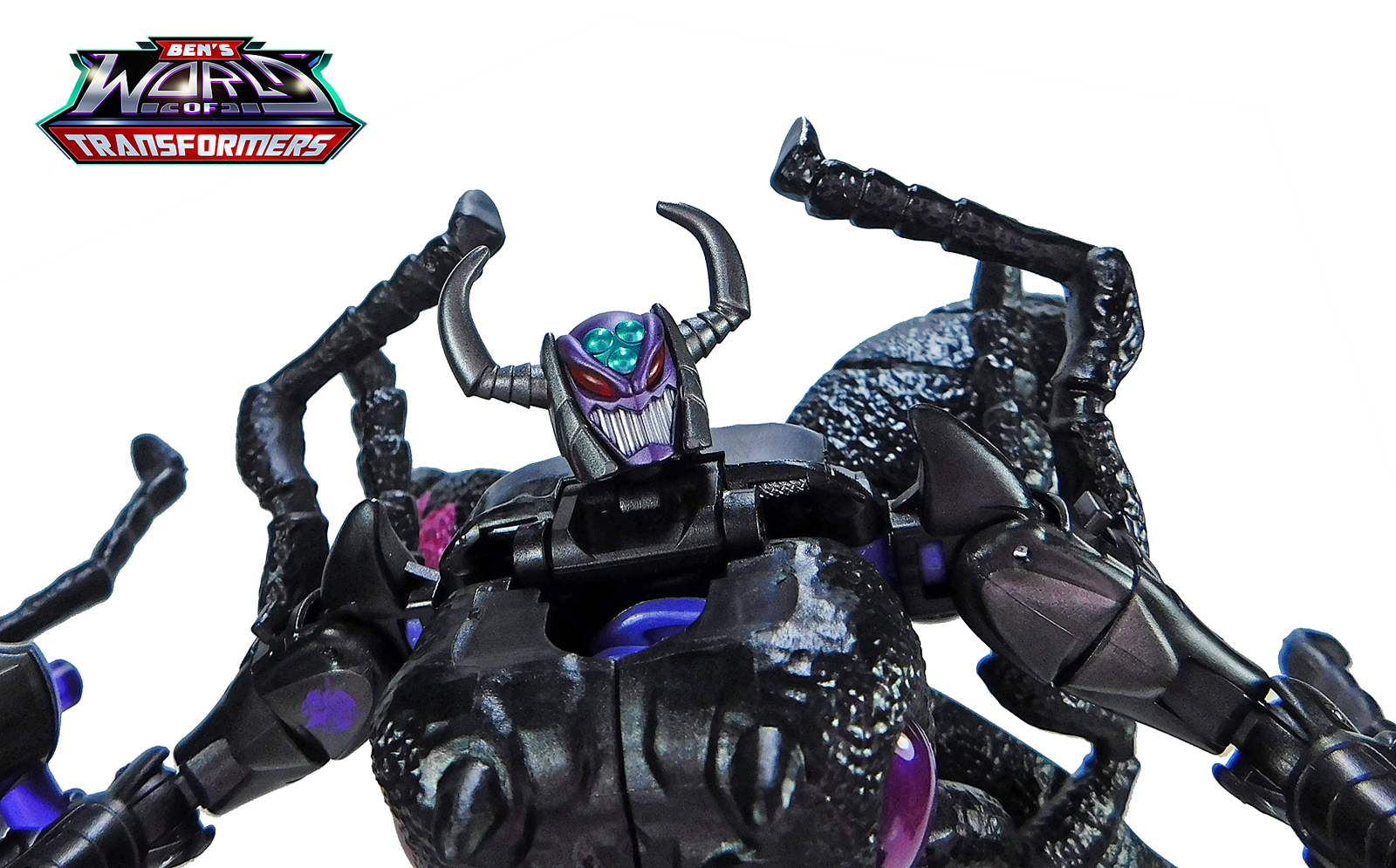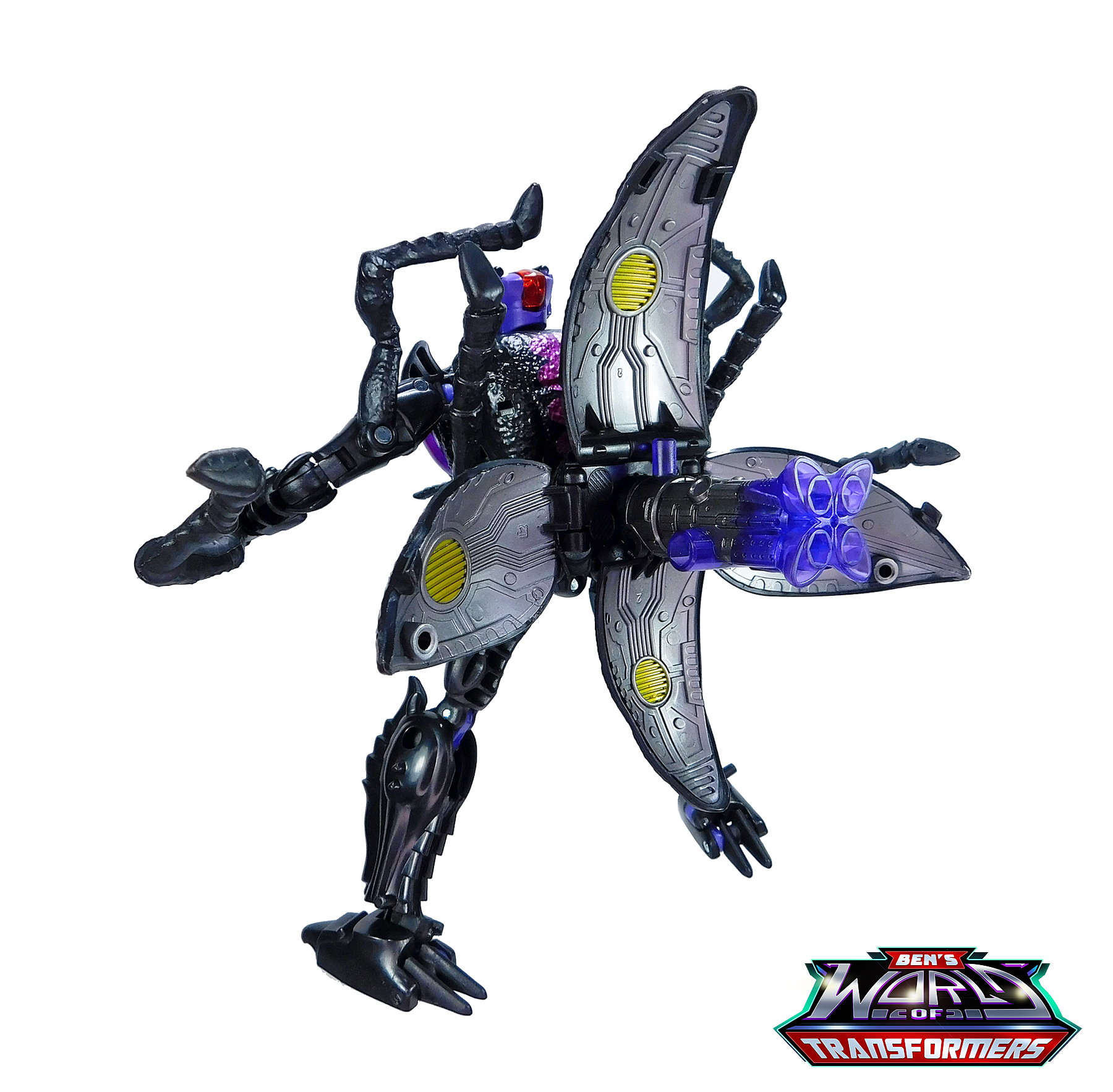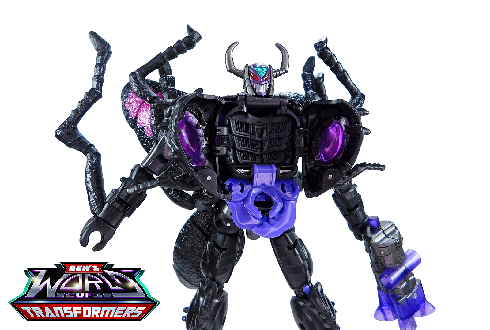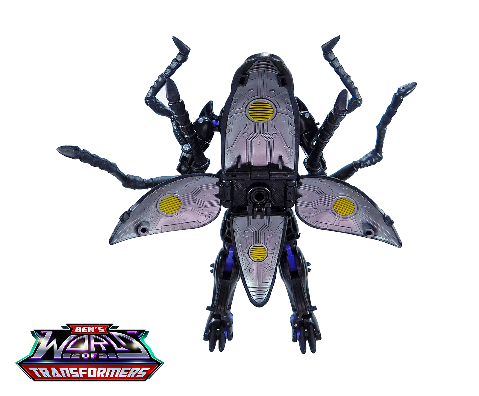 Antagony's beast mode features all the same colors as the robot mode. Most of the body is black with some translucent parts such as the eyes. The mandibles are lavender plastic. A beautiful curved pattern runs down the middle and rear section of the figure. This is painted in metallic purple. The deco on this figure is both simple yet striking at the same time.
