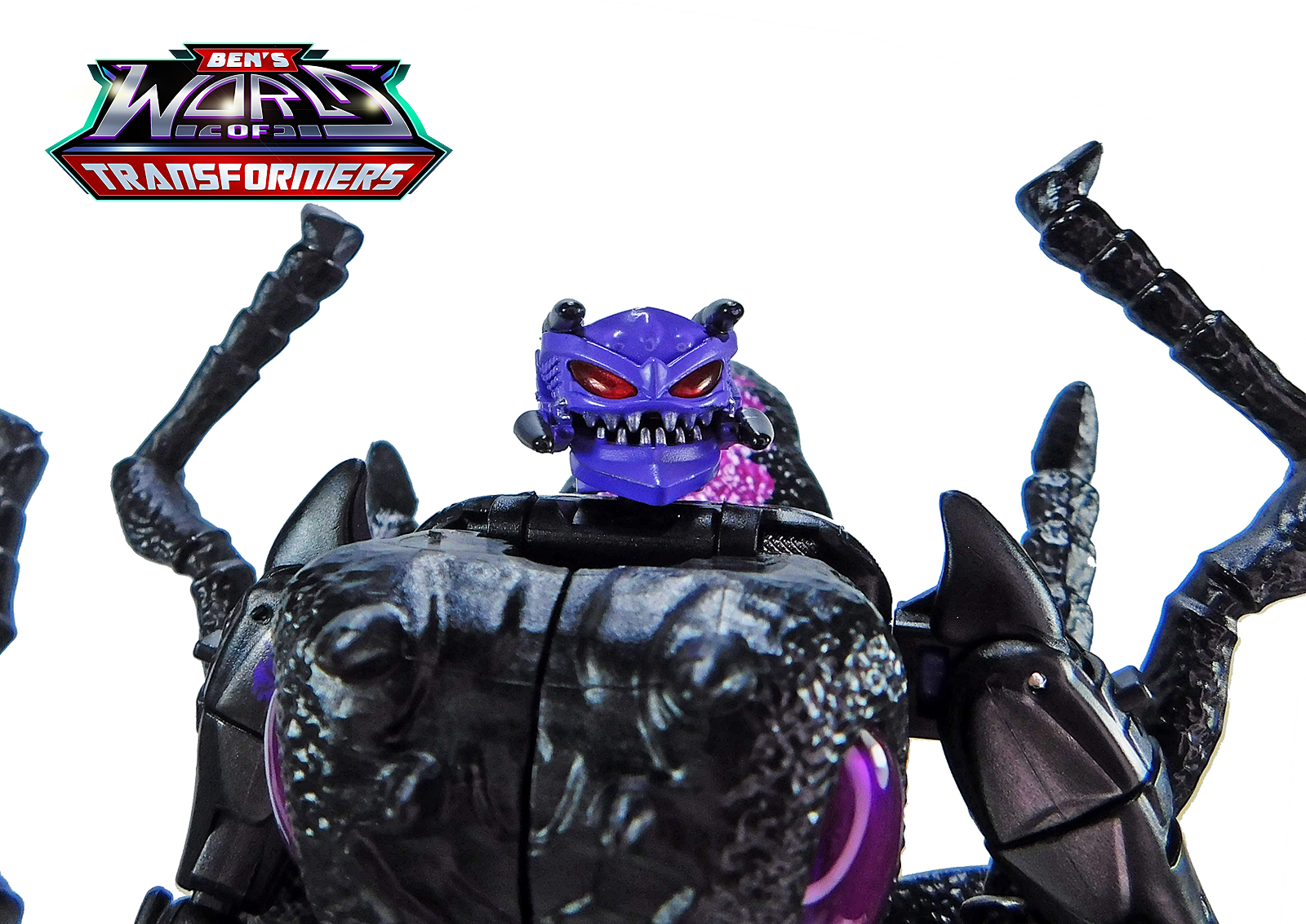 The additional accessory included with the figure is an extra head! This head's design is based on the Transmetal Scavenger head! This fun callback replicates that design with two large horns on the sides, a mouth full of long, sharp teeth and narrow, evil looking eyes. The colors are a mix of Antagony and Scavenger's colors, featuring gunmetal grey on the "helmet" section, green on the "forehead" area and metallic purple on the face. The eyes are translucent red. Overall the head has the unique and intense look befitting the original Predacon Scavenger.