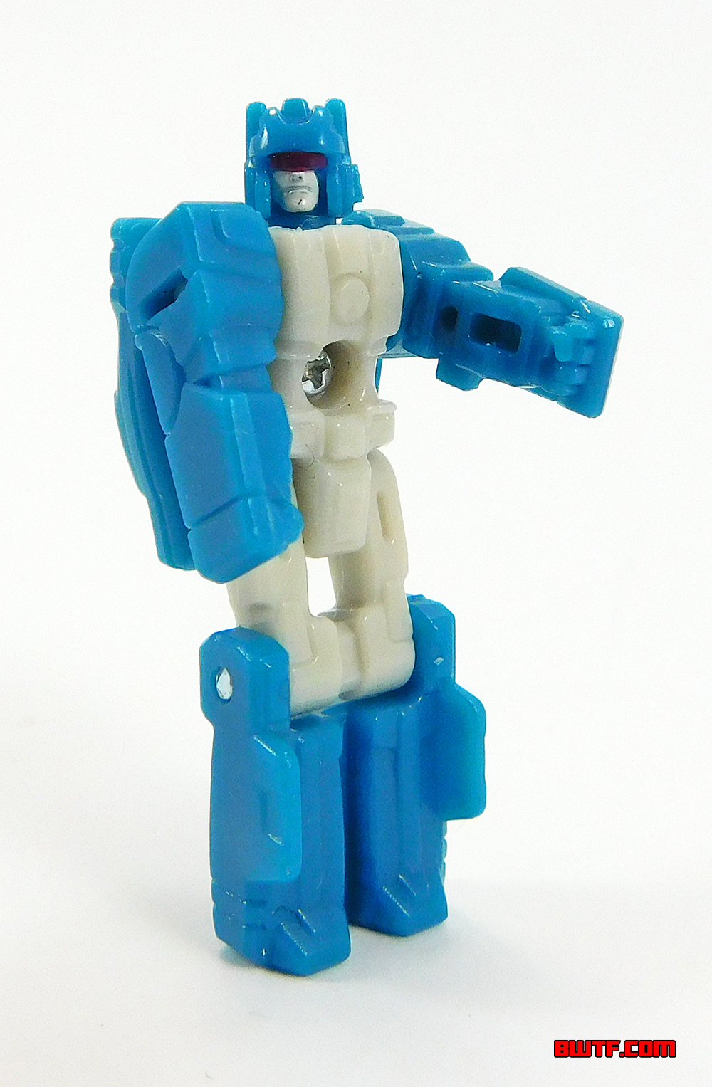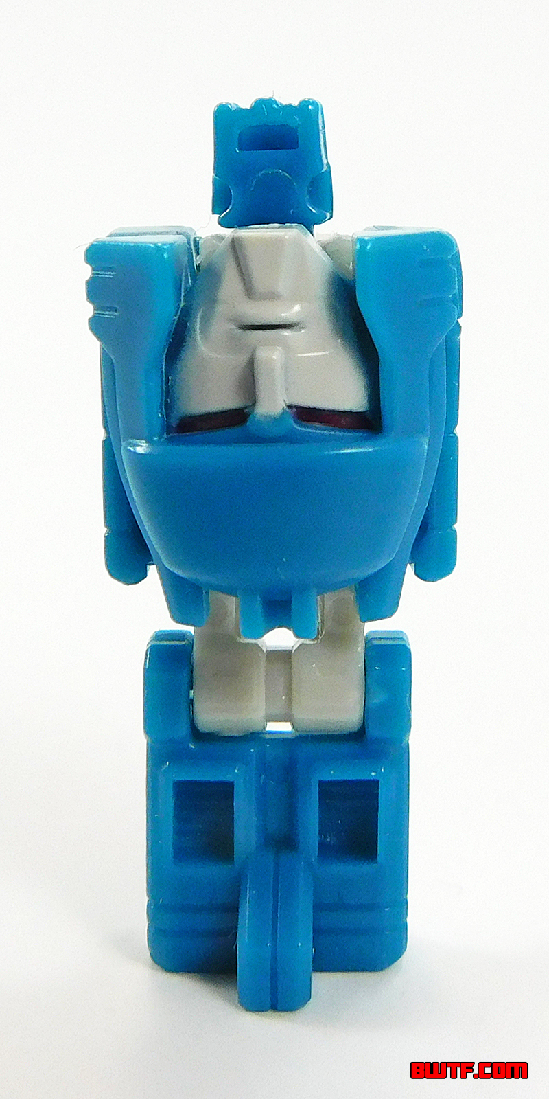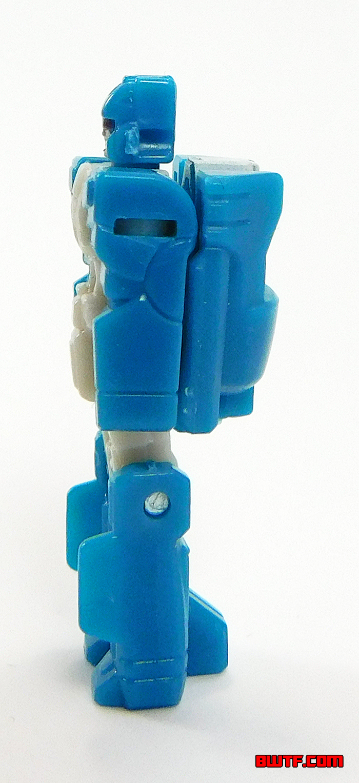 This mode reveals that Caliburst uses the same sculpt as Blowpipe with no retooling. The head, arms and lower legs are teal plastic. The torso and thighs are light grey. Surprisingly, his face is painted light grey while his eyes are painted purple. This looks great and makes a case for why all the Titan Masters in the line should have been painted.