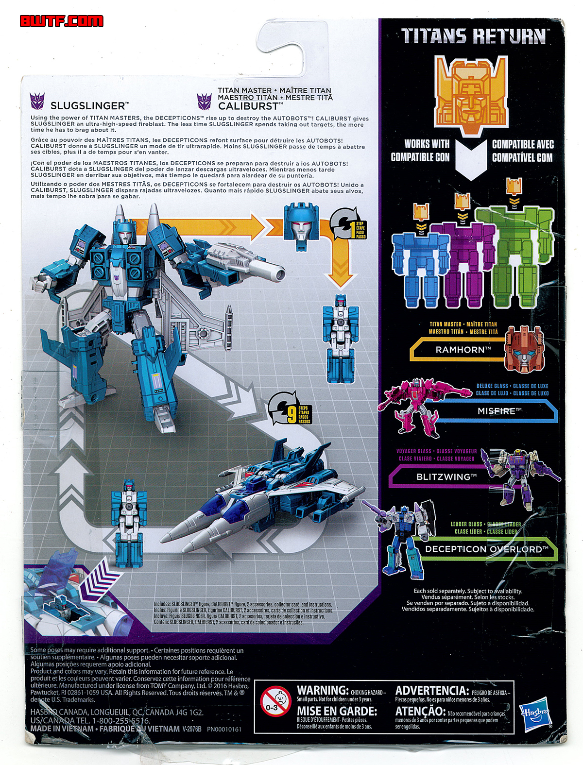 Slugslinger was one of the new Decepticons introduced in 1987 as a Targetmaster: a Transformer who wielded a weapon that could transform into a small figure. The character appeared in many different stories during the G1 era including the US and Japanese cartoons and the Marvel comic books. There was even a bit of a homage to this character in the "Energon" line. However this is the first time there has been a "G1 based" Slugslinger main line figure in a long time. This figure is a hevy retool of the same base design used for "Titans Return" Triggerhappy and Misfire, so check that review out before reading this one as this review will focus on the changes made to the design for this release.