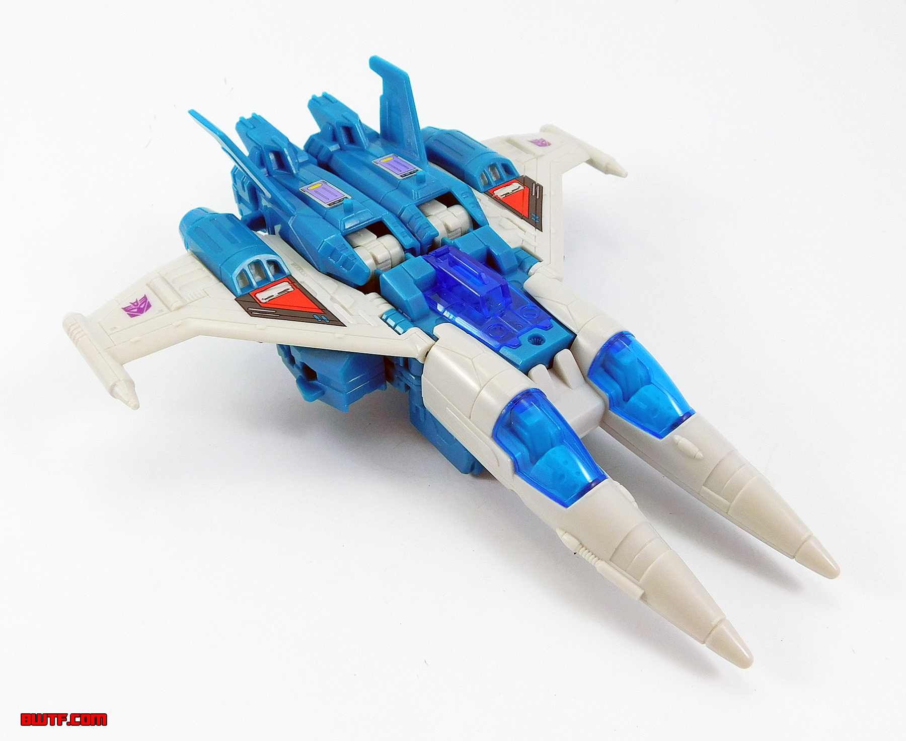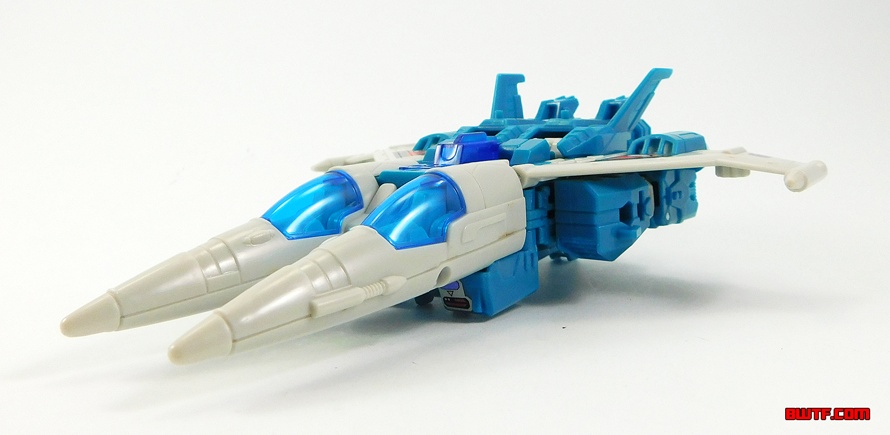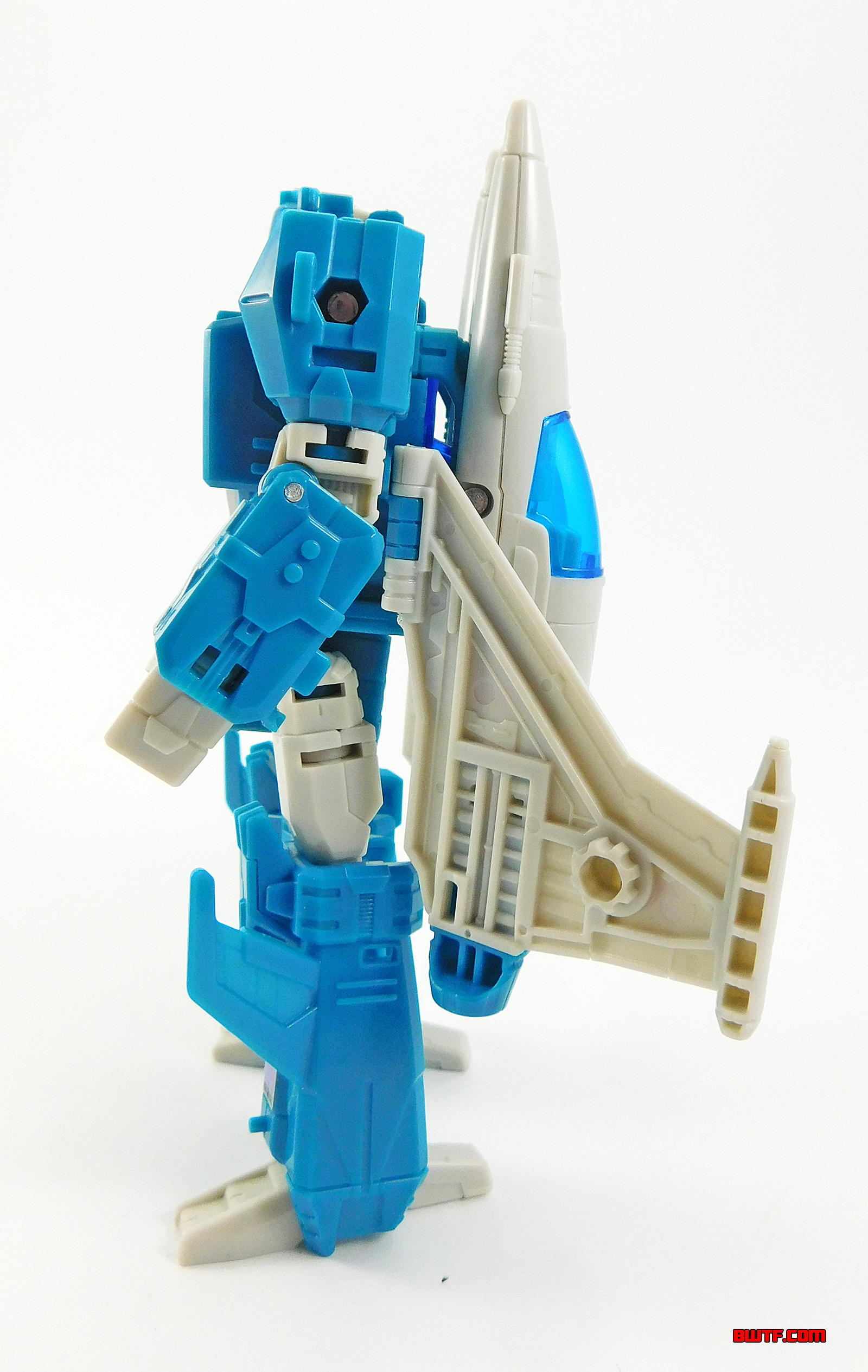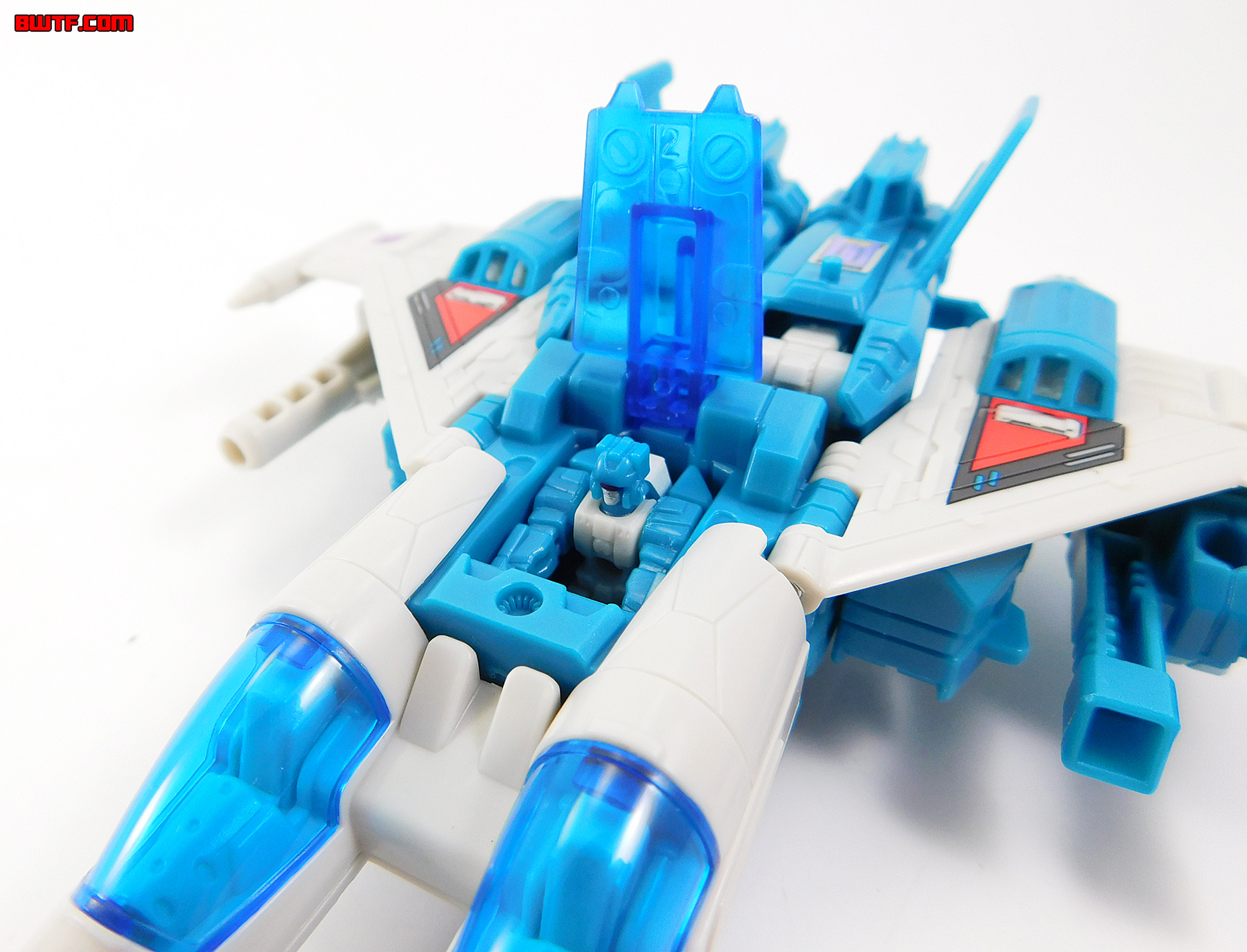 Much to its credit, this sculpt looks almost exactly like the G1 Slugslinger figure in vehicle mode. The biggest differences are the big blue translucent panel in the middle and the shape of the vertical stabilizers in the back. However the vehicle also has a lot of the key features of G1 Slugslinger's vehicle form. This includes having two cockpits in front (though the cockpits are too small to fit Titan Masters), wings that angle down wards the sides and thrusters attached to the back of the wings. Even though the vertical stabilizers are not the same shape as the G1 version, they are set at angles like the G1 figure. Overall the sculpt on this figure looks spectacular for a retool.