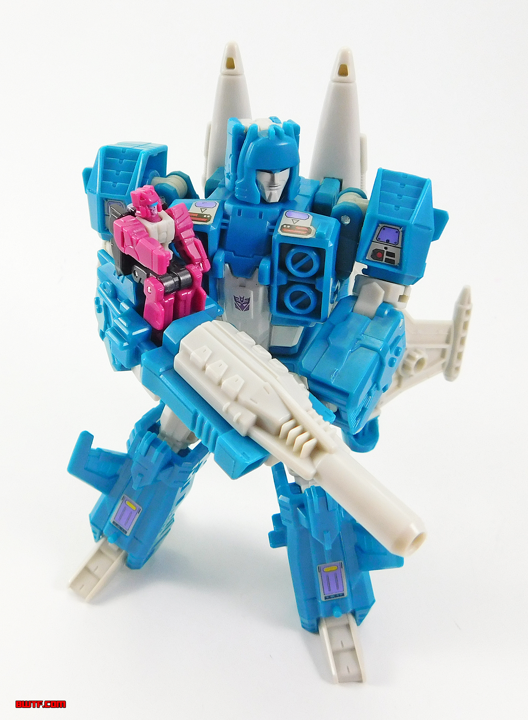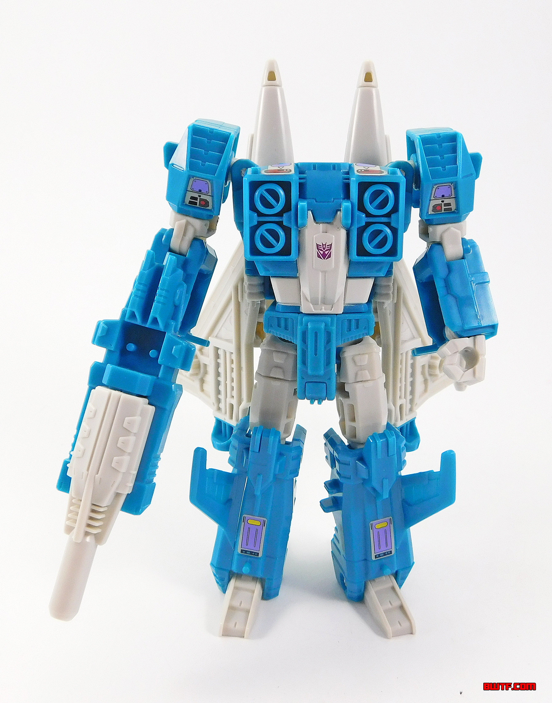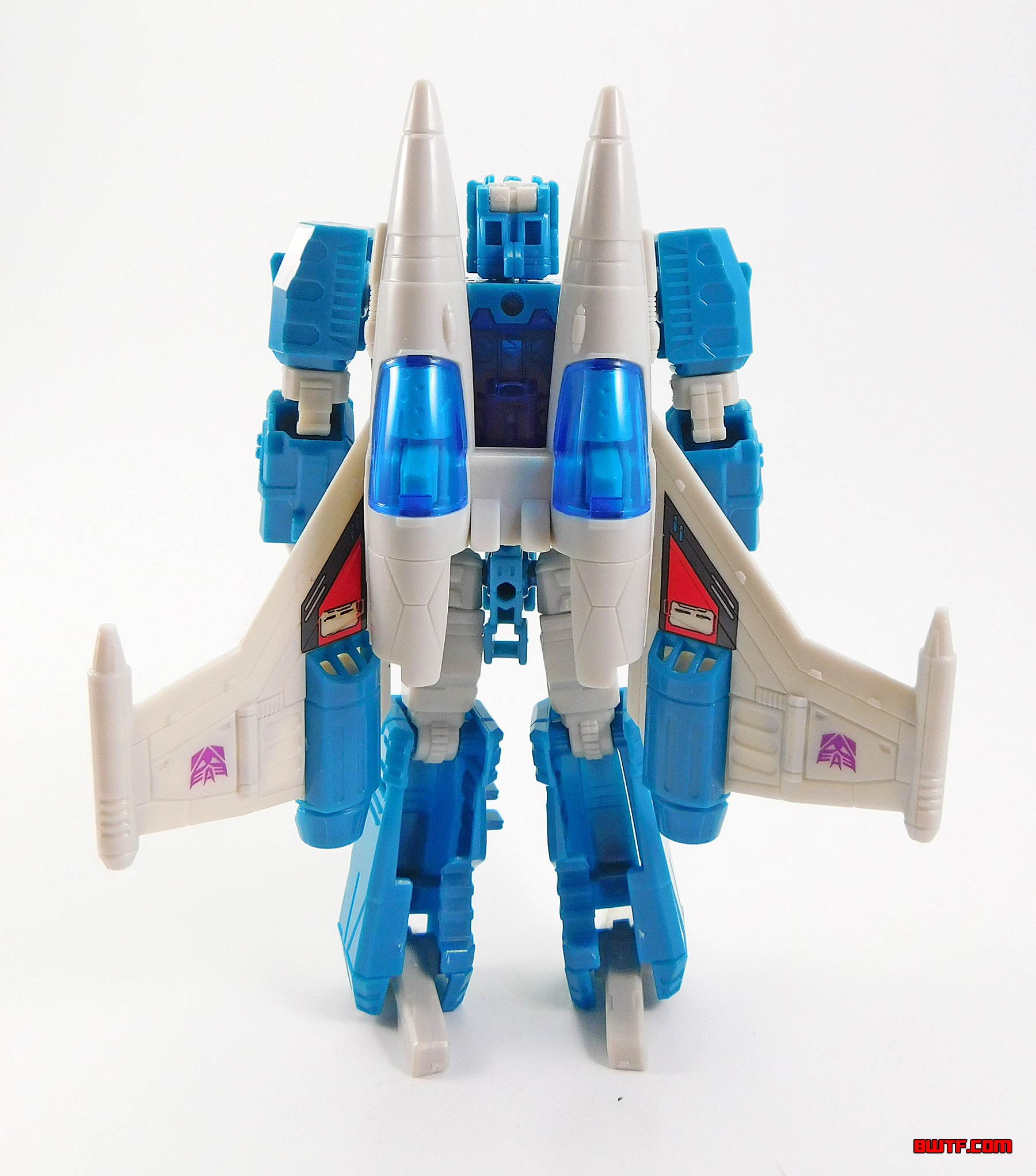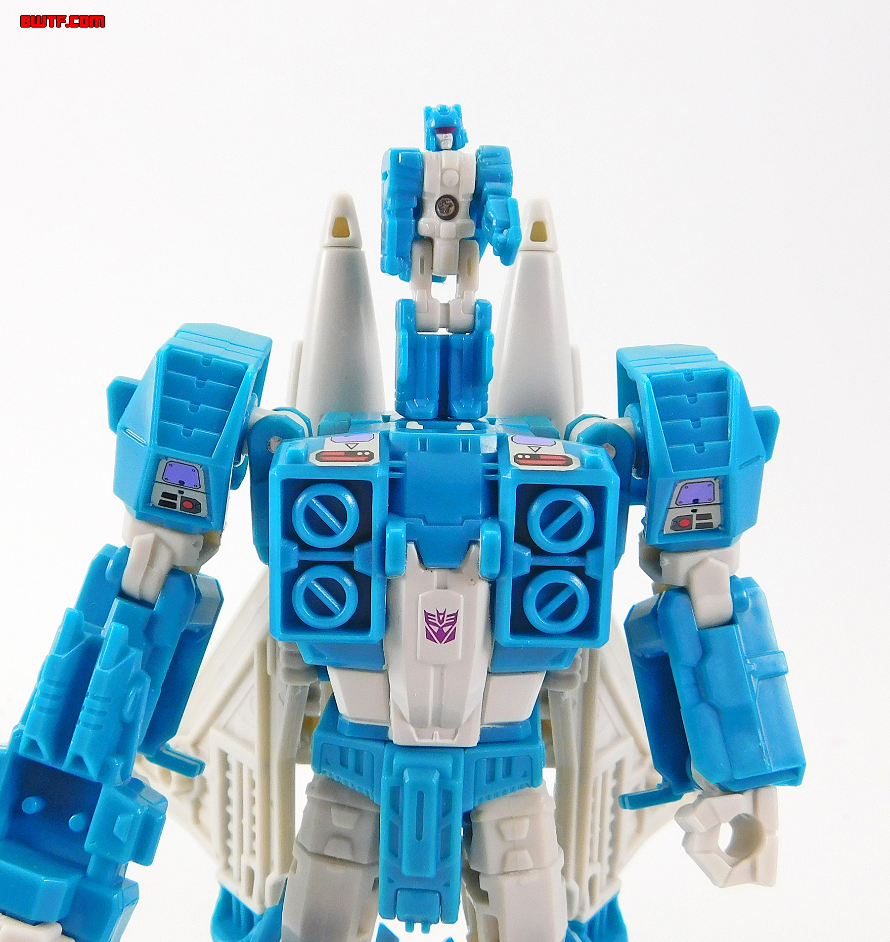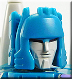 Much to its credit, this sculpt looks almost exactly like the G1 Slugslinger figure in vehicle mode. The biggest differences are the big blue translucent panel in the middle and the shape of the vertical stabilizers in the back. However the vehicle also has a lot of the key features of G1 Slugslinger's vehicle form. This includes having two cockpits in front (though the cockpits are too small to fit Titan Masters), wings that angle down wards the sides and thrusters attached to the back of the wings. Even though the vertical stabilizers are not the same shape as the G1 version, they are set at angles like the G1 figure. Overall the sculpt on this figure looks spectacular for a retool.