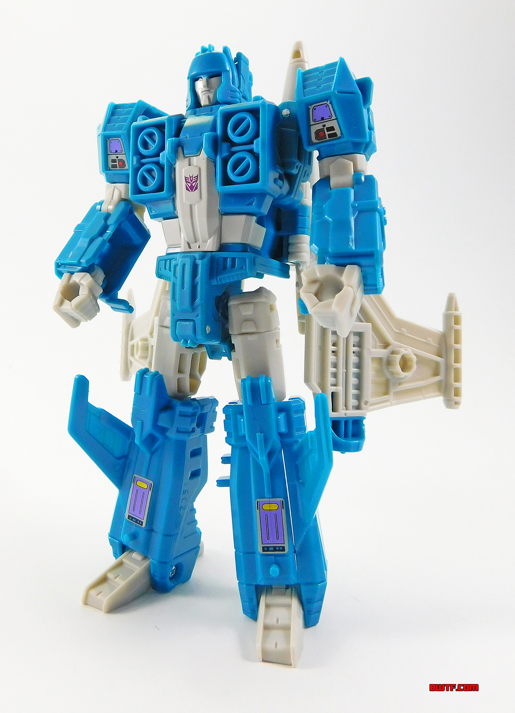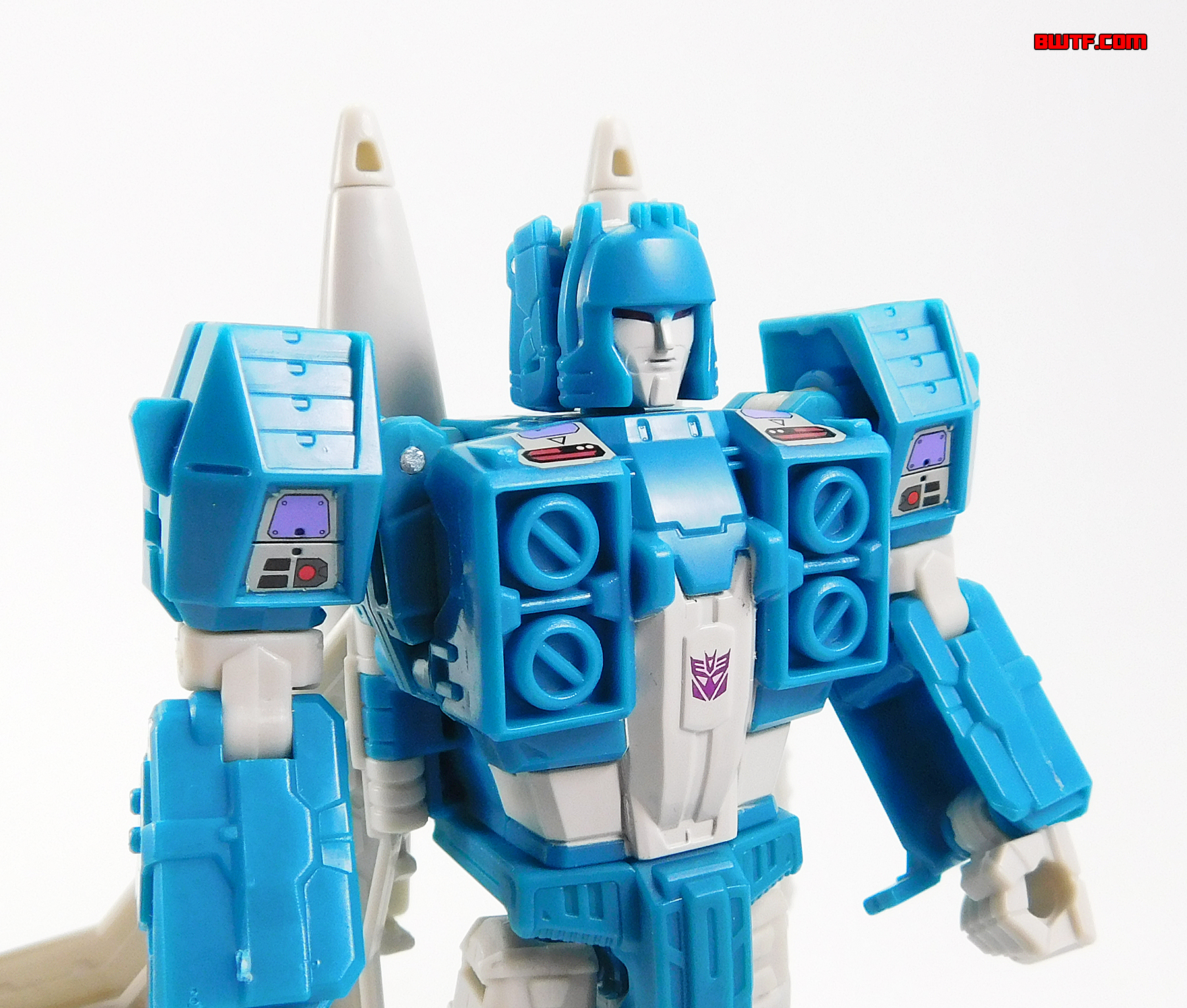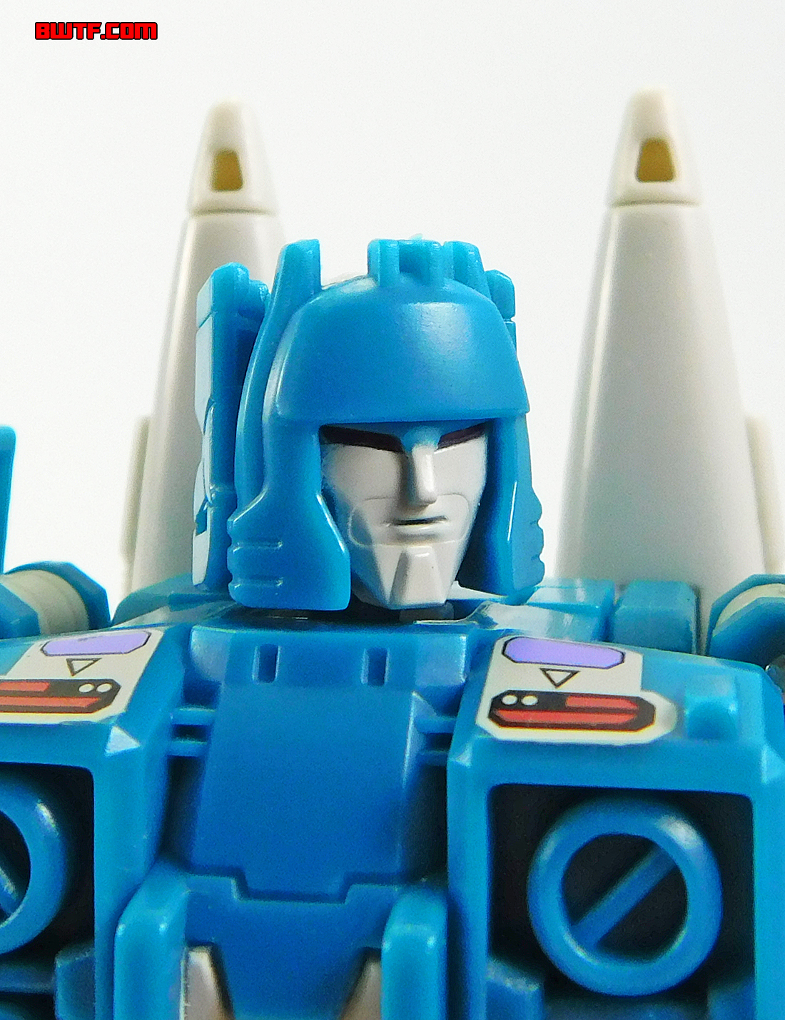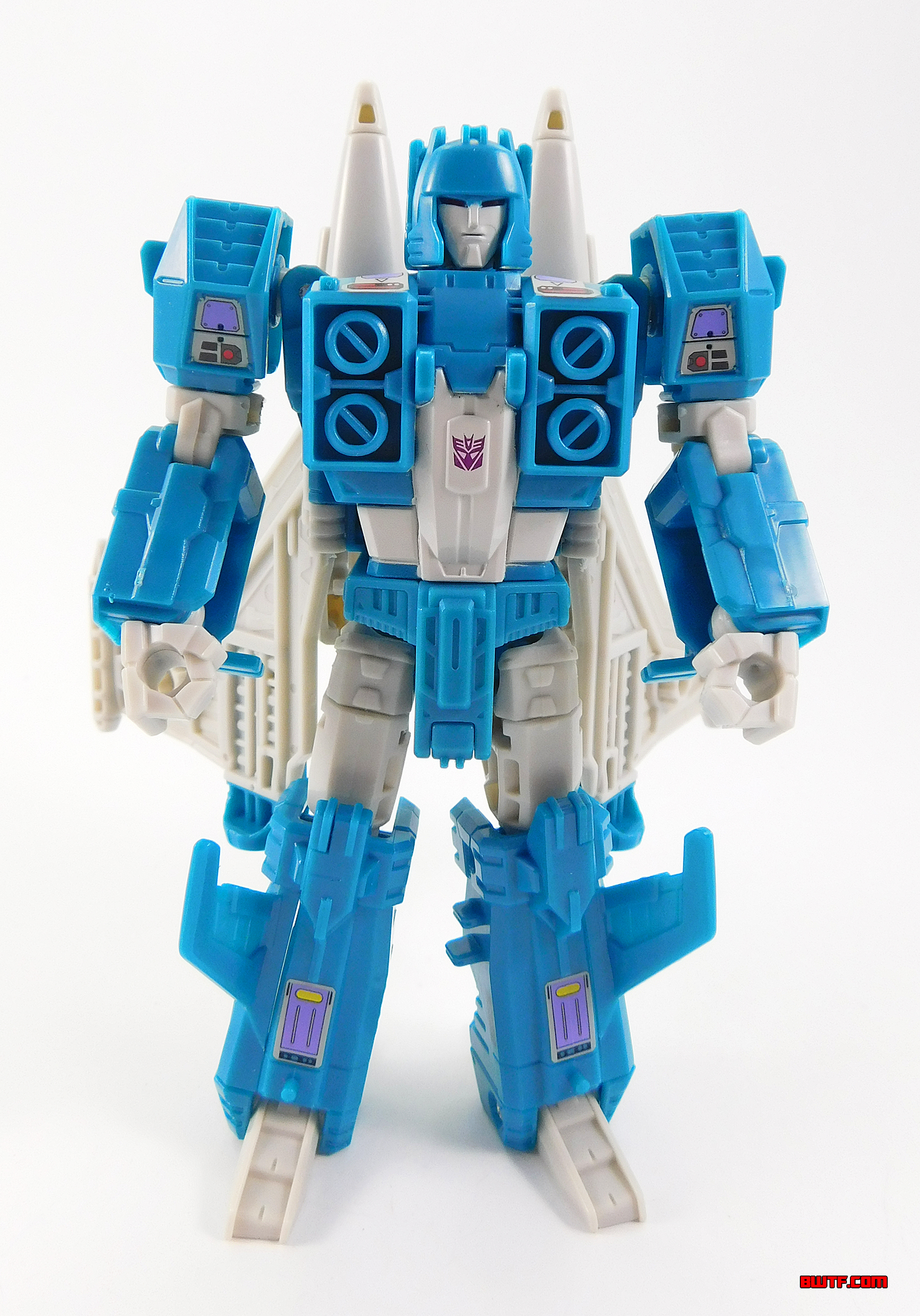 Much to its credit, this sculpt looks almost exactly like the G1 Slugslinger figure in vehicle mode. The biggest differences are the big blue translucent panel in the middle and the shape of the vertical stabilizers in the back. However the vehicle also has a lot of the key features of G1 Slugslinger's vehicle form. This includes having two cockpits in front (though the cockpits are too small to fit Titan Masters), wings that angle down wards the sides and thrusters attached to the back of the wings. Even though the vertical stabilizers are not the same shape as the G1 version, they are set at angles like the G1 figure. Overall the sculpt on this figure looks spectacular for a retool.