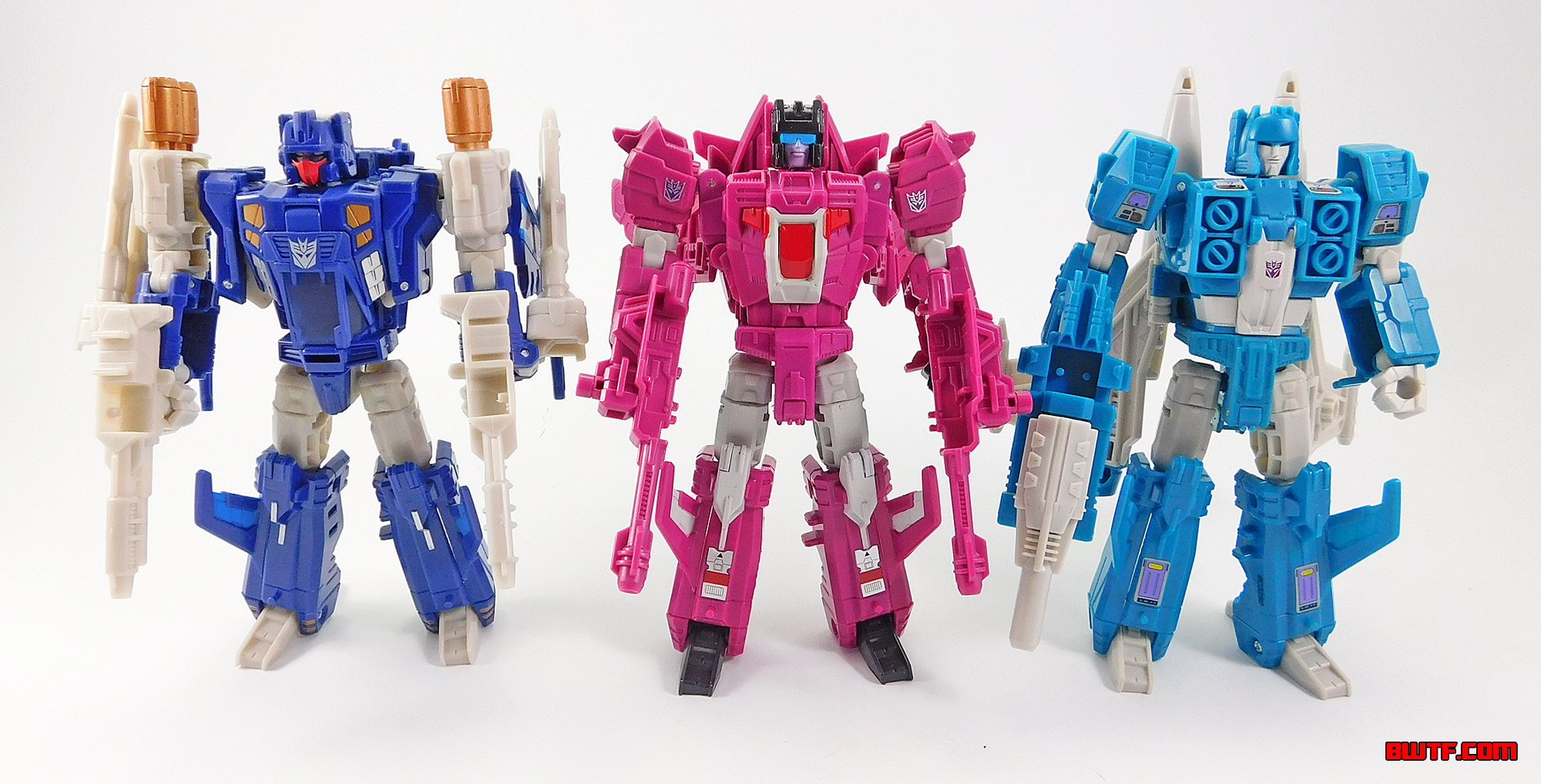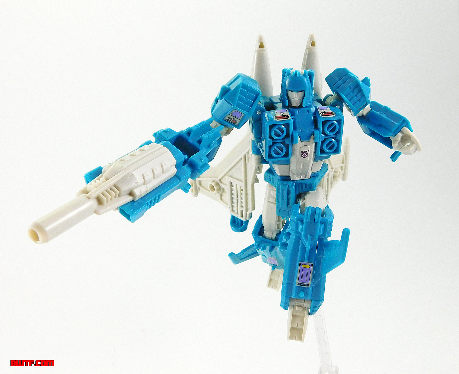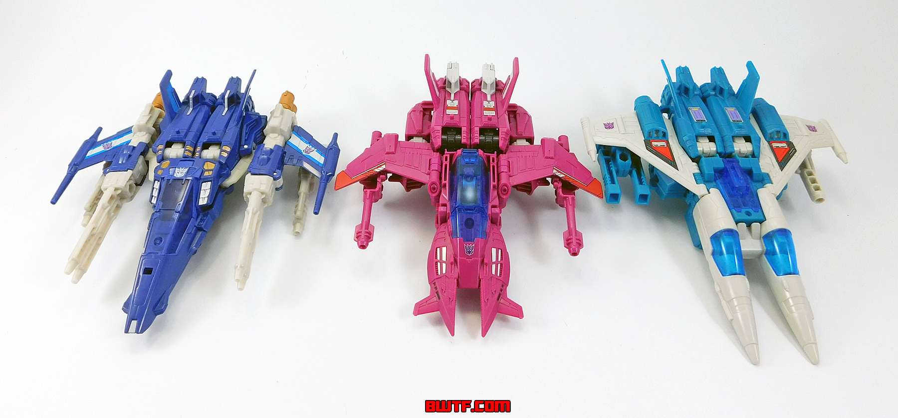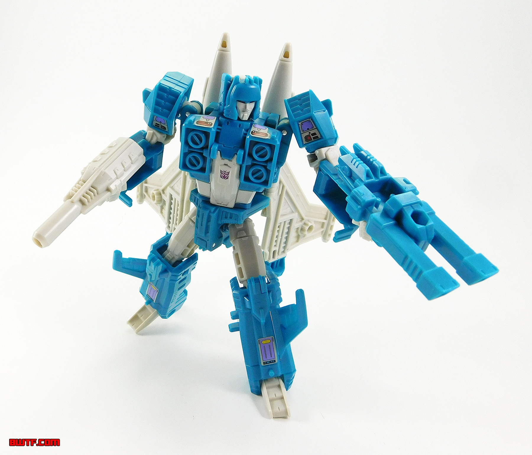 Much to its credit, this sculpt looks almost exactly like the G1 Slugslinger figure in vehicle mode. The biggest differences are the big blue translucent panel in the middle and the shape of the vertical stabilizers in the back. However the vehicle also has a lot of the key features of G1 Slugslinger's vehicle form. This includes having two cockpits in front (though the cockpits are too small to fit Titan Masters), wings that angle down wards the sides and thrusters attached to the back of the wings. Even though the vertical stabilizers are not the same shape as the G1 version, they are set at angles like the G1 figure. Overall the sculpt on this figure looks spectacular for a retool.