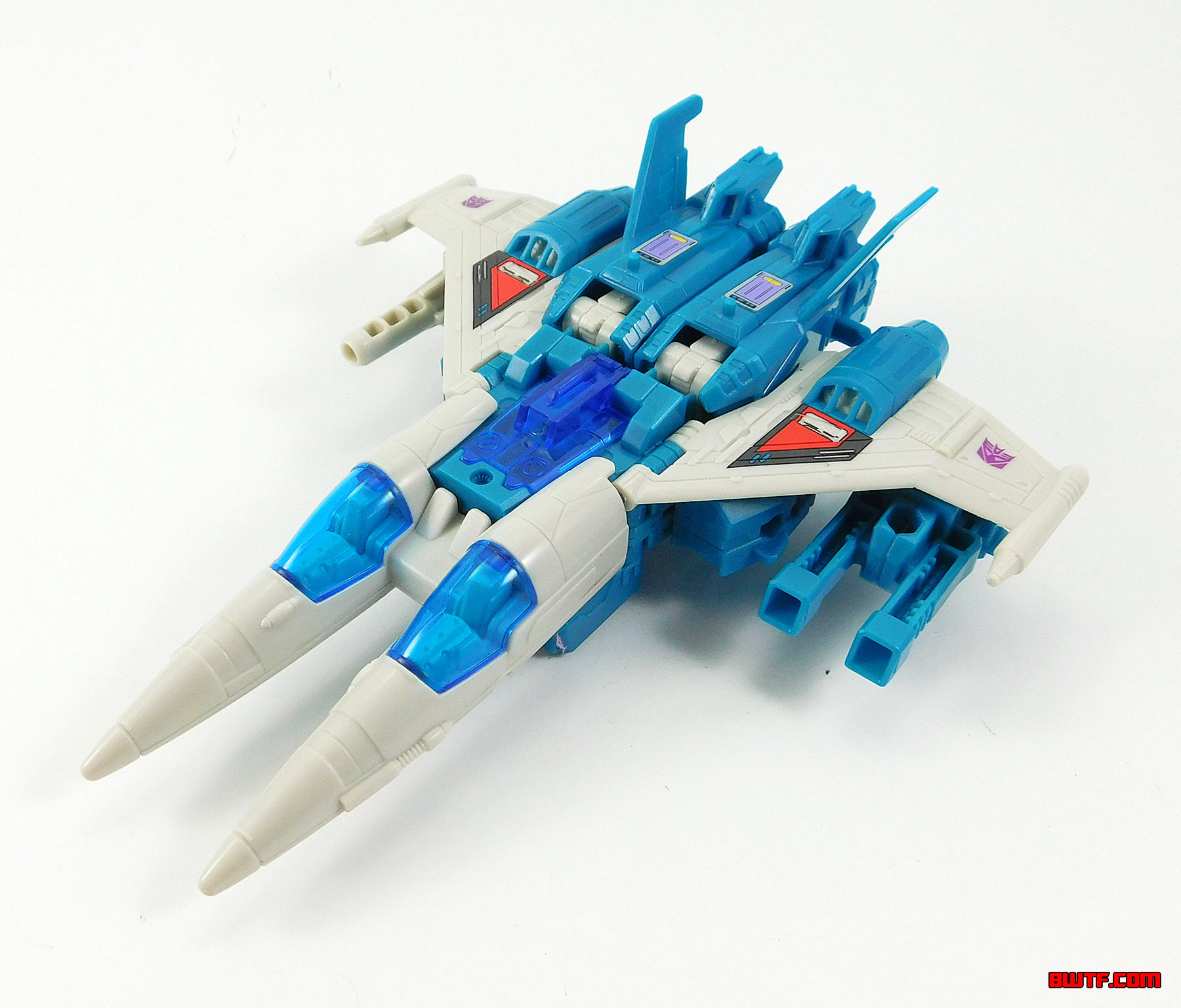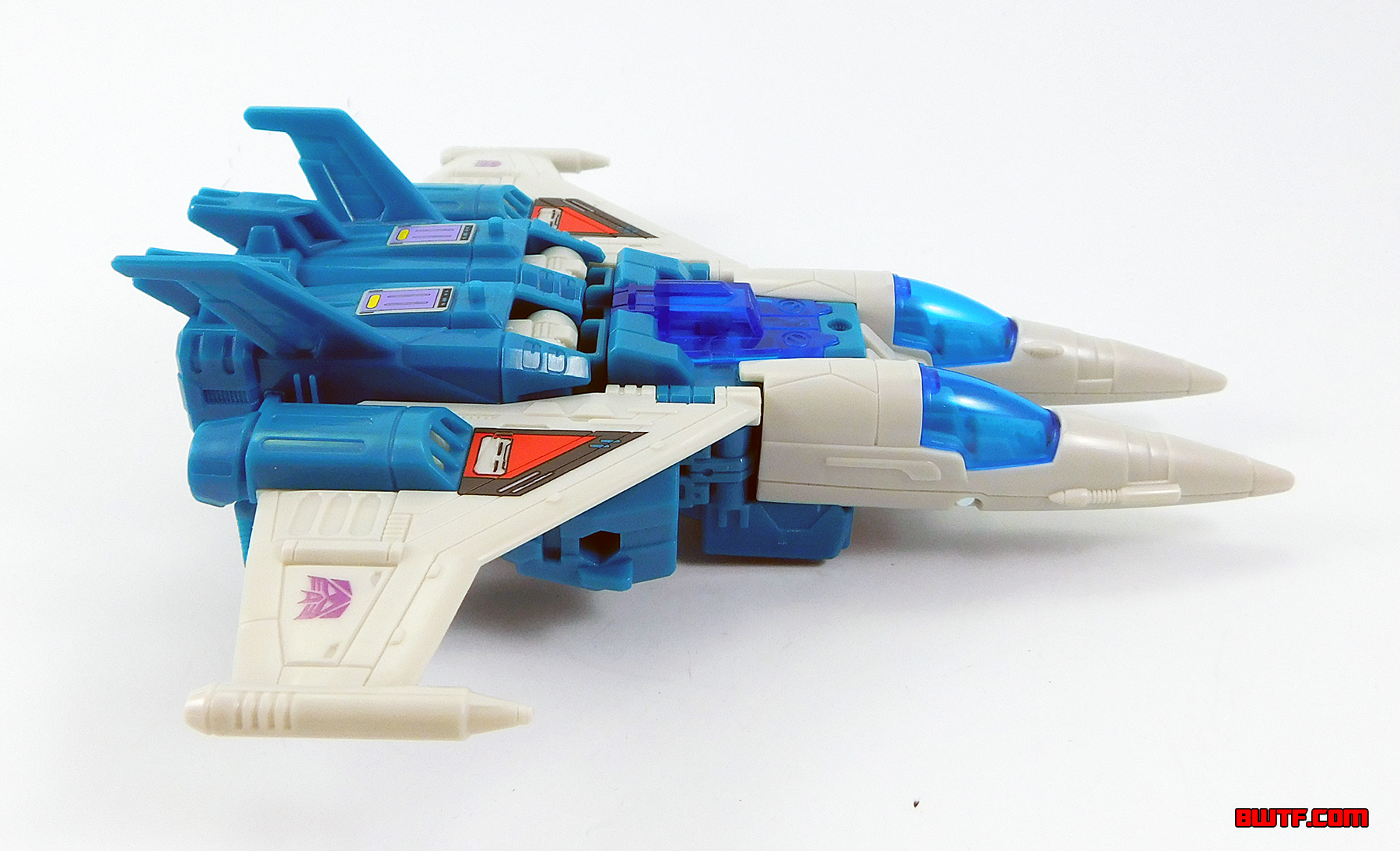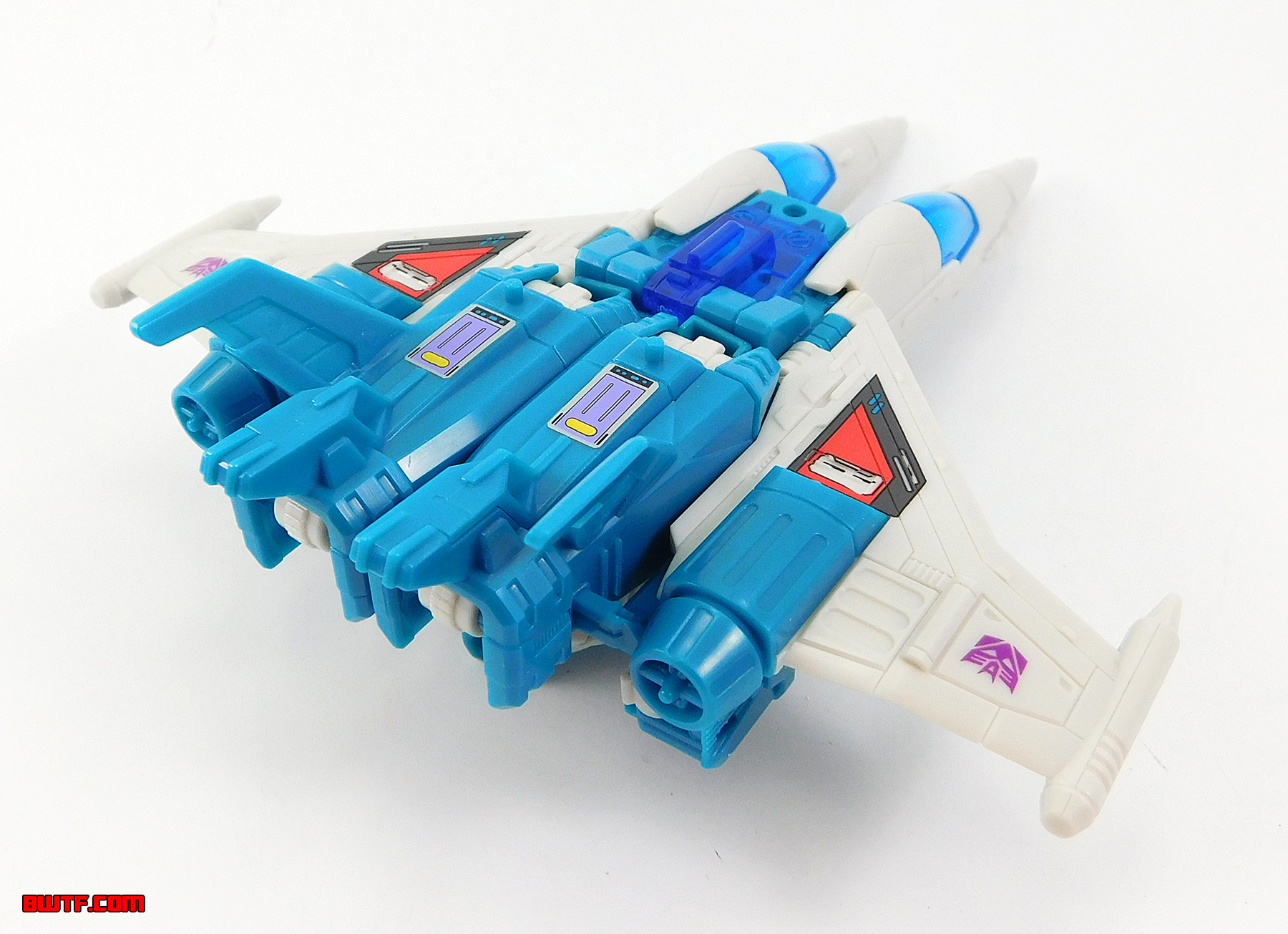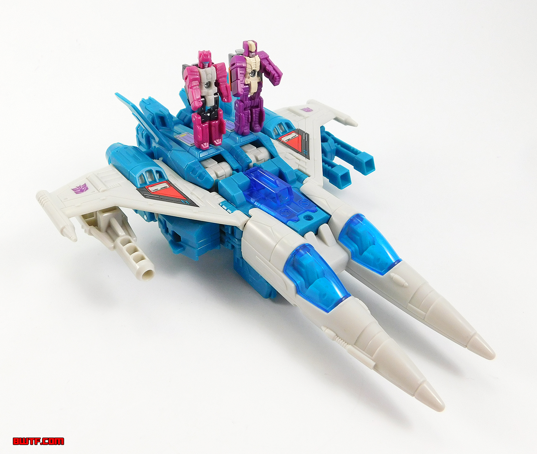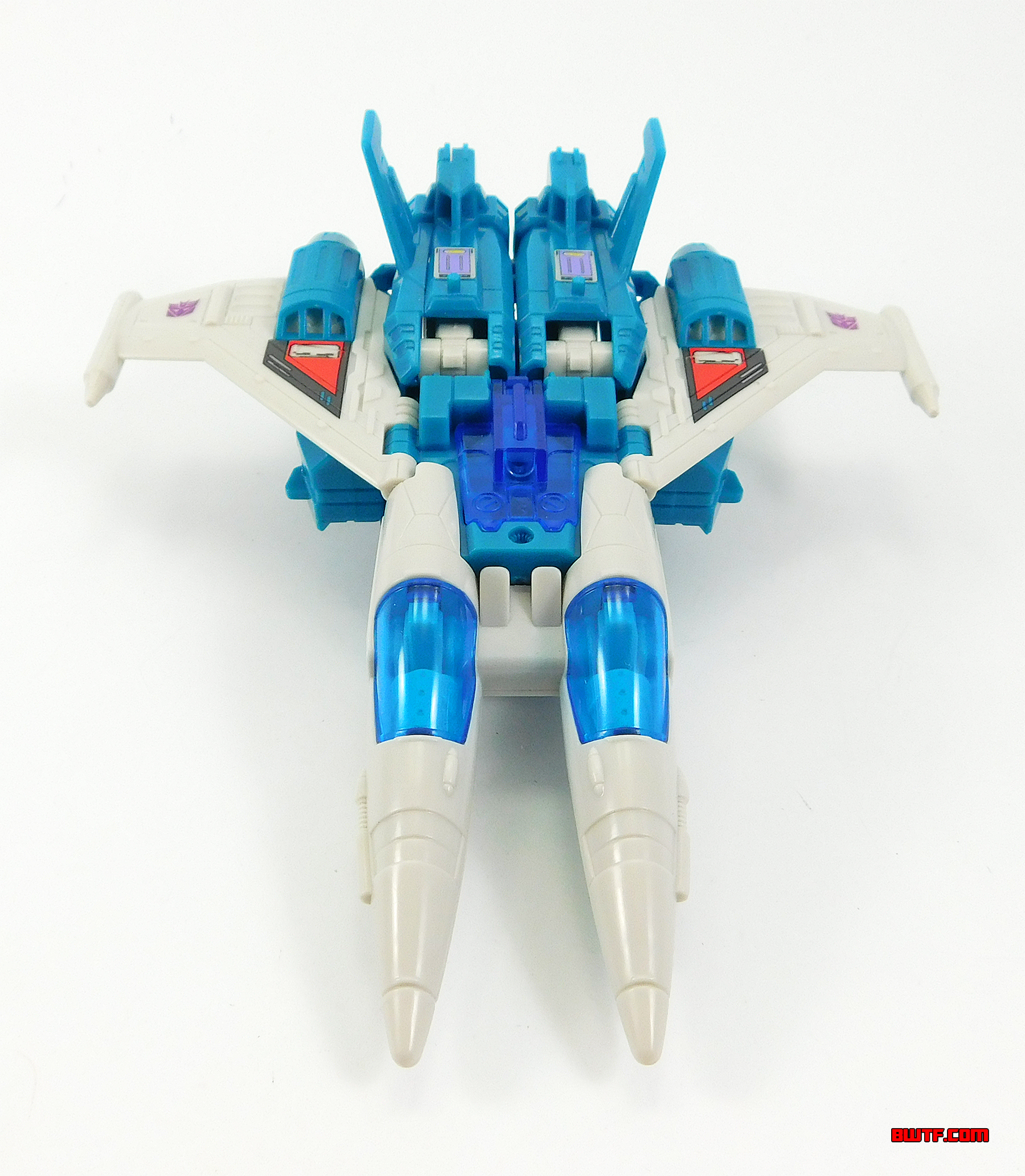 This mode has teal and light grey plastic like the robot mode, but it also has two shades of translucent blue plastic. A lighter shade is used on the two cockpits in front, allowing you to see the cool sculpted details inside which include a seat in each cockpit. A darker translucent blue is used for a panel in the center covering up where Caliburst (or any Titan Master) can sit. Like the robot mode, this form has several tampographs which are meant to emulate the stickers on G1 Slugslinger. This includes purple Decepticon symbols on the wings, a red/grey/silver sticker on the wings in front of the thrusters and a silver/yellow/lavender tampograph on the top towards the back. For the most part the details on these tampographs emulate the G1 Slugslinger's stickers and they add a lot of nice detail to the vehicle.