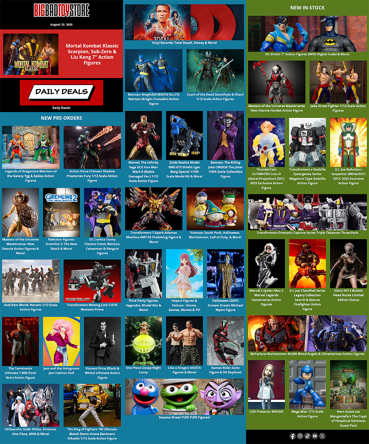 Mortal Kombat is back with three new action figures of Scorpion, Sub-Zero and Liu Kang! Legends of Dragonore has two new action figures with Ygg and Spikes! Jem and The Holograms are Truly Outrageous! This 12" doll with 28 points of articulation is ready to take the center stage. Jem comes with 15 accessory pieces including a "VIP" package with a commemorative Jem and the Holograms concert ticket, VIP badge, stickers, an additional outfit with matching accessories and reversible belt to create versatile looks. From Fext Hobby comes a new action figure series featuring the Acid Rain World, Project Novark! Decepticons join the Missing Link series in a retro form that imagines what they would have looked like had they been released with the Gen 1 line. C-01N Nemesis Prime is based on the C-01 Optimus Prime with a sleek black deco. The “Merchant of Menace” has returned to NECA’s Ultimates line in classic black and white! A horror and camp icon with an unmistakable voice, the incomparable Vincent Price appeared in more than 100 films during his lifetime. However, this Master of Horror wasn’t just an actor of stage, radio, and screen; he was also an art historian and gourmet cook! Celebrate his unique legacy with this 7-inch scale Ultimate Vincent Price action figure.