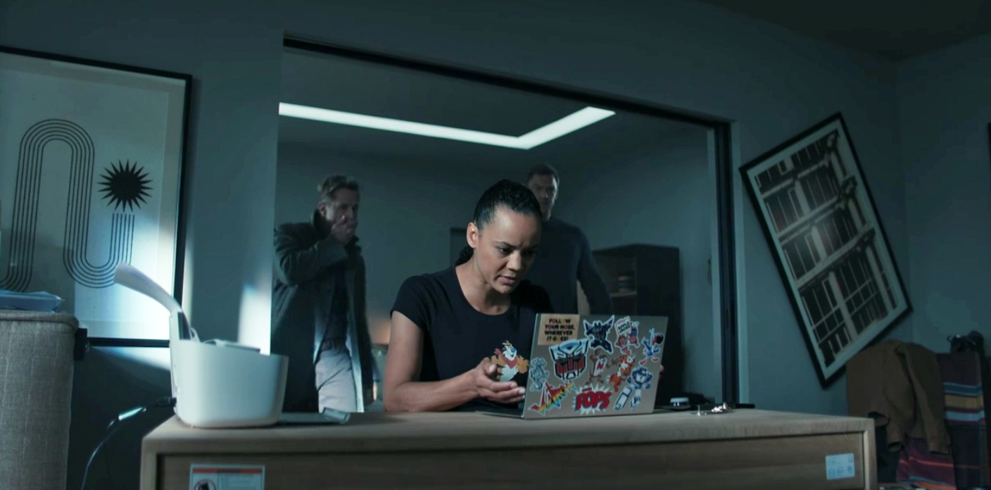 With Transformers going into its 40th Anniversary, it is no surprise that the brand will appear in in pop culture media. There have been many sightings of the Transformers brand over the years in other media and with today's debut of Jack Reacher Season 2 we have another. In the debut episode of the show's second season the character Neagley (Maria Sten) opens up a laptop and as she looks at it, we get a view of the back showing several Transformers stickers! An Autobot symbol, Skywarp and Soundwave all appear alongside other retro stickers such as Voltron and Tony the Tiger. Check out the screenshot from the episode below.