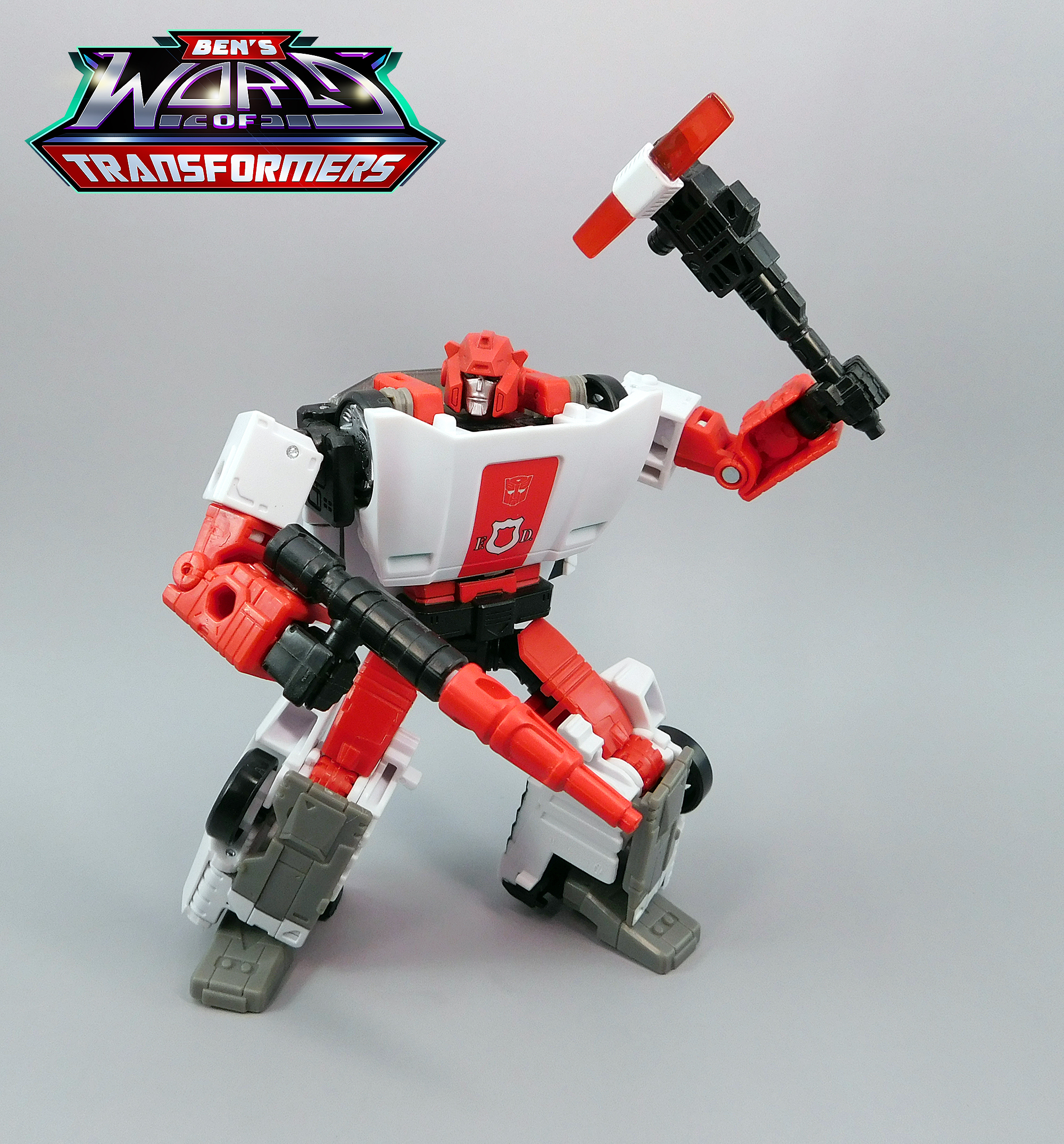 This G1-inspired toy converts into Earth emergency vehicle mode in 17 steps. Comes with a lightbar that attaches to the vehicle mode, shoulder mounted rocket launcher, and particle beam blaster accessories. Combine the particle beam blaster and lightbar to form an axe weapon accessory!