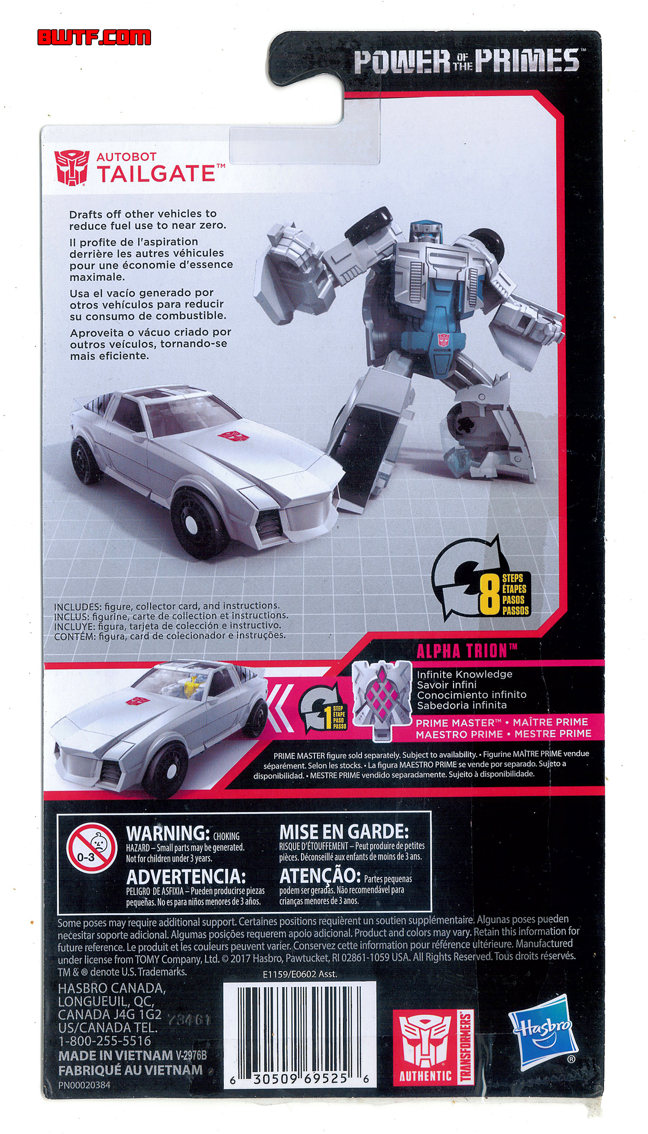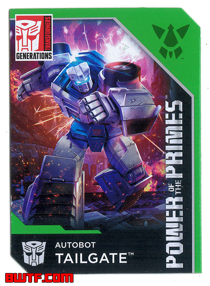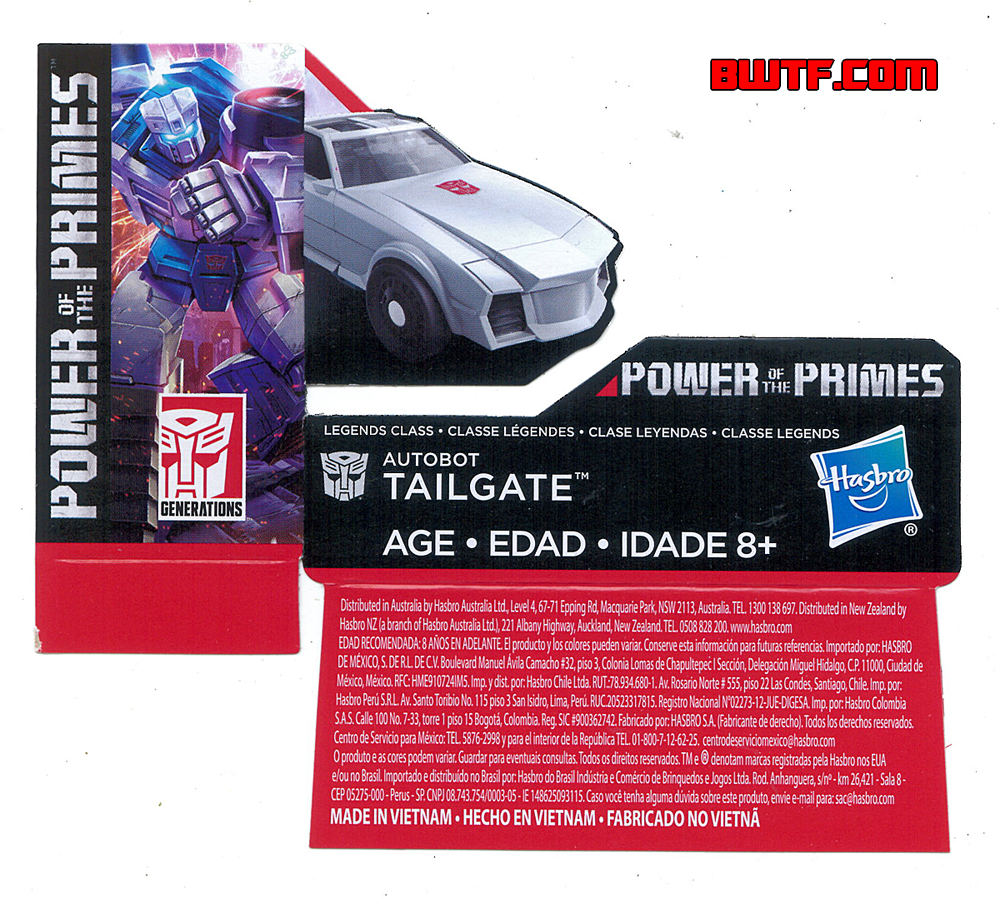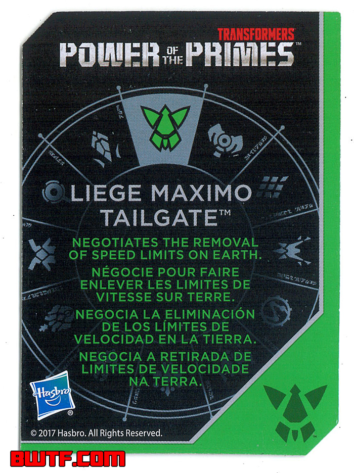 The "Power of the Primes" figures from Legends Class up come with collectors cards. However, unlike the "Titans Return" cards which featured tech spec stats, these focus on what ability the character gets if they connect to a specific Prime Master Spark. This means there are thirteen potential card variations per character (one for each Prime)! In my copy of the Tailgate figure it indicates he can Power-Link with Liege Maximo to eliminate speed limits on Earth, a callback to G1 Tailgate's belief that Earth machines were all alive.