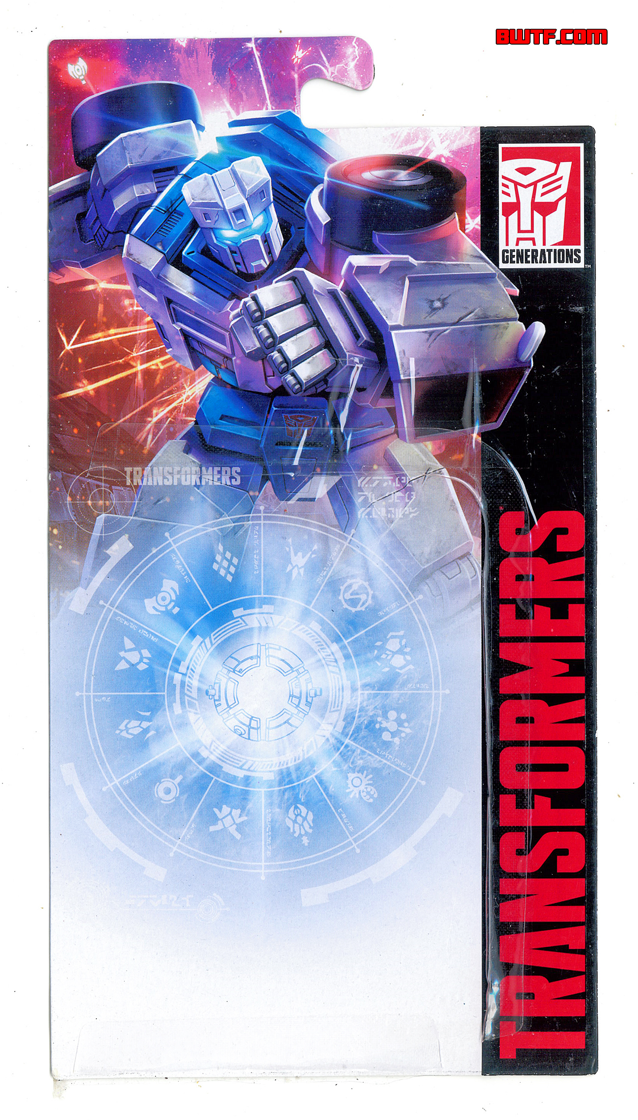 Tailgate is packaged in blister card style packaging. The card features the "Transformers" logo in the front against a black background with the "Generations" logo above that. Most of the card is taken up by Tailgate's new artwork with a smaller "Transformers" logo on top, almost like a watermark. This is all new artwork based on the figure in the packaging. The art is colored in a beautifully painted fashion that recalls the artwork from G1 toy packaging but more dynamic, with Windcharger in a running pose. The figure is in robot mode inside the bubble with a collector's card behind him. The insert in front shows a photo of the figure in vehicle mode with the name "Windcharger" printed next to an Autobot symbol. earThe back of the packaging features a grey grid with CG renders of the figure on top in both modes. Overall it's really cool packaging and I'm happy the art features so prominently.