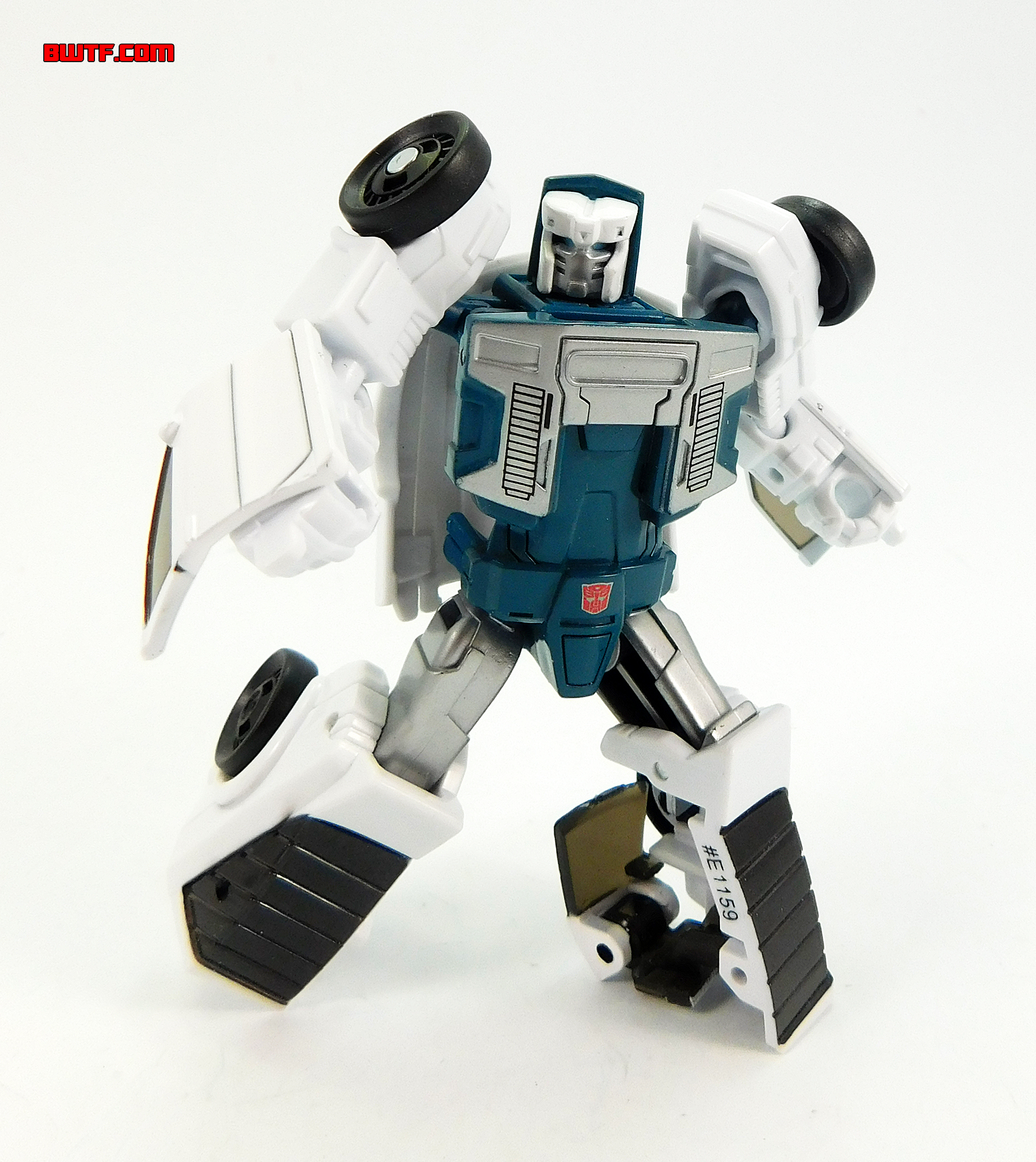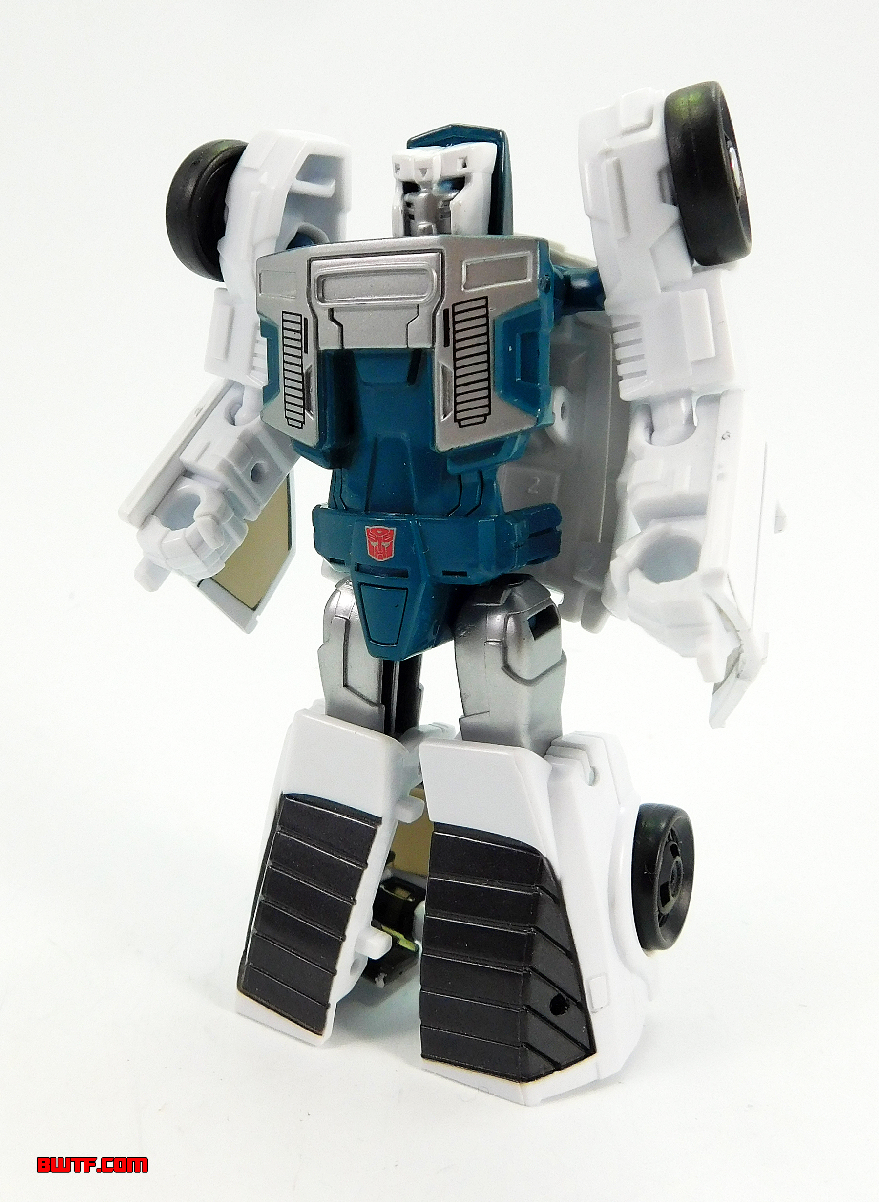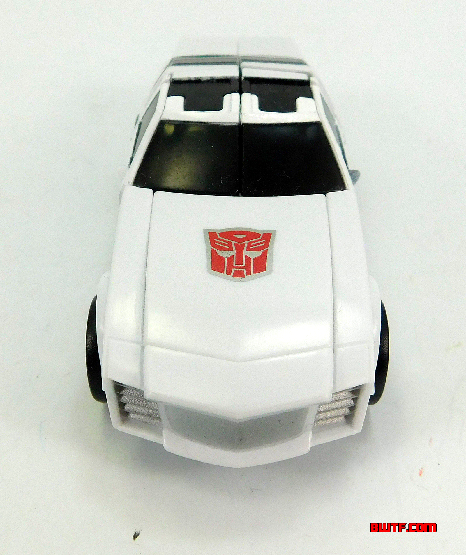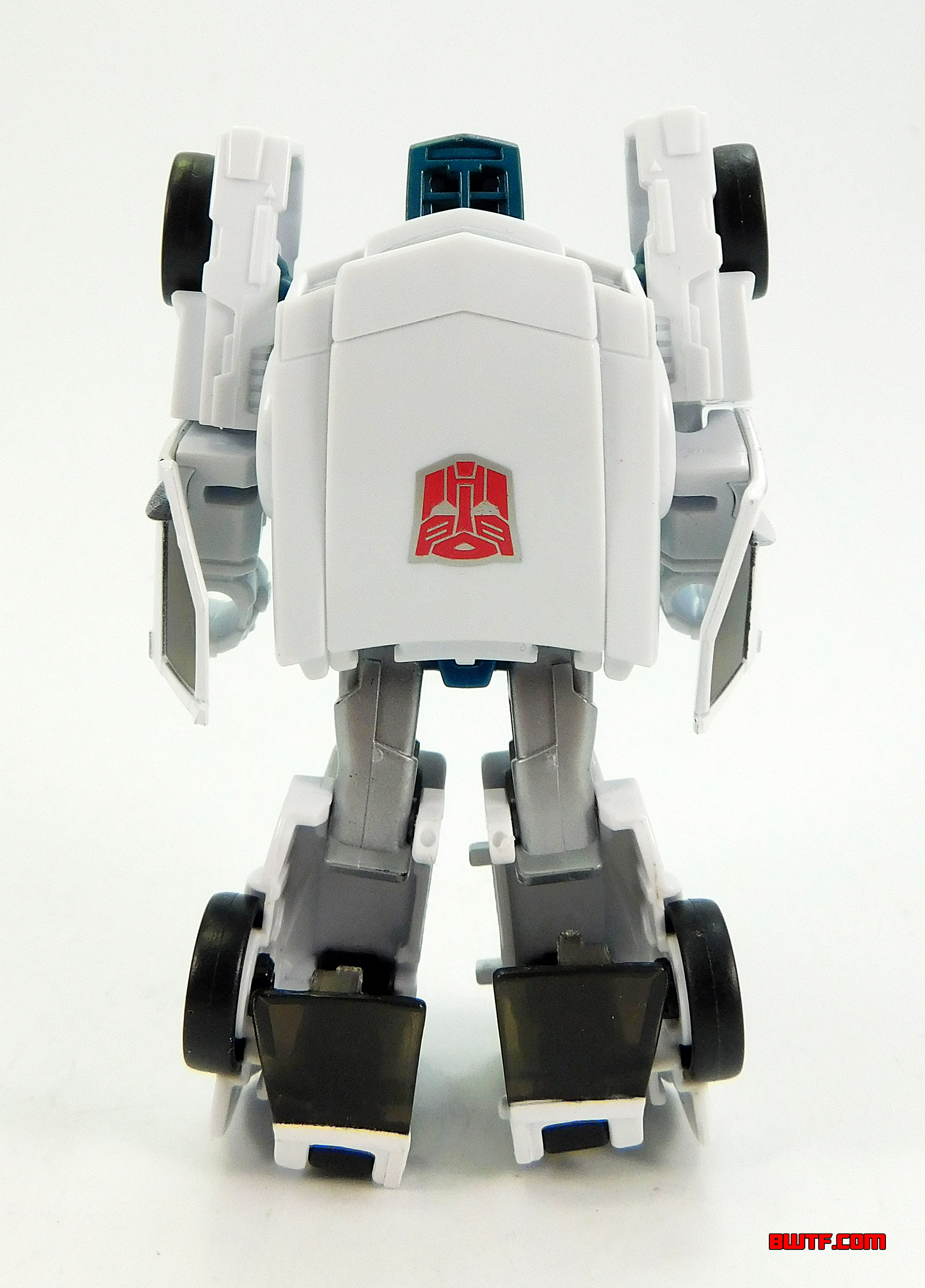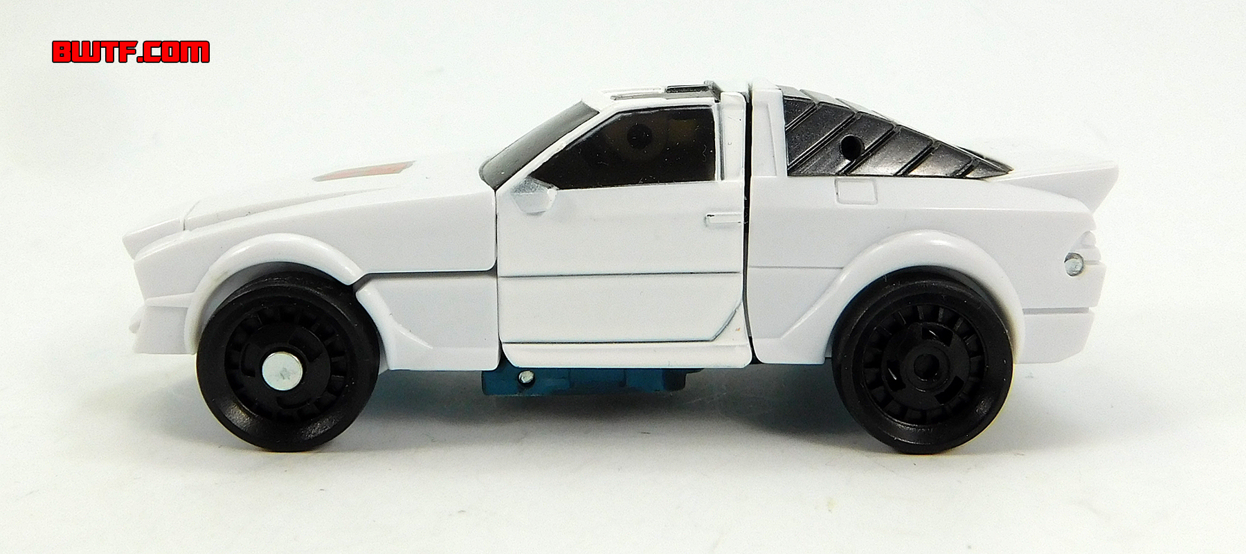 There have been no tooling changes for this mode, so it basically looks like a white and black version of Windcharger's vehicle mode. This jives with how G1 Tailgate looked since he too was a Windcharger redeco. There is silver paint used in the front and black paint used in the back. The hood has a large Autobot symbol on it, calling back to the sticker that was on G1 Tailgate's hood. The deco looks great and is serves as a cool G1 homage.