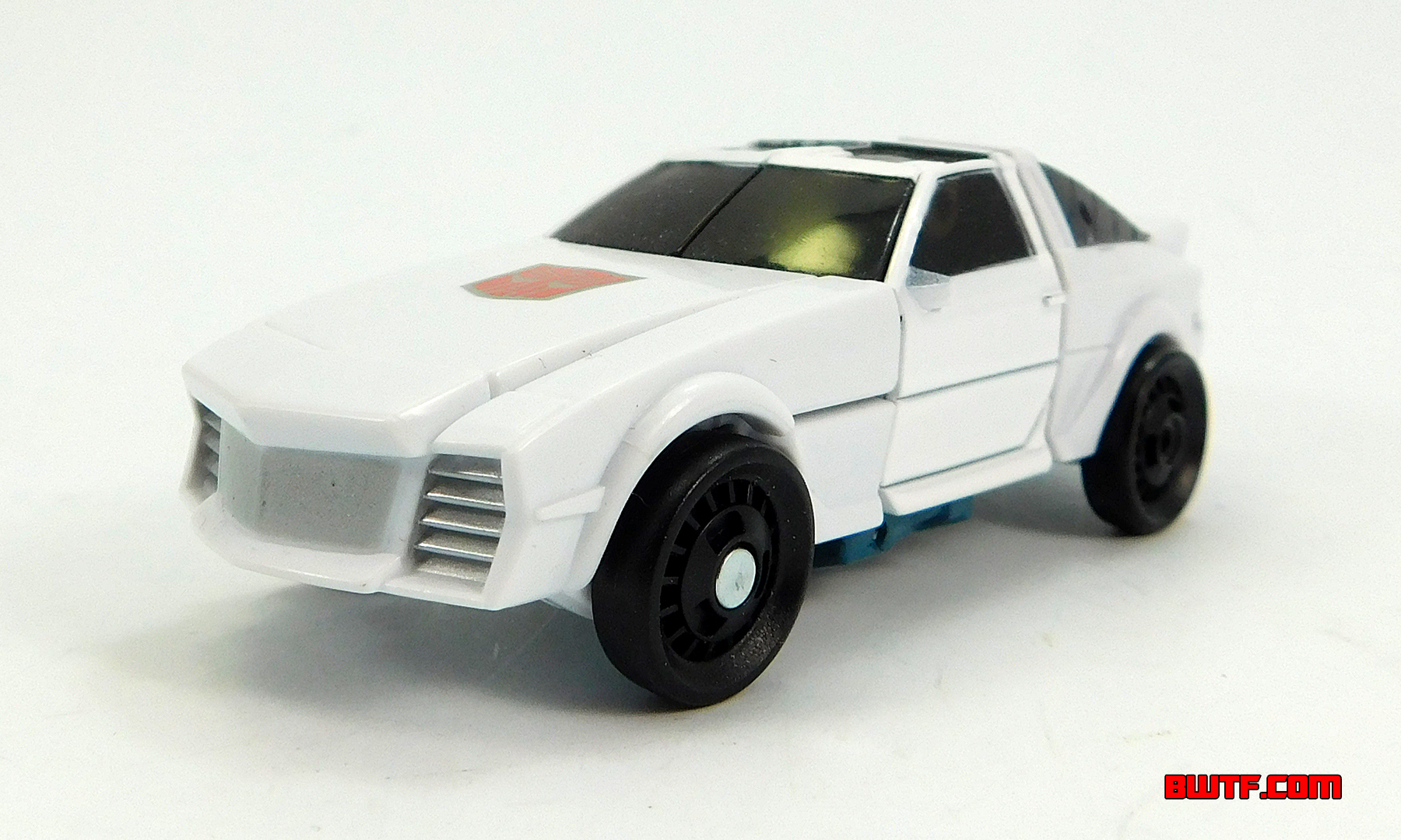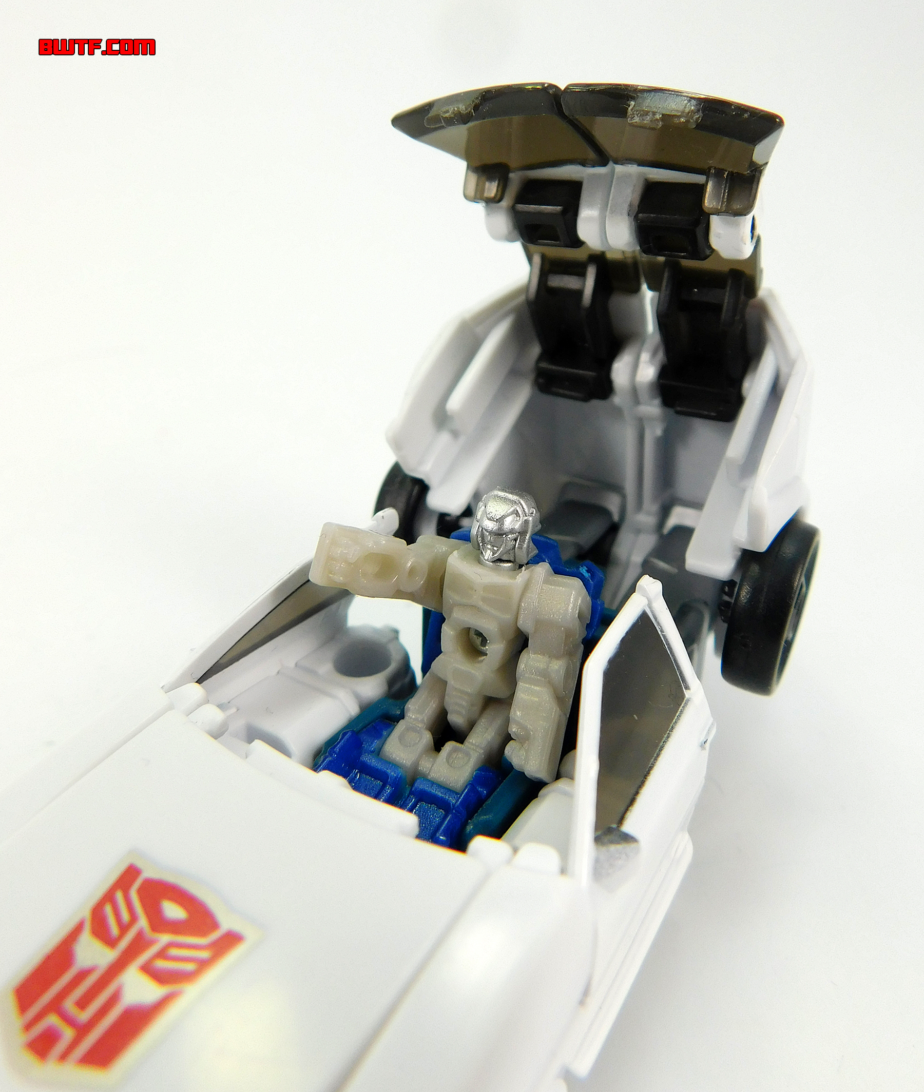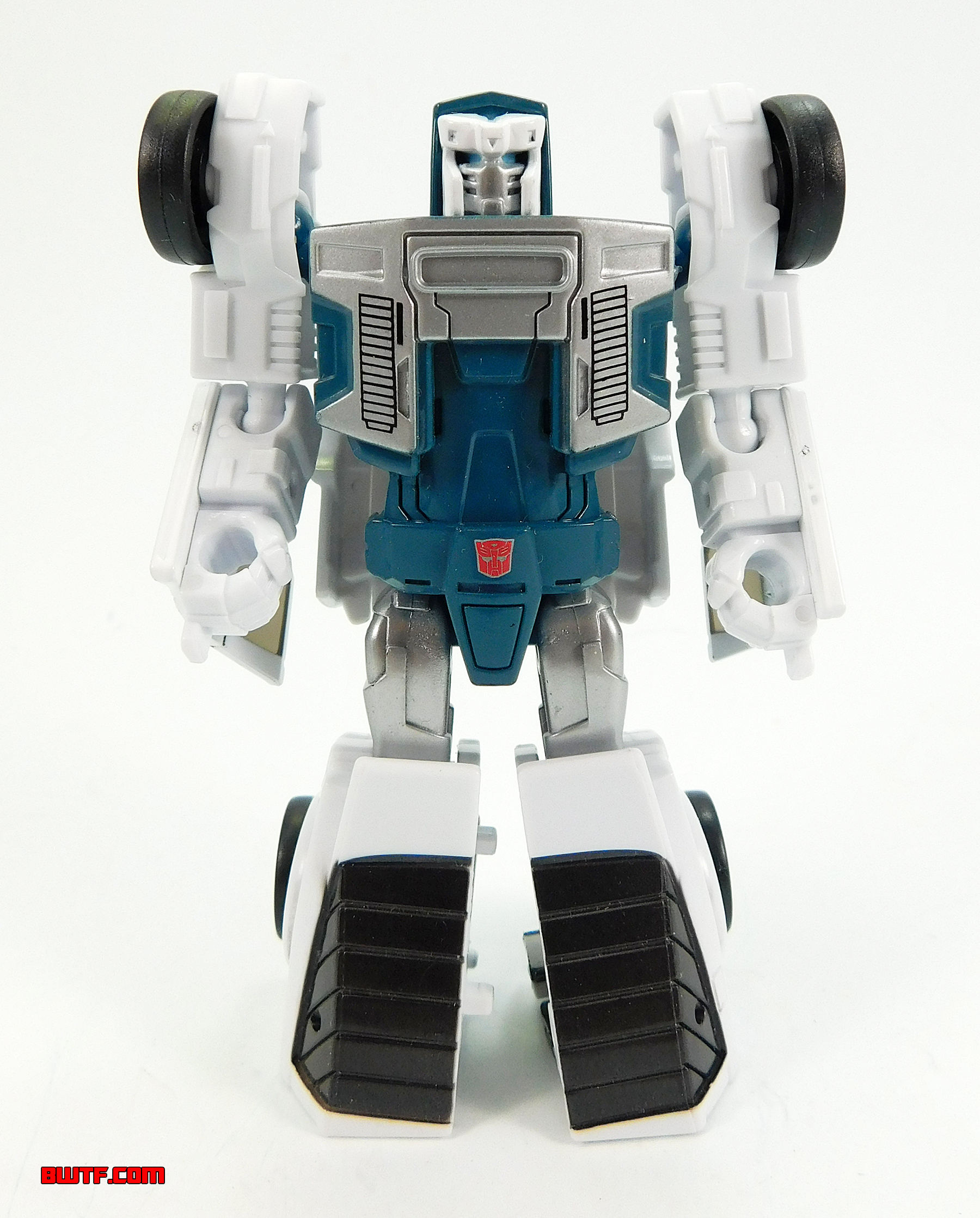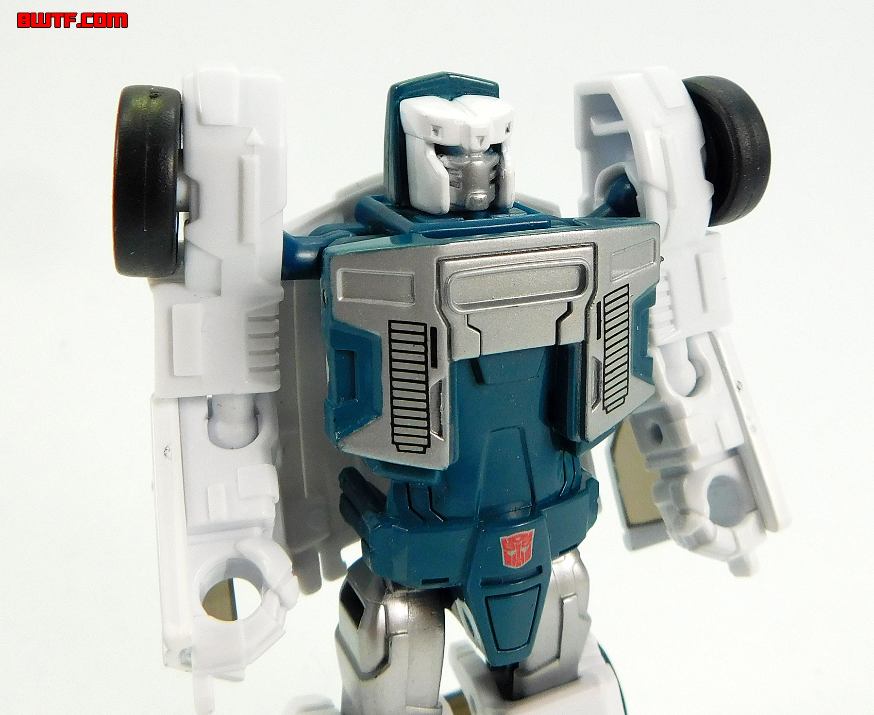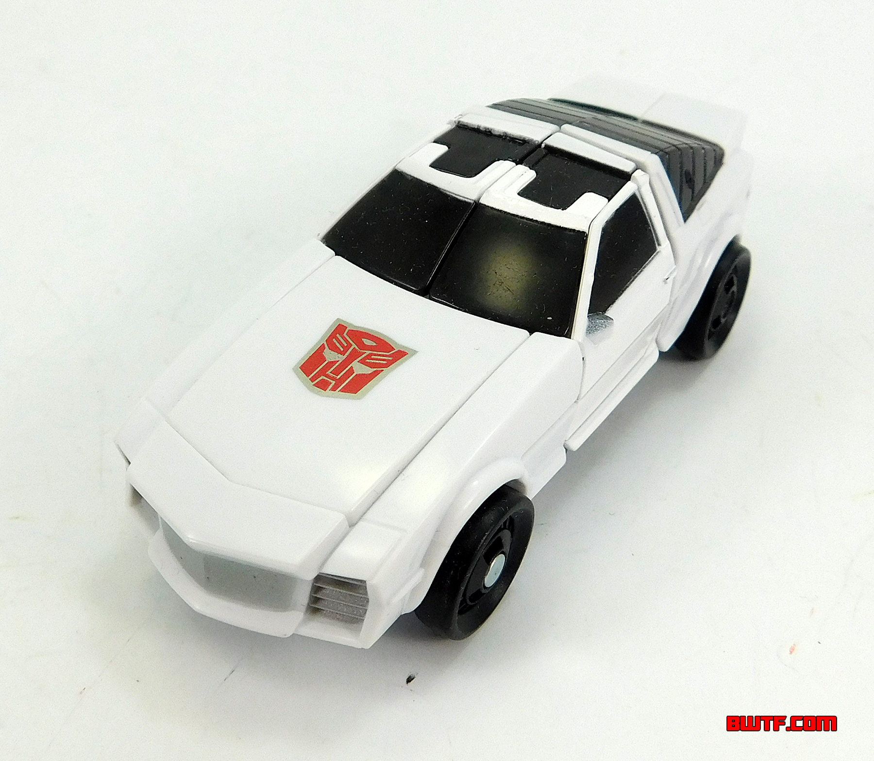 There have been no tooling changes for this mode, so it basically looks like a white and black version of Windcharger's vehicle mode. This jives with how G1 Tailgate looked since he too was a Windcharger redeco. There is silver paint used in the front and black paint used in the back. The hood has a large Autobot symbol on it, calling back to the sticker that was on G1 Tailgate's hood. The deco looks great and is serves as a cool G1 homage.