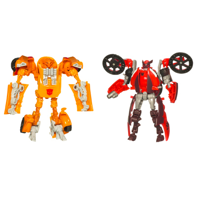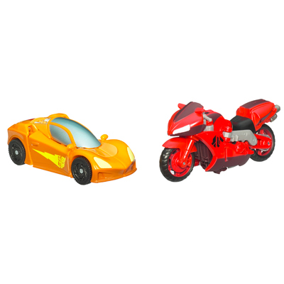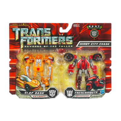 This dueling twosome is ready to fight it out in all-out robot-on-robot battle action! Start the combat with these warriors in robot mode, and then convert your SLAP DASH figure to sports car vehicle mode and your TRENCHMOUTH figure to motorcycle vehicle mode so they can spar on the streets, too. The struggle rages on, but these two have the “drive” to keep fighting, no matter what!