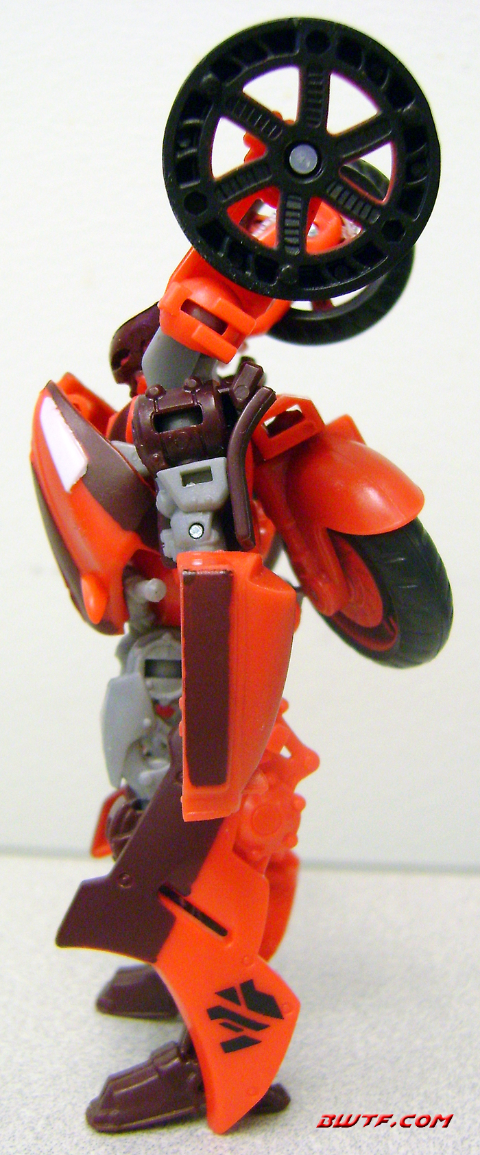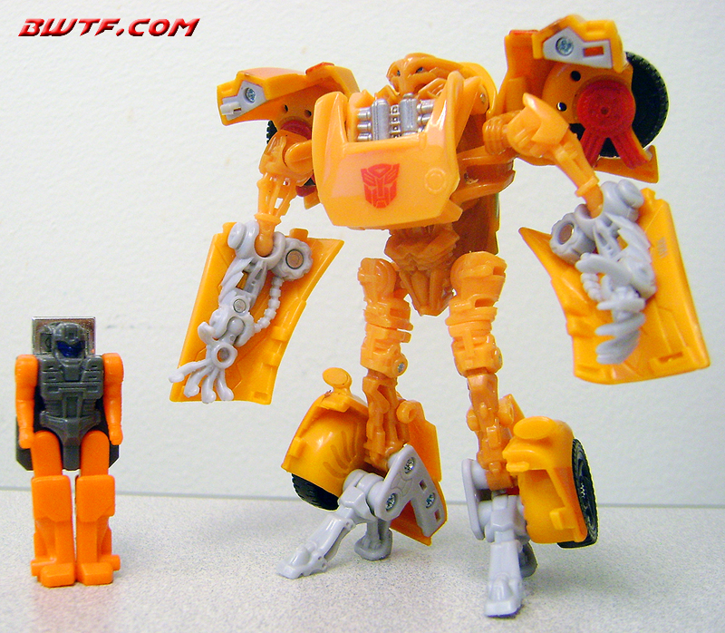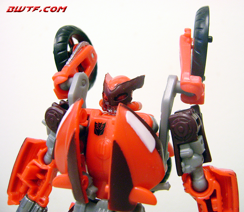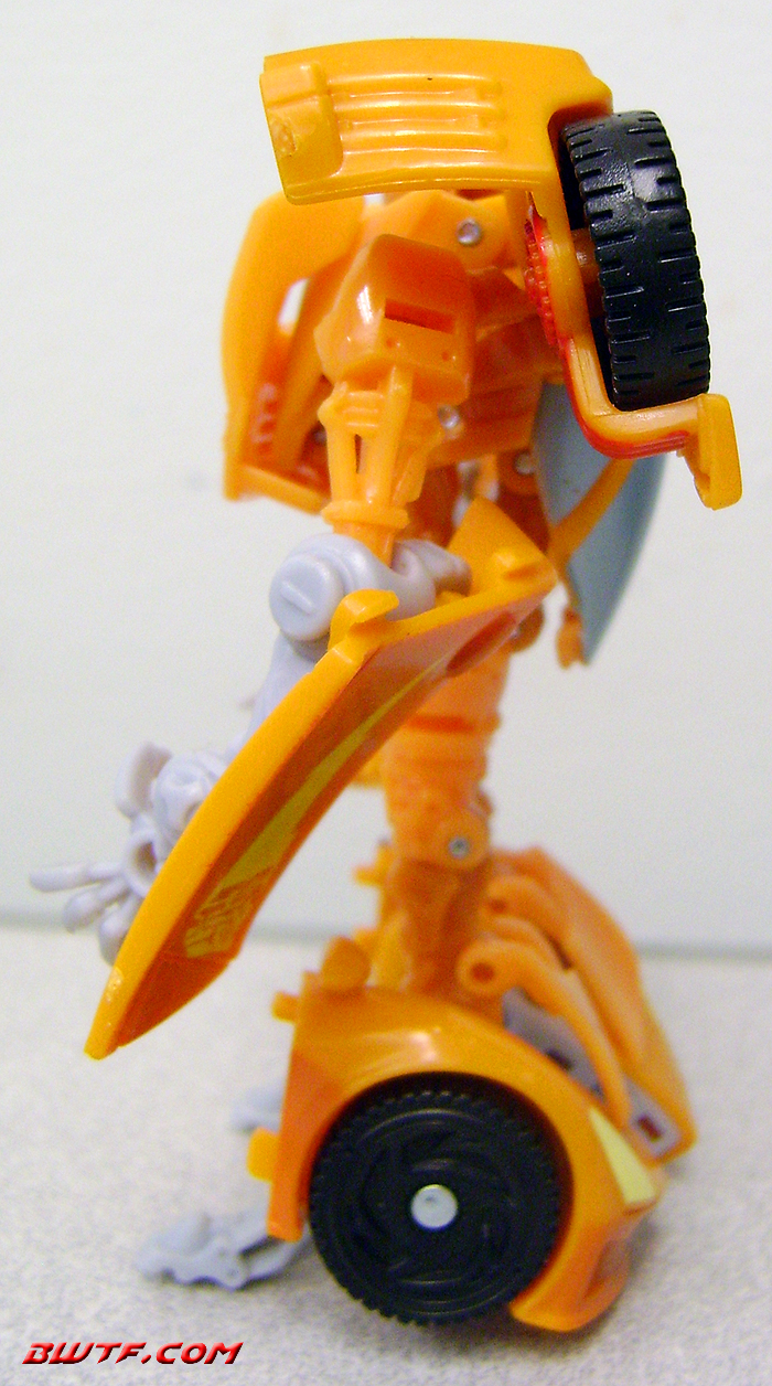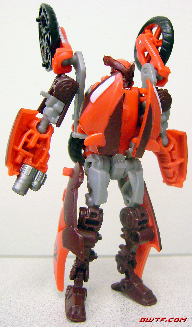 So here's the funny part about me reviewing this figure. When I first got it, I thought "Huh, it's a Wheelie homage." Then I saw it's name as "Slap Dash" and thought "Okay, not a Wheelie homage, maybe Slap Dash from G1". Then I looked at my G1 Slapdash, which is mostly blue, yellow and grey and scratched my head. Taking a look at G1 Slap Dash's partner, Lube, I noticed the Powermaster was mostly orange and dark grey. Still however, that didn't quite match up to this figures' colors. Then I looked at Legends Class Wheelie and I had to relent. For whatever reason, Revenge of the Fallen Slap Dash is a homage to G1 Wheelie. It does make sense that they wouldn't name him Wheele since that name is currently being used by the small Decepticon turned Autobot who appeared in the movie. I was a bit disappointed in this, not because Slap Dash is a homage to Wheelie, but because Slap Dash is a fairly obscure character in Transformers history and it would've been nice to see an updated homage to him (just as Nightbeat was a color appropriate homage to his G1 counterpart). Call him what you will, the toy is still quite distinctive.