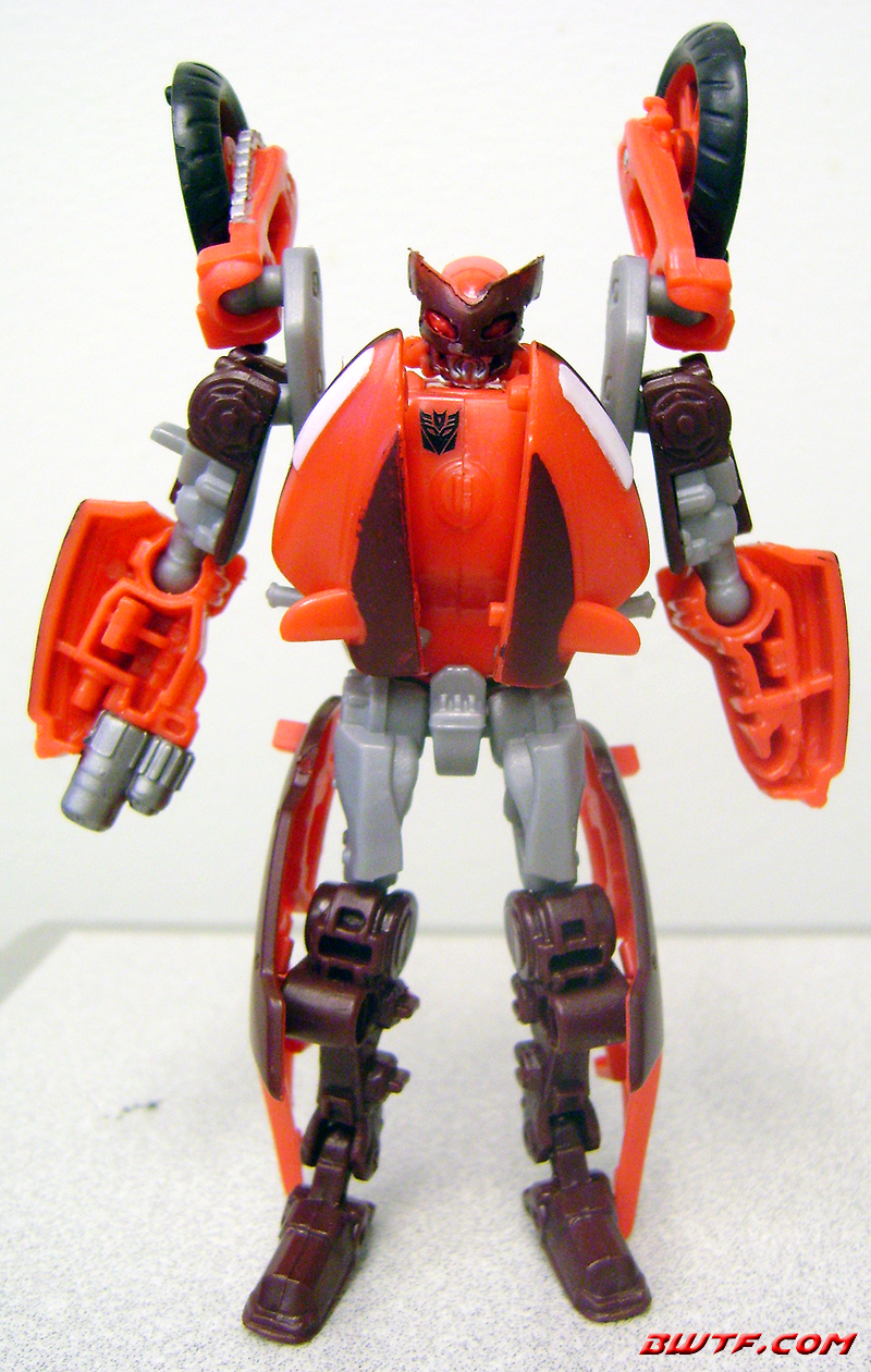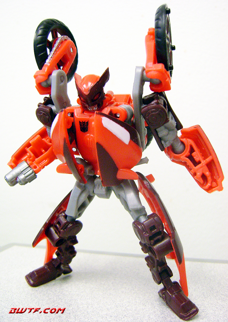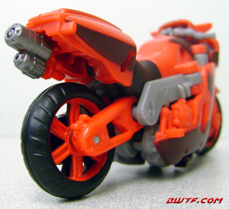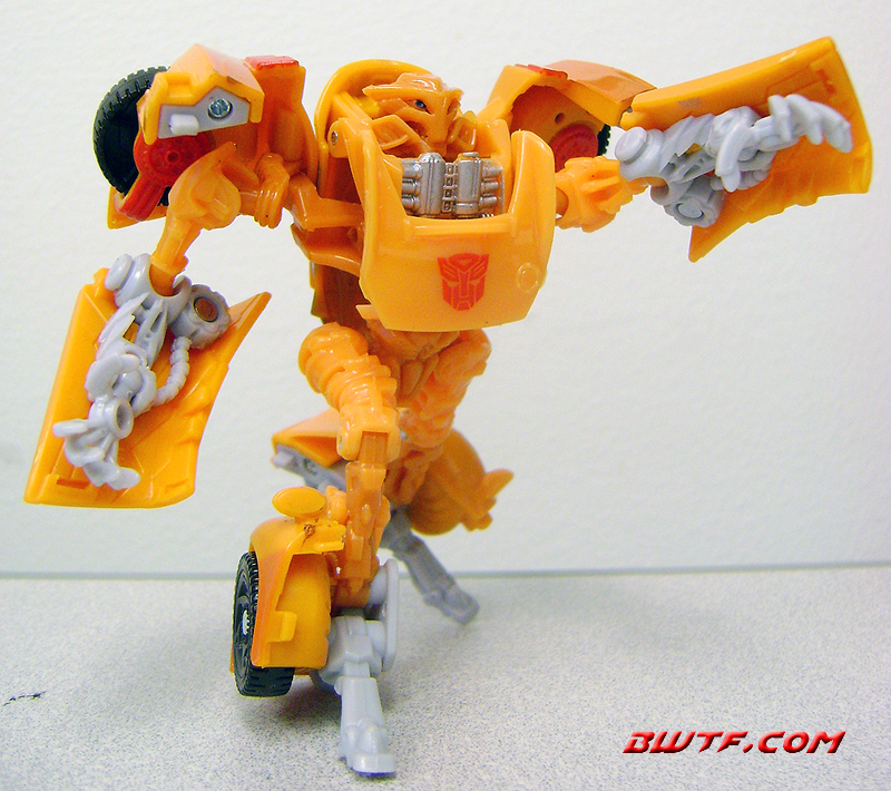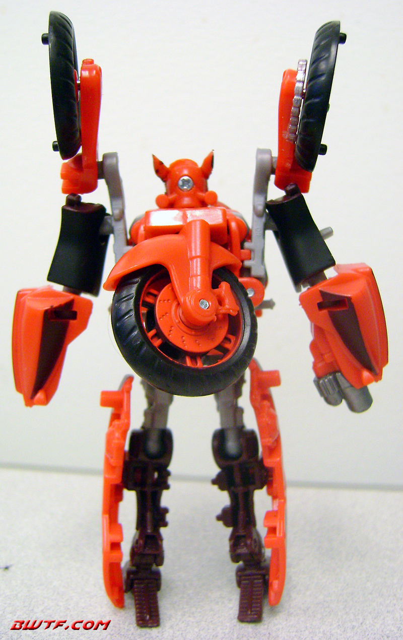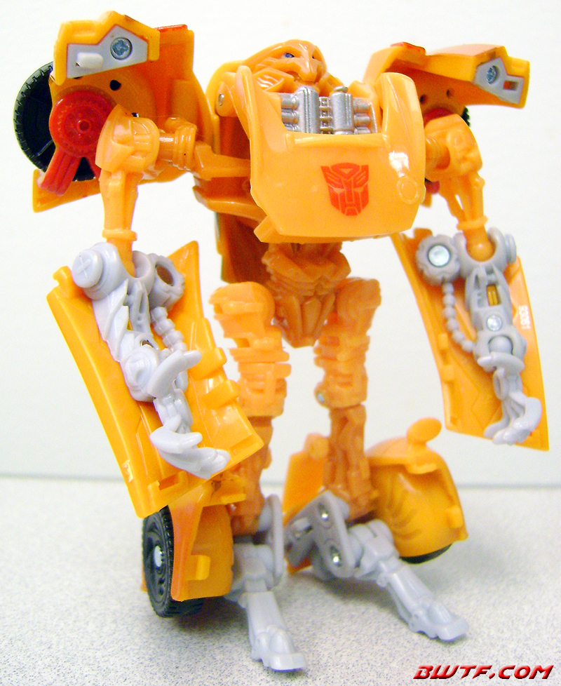 So here's the funny part about me reviewing this figure. When I first got it, I thought "Huh, it's a Wheelie homage." Then I saw it's name as "Slap Dash" and thought "Okay, not a Wheelie homage, maybe Slap Dash from G1". Then I looked at my G1 Slapdash, which is mostly blue, yellow and grey and scratched my head. Taking a look at G1 Slap Dash's partner, Lube, I noticed the Powermaster was mostly orange and dark grey. Still however, that didn't quite match up to this figures' colors. Then I looked at Legends Class Wheelie and I had to relent. For whatever reason, Revenge of the Fallen Slap Dash is a homage to G1 Wheelie. It does make sense that they wouldn't name him Wheele since that name is currently being used by the small Decepticon turned Autobot who appeared in the movie. I was a bit disappointed in this, not because Slap Dash is a homage to Wheelie, but because Slap Dash is a fairly obscure character in Transformers history and it would've been nice to see an updated homage to him (just as Nightbeat was a color appropriate homage to his G1 counterpart). Call him what you will, the toy is still quite distinctive.