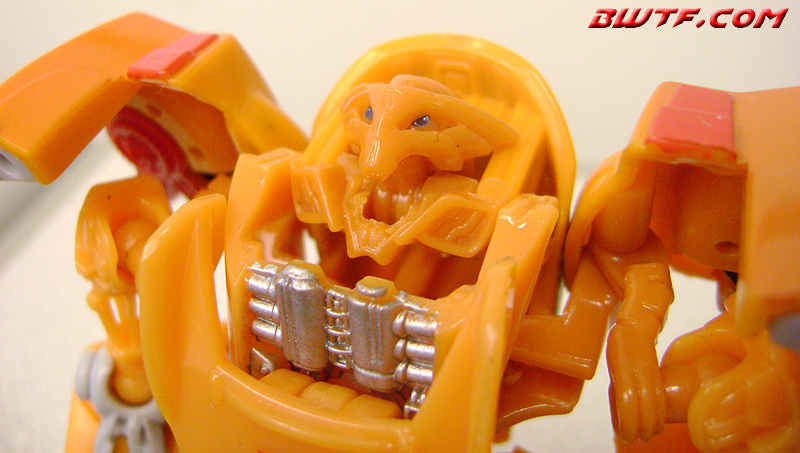 Paint applications are done up in dark orange, black, red and silver. The colors are used sparingly, but effectively. Dark orange covers the top of his shoulder armor, matching up with the darker orange plastic on his head and lower legs. Silver is found on the chest, where the engine parts stick out in the middle. A tiny bit of black is used for the pupils of his eyes and lastly red is used for a medium sized Autobot symbol right on the center of his chest. It's a distinctive color scheme that is immediately identifiable as based on a previous character, and it looks good to boot, with the grey contrasting nicely against the orange - and that is the strength of this redeco. It is both a homage and very far removed from its predecessors.